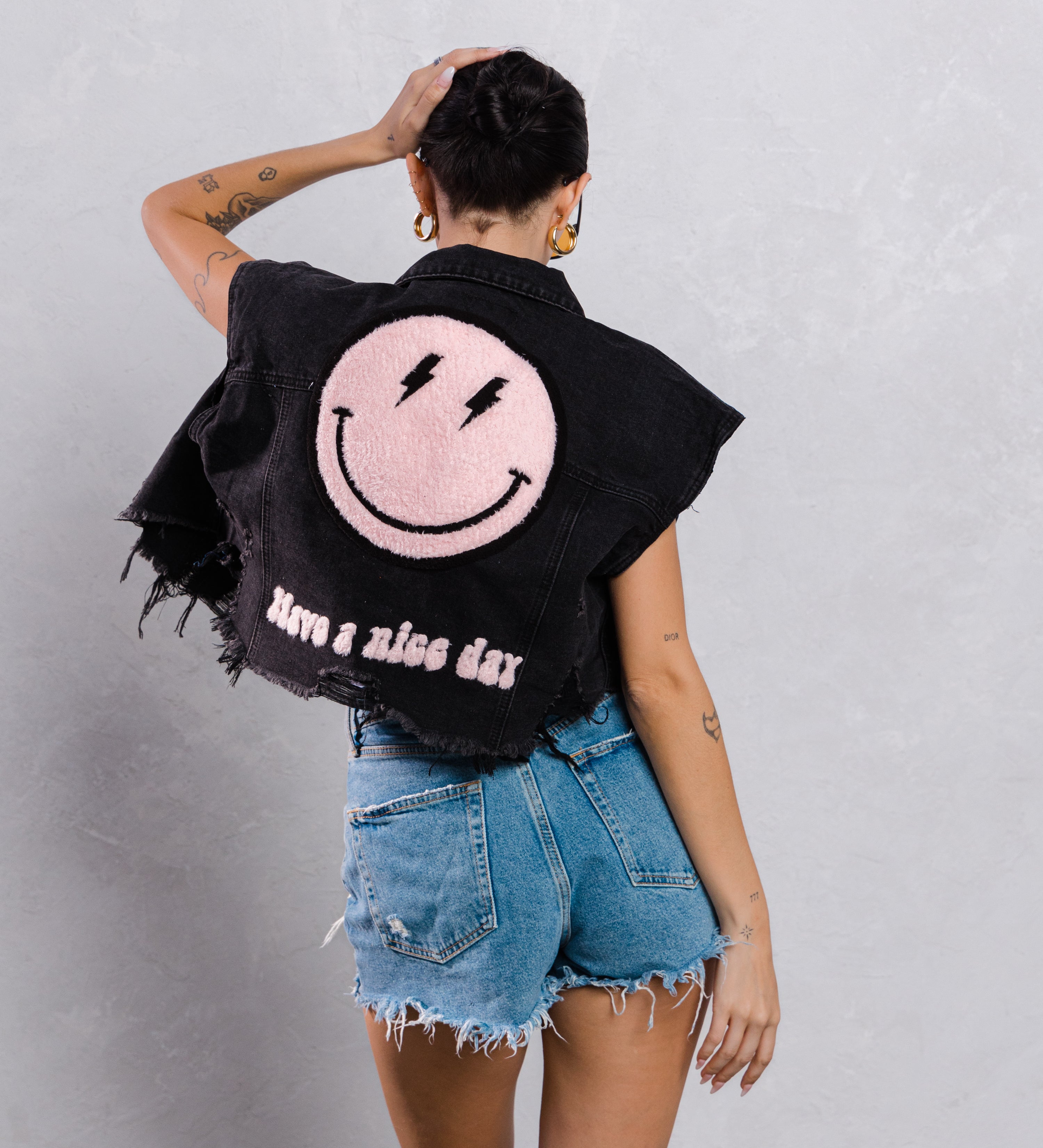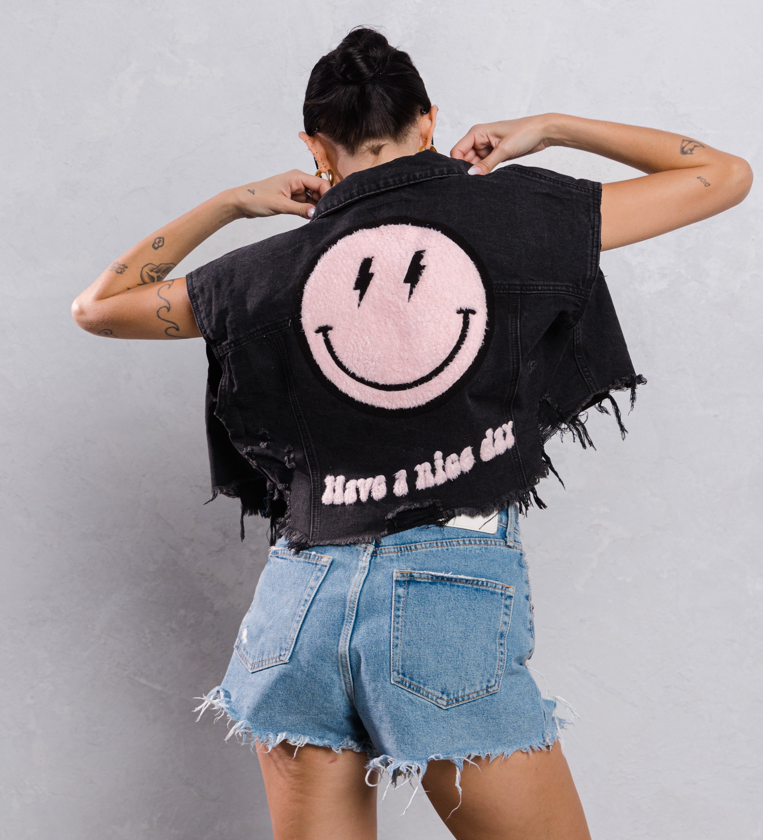 HAVE A NICE DAY pink smiley Crop Denim Vest