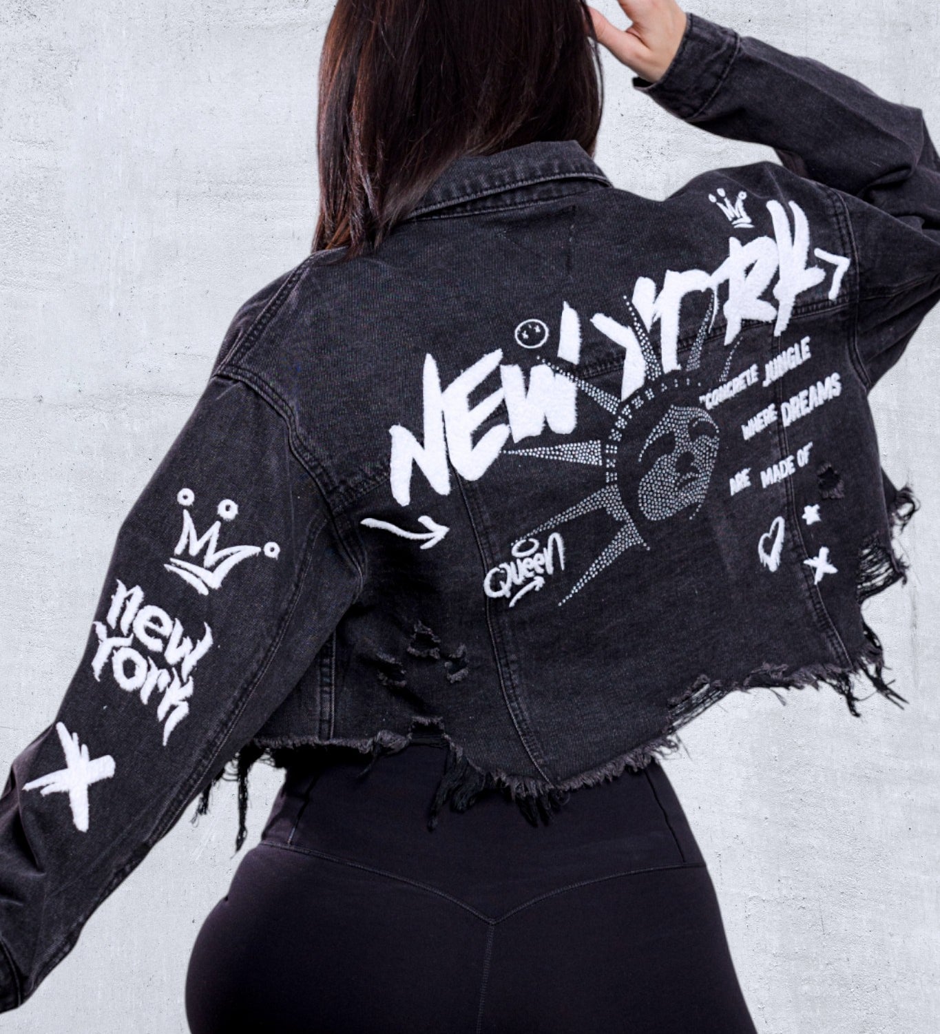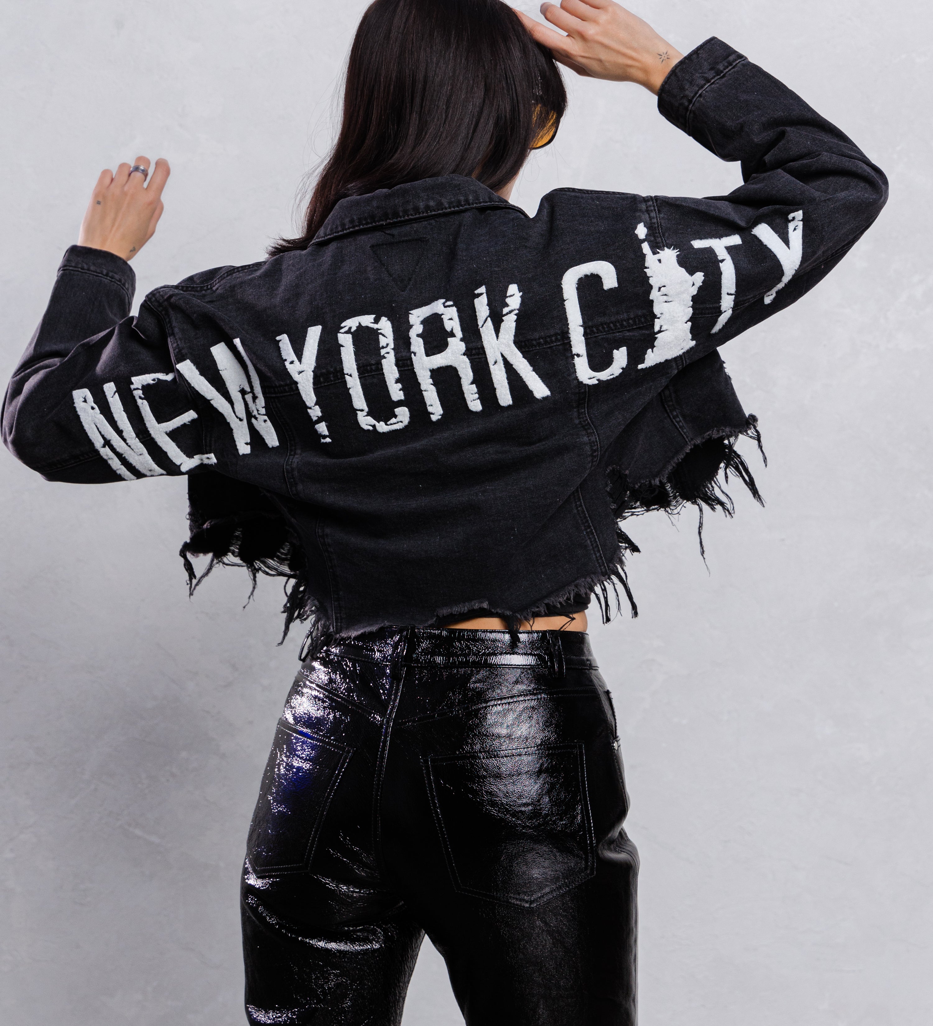 NEW YORK CITY distressed font Crop Denim Jacket