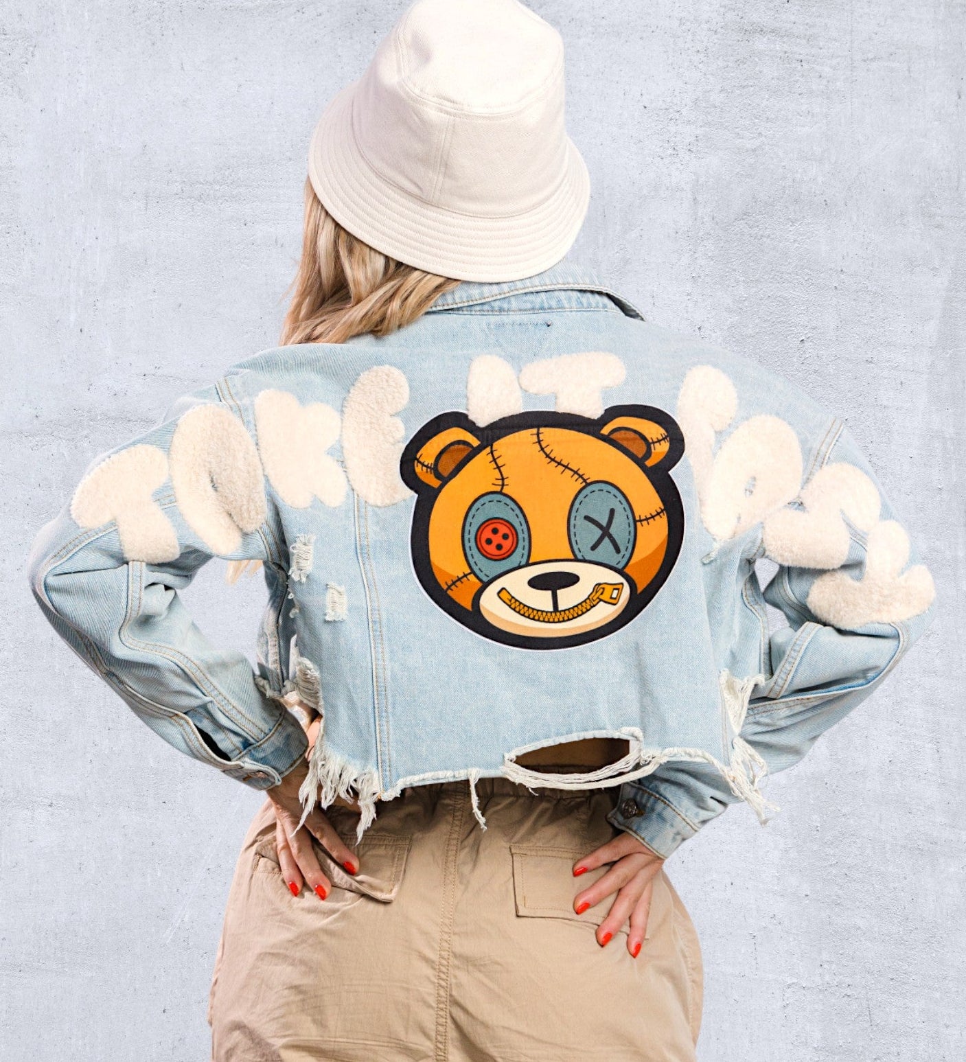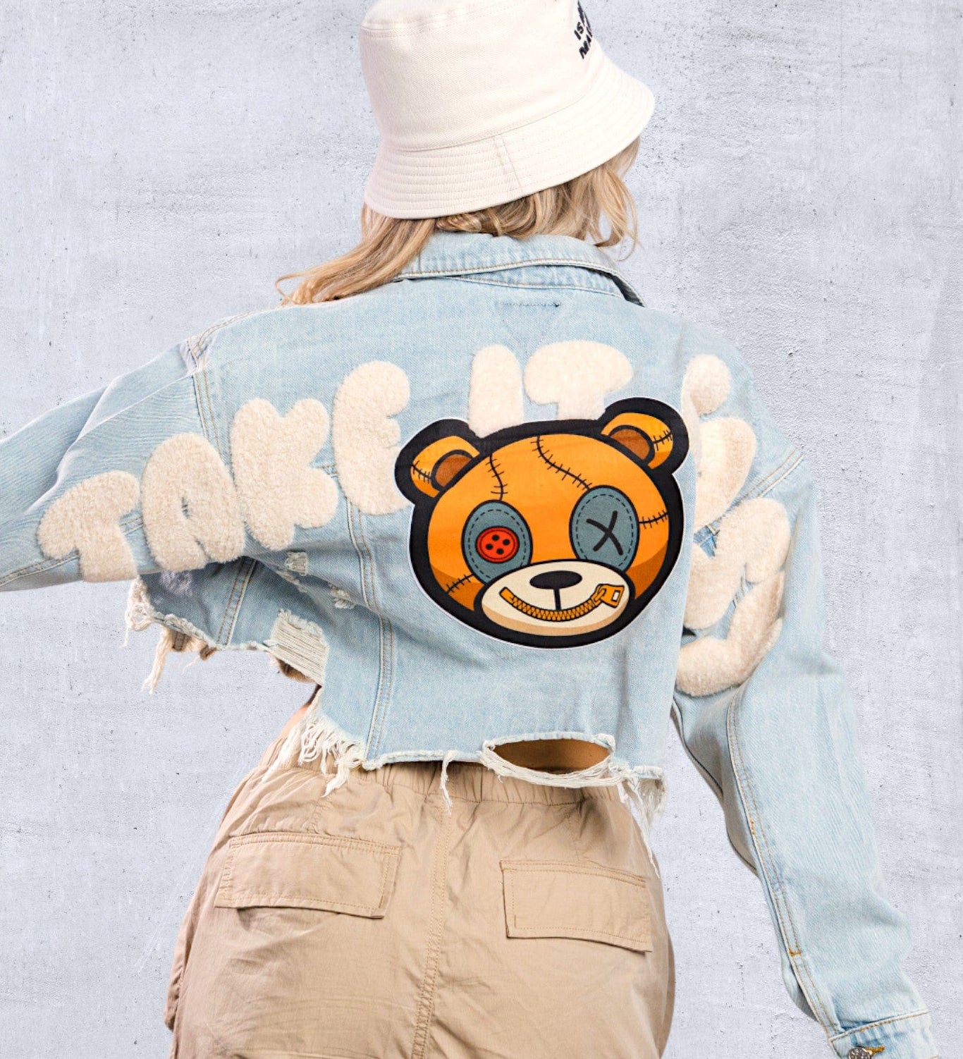 TAKE IT EASY teddy bear Crop Denim Jacket