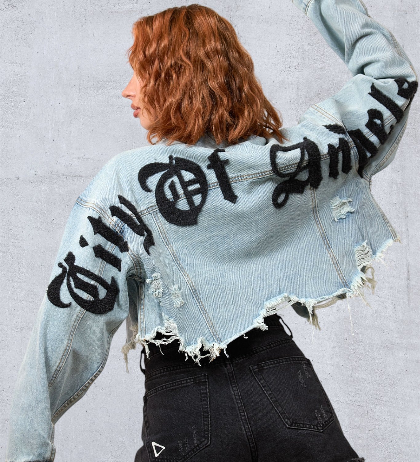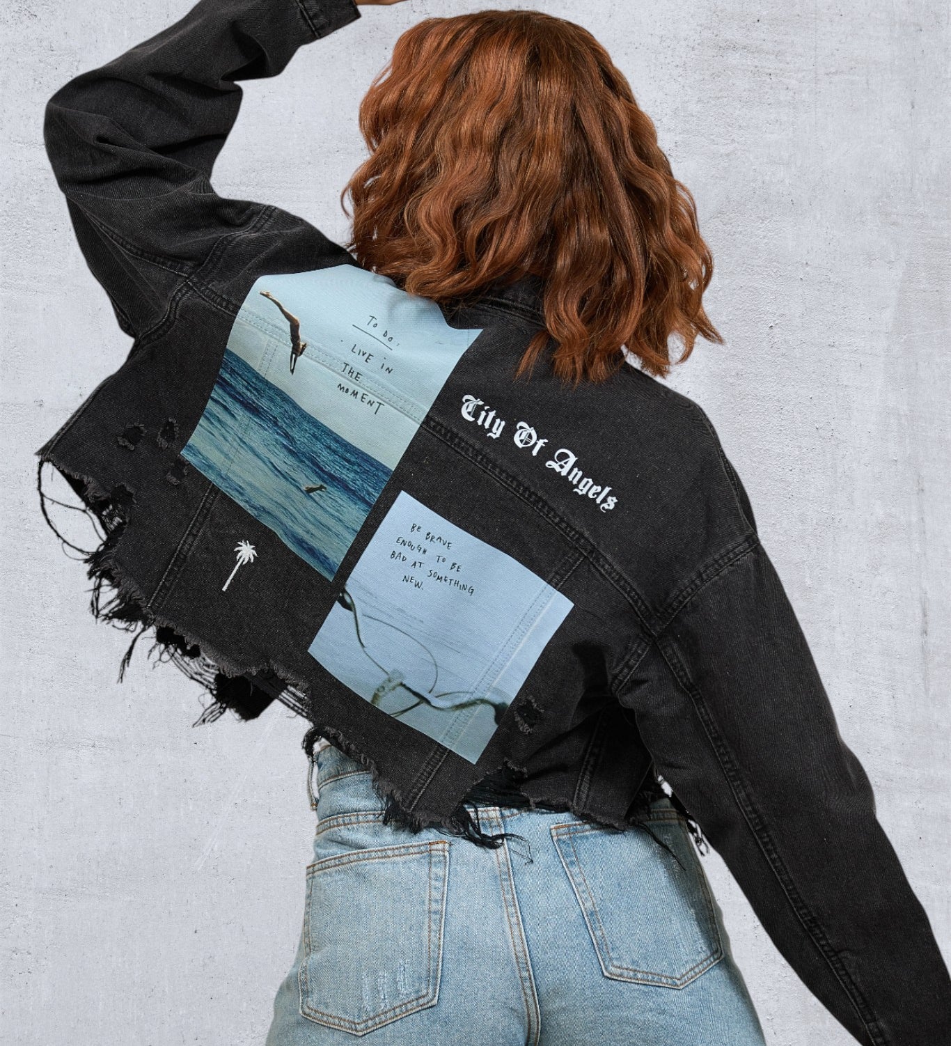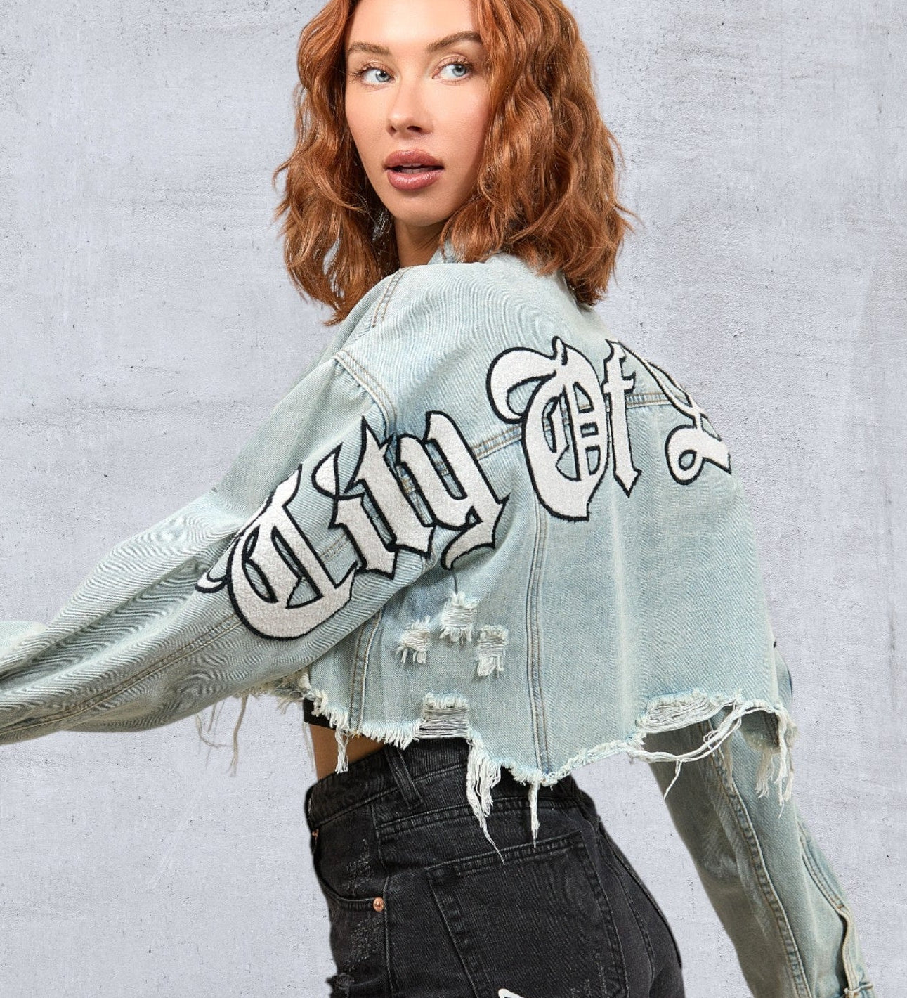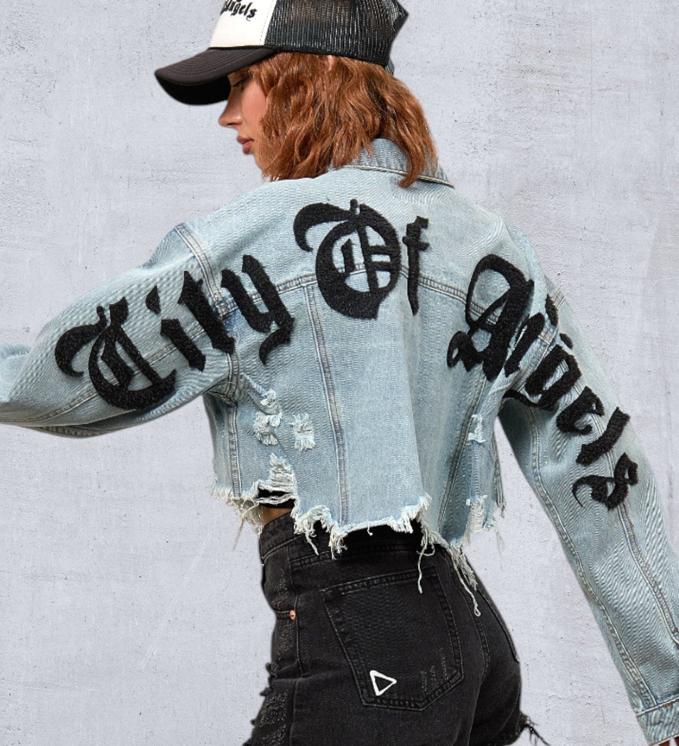 CITY OF ANGELS Black Font Women Cropped Denim Jacket