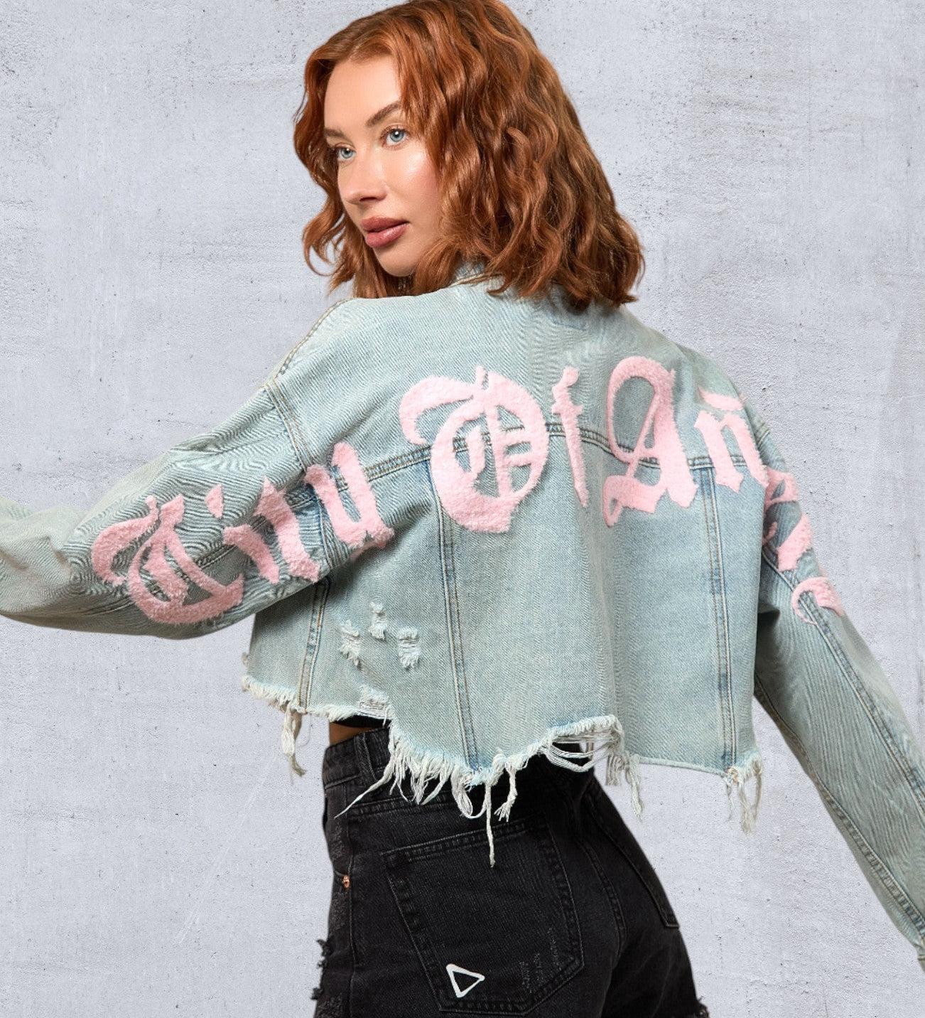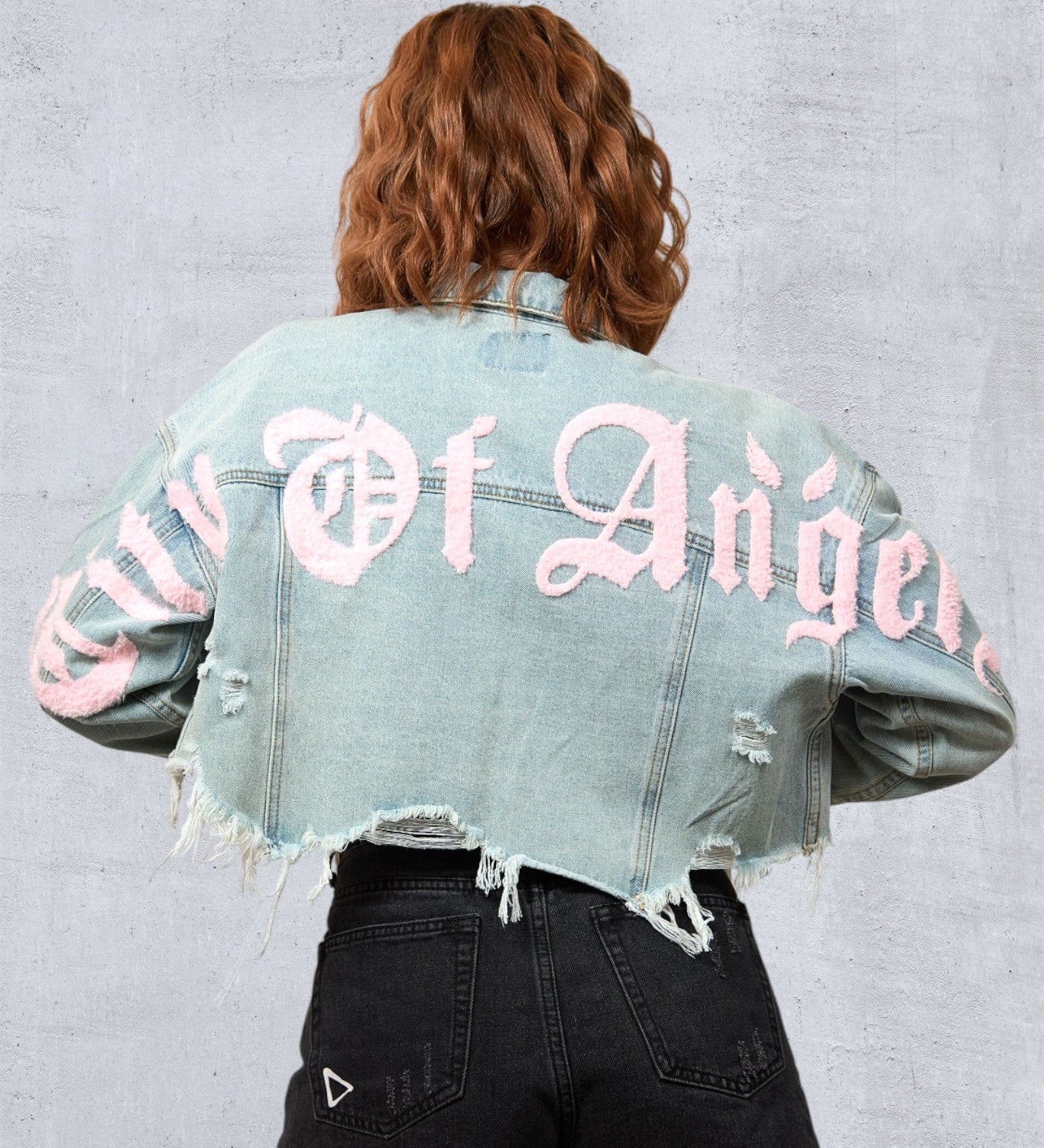 CITY OF ANGELS Pink font Women Cropped Denim Jacket