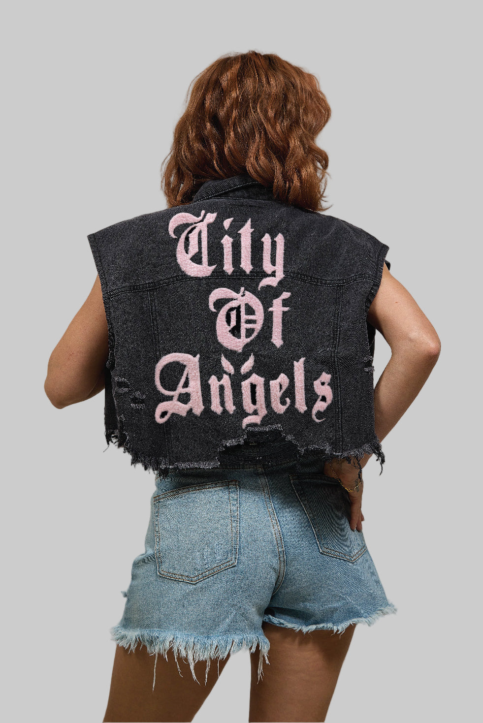 CITY OF ANGELS (PINK FONT) Crop Denim Vest Jacket