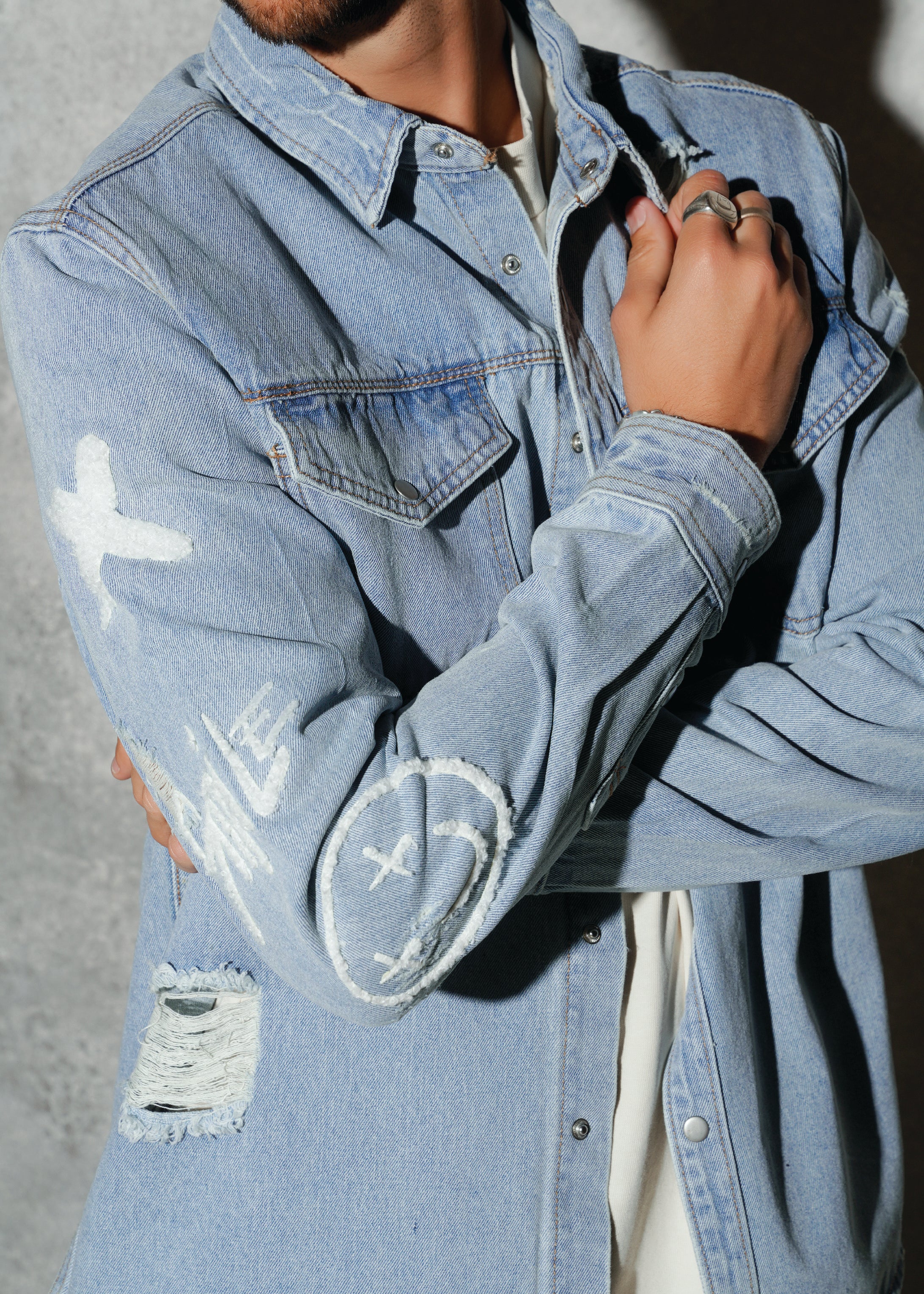 Long Distressed Denim Jacket, crafted distressed hemline,