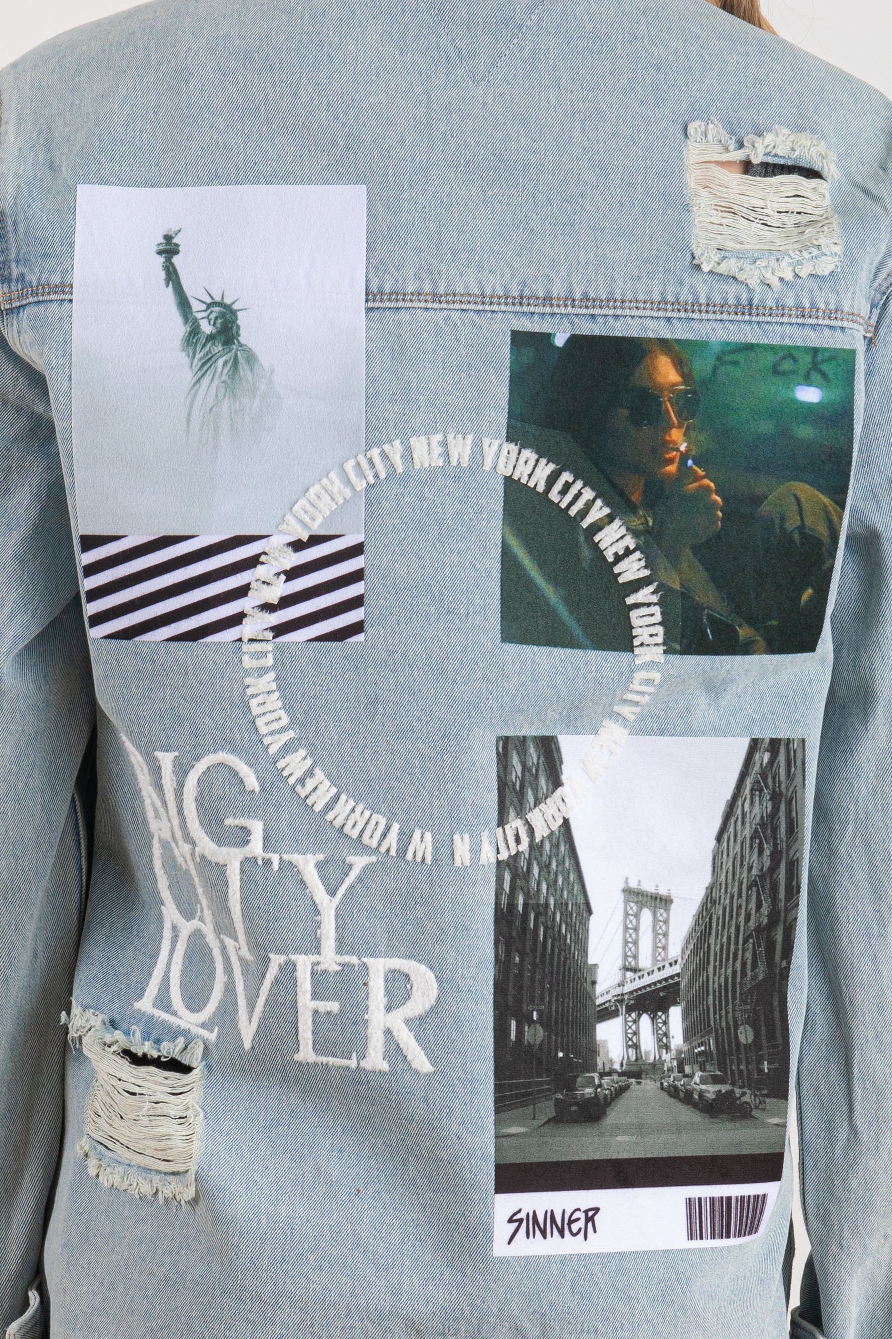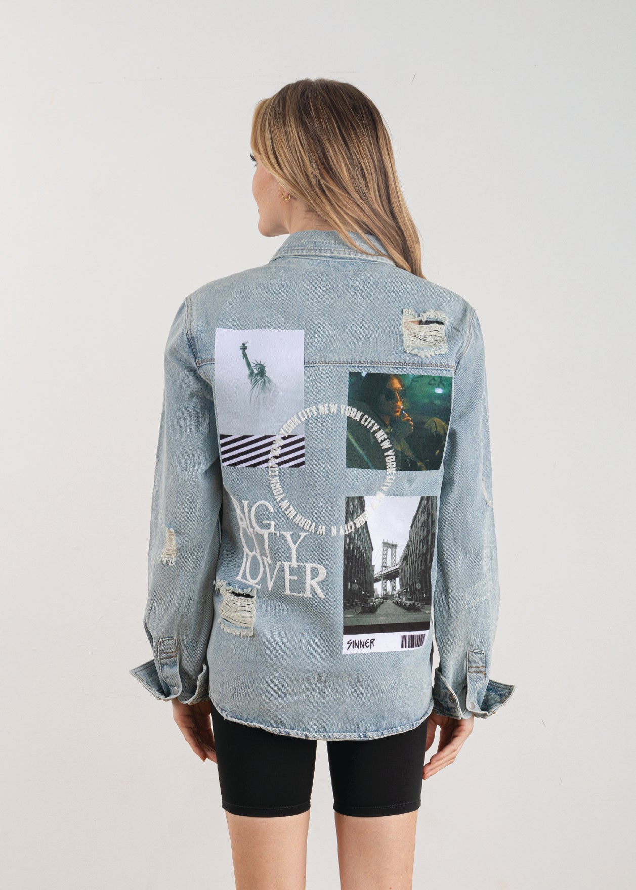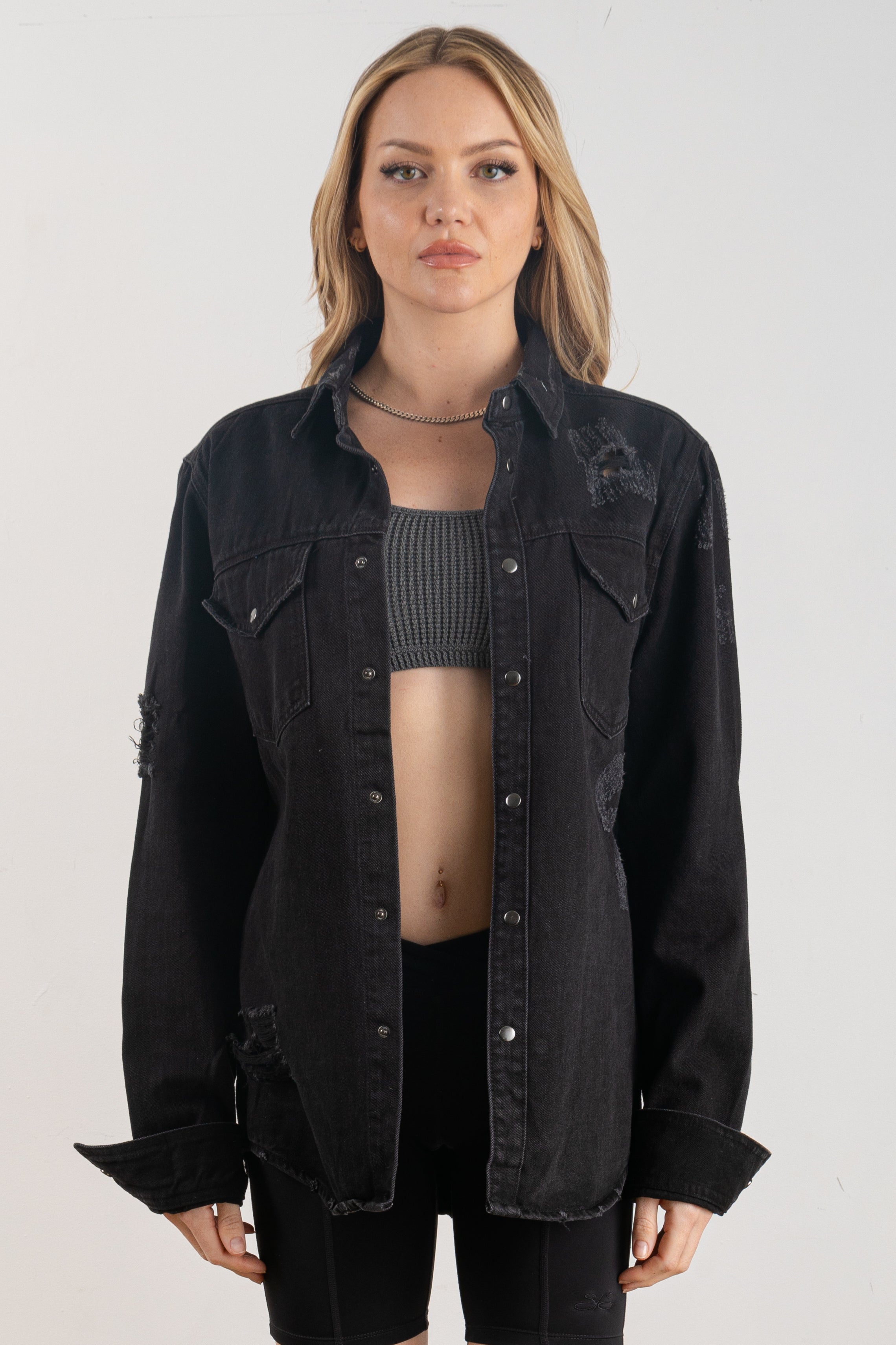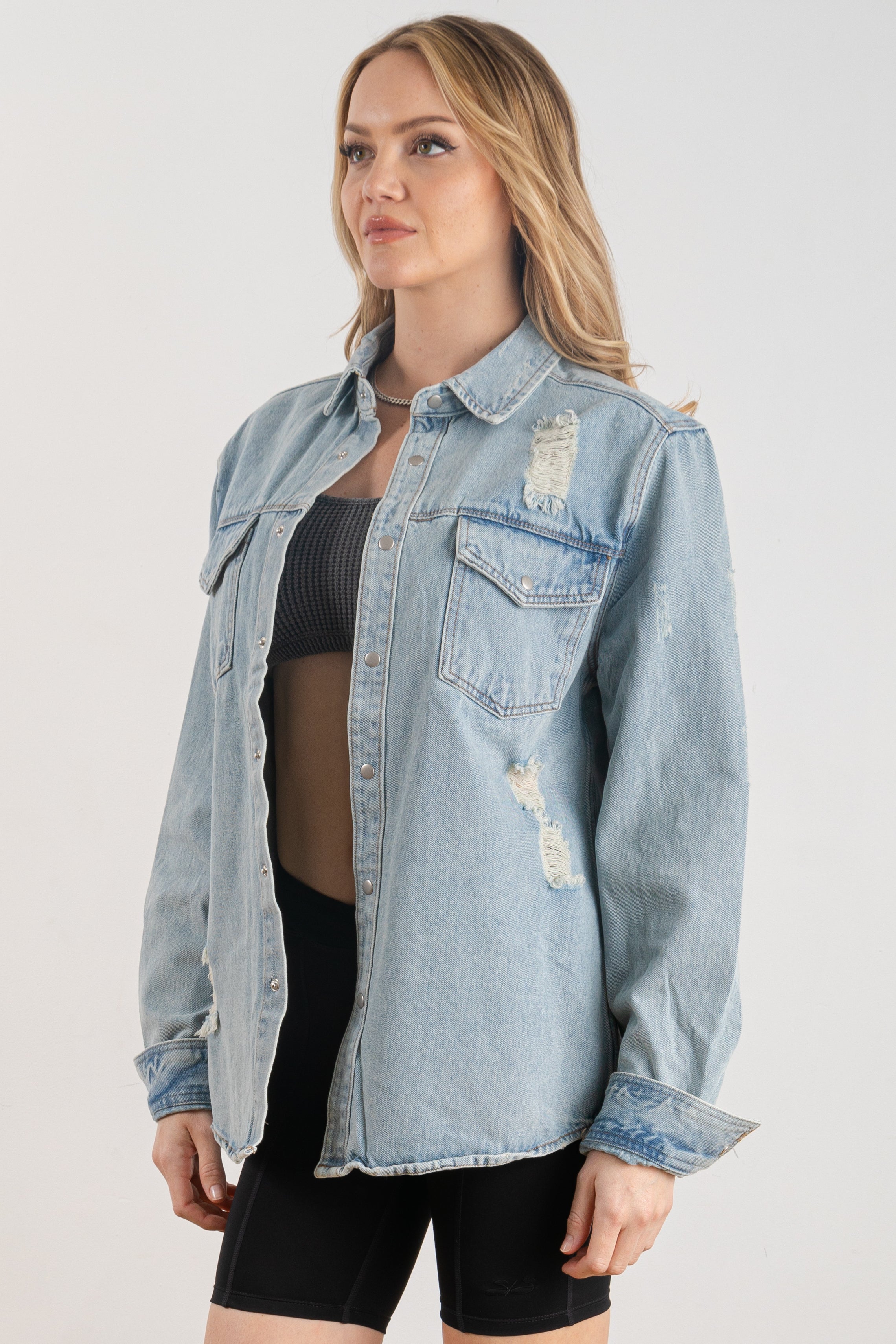 Long Distressed Denim Jacket, crafted distressed hemline,