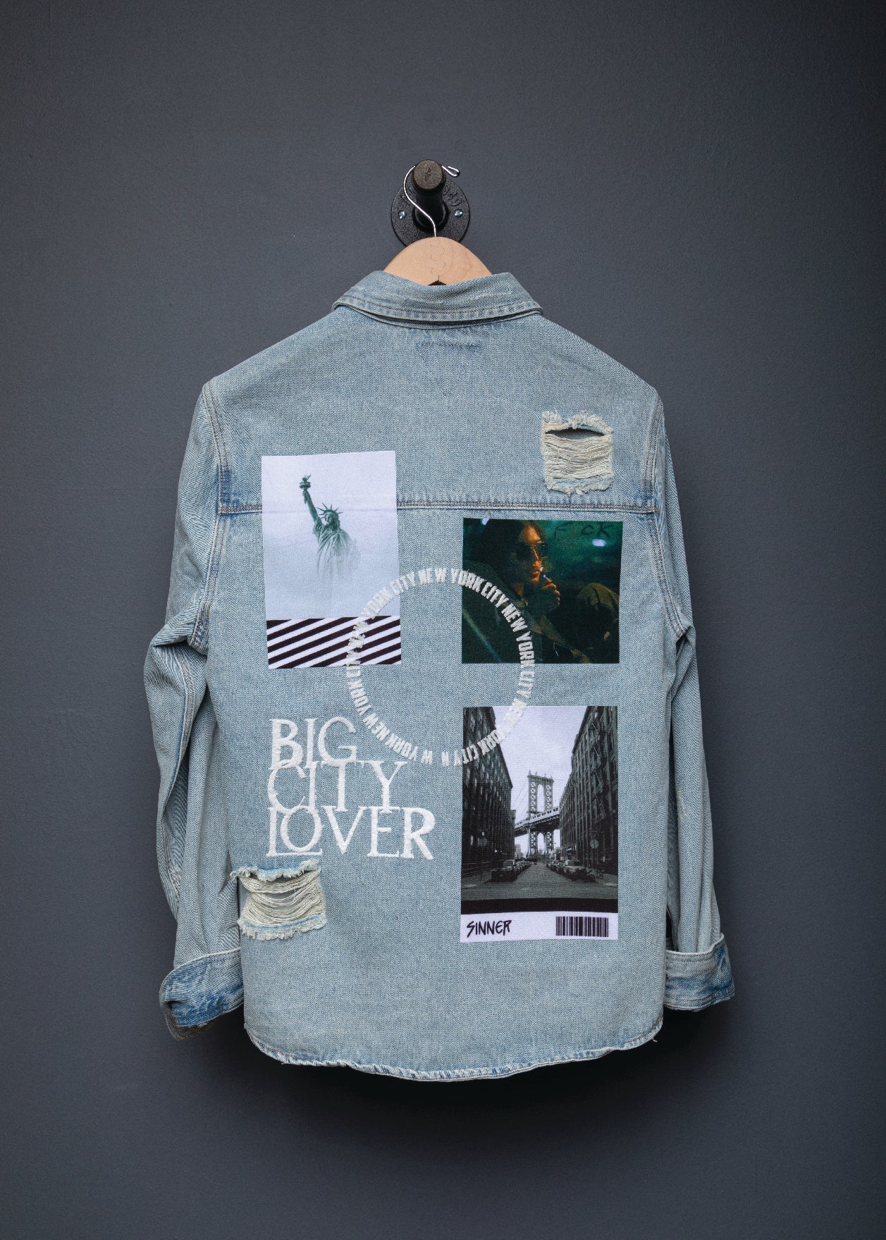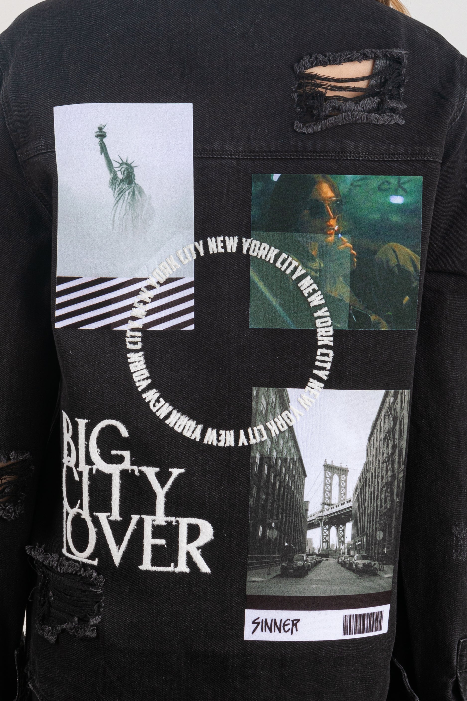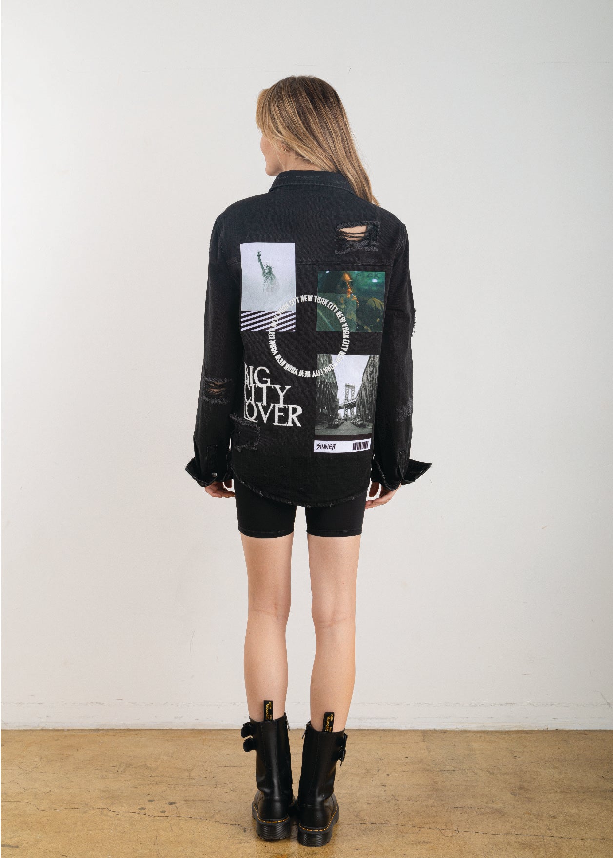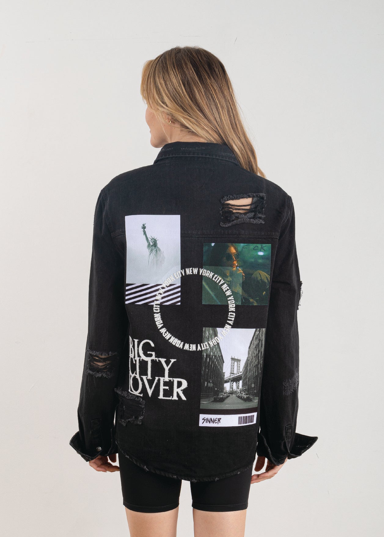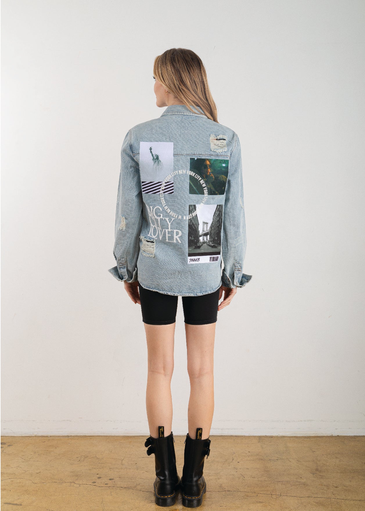 Long Distressed Denim Jacket, crafted distressed hemline,
