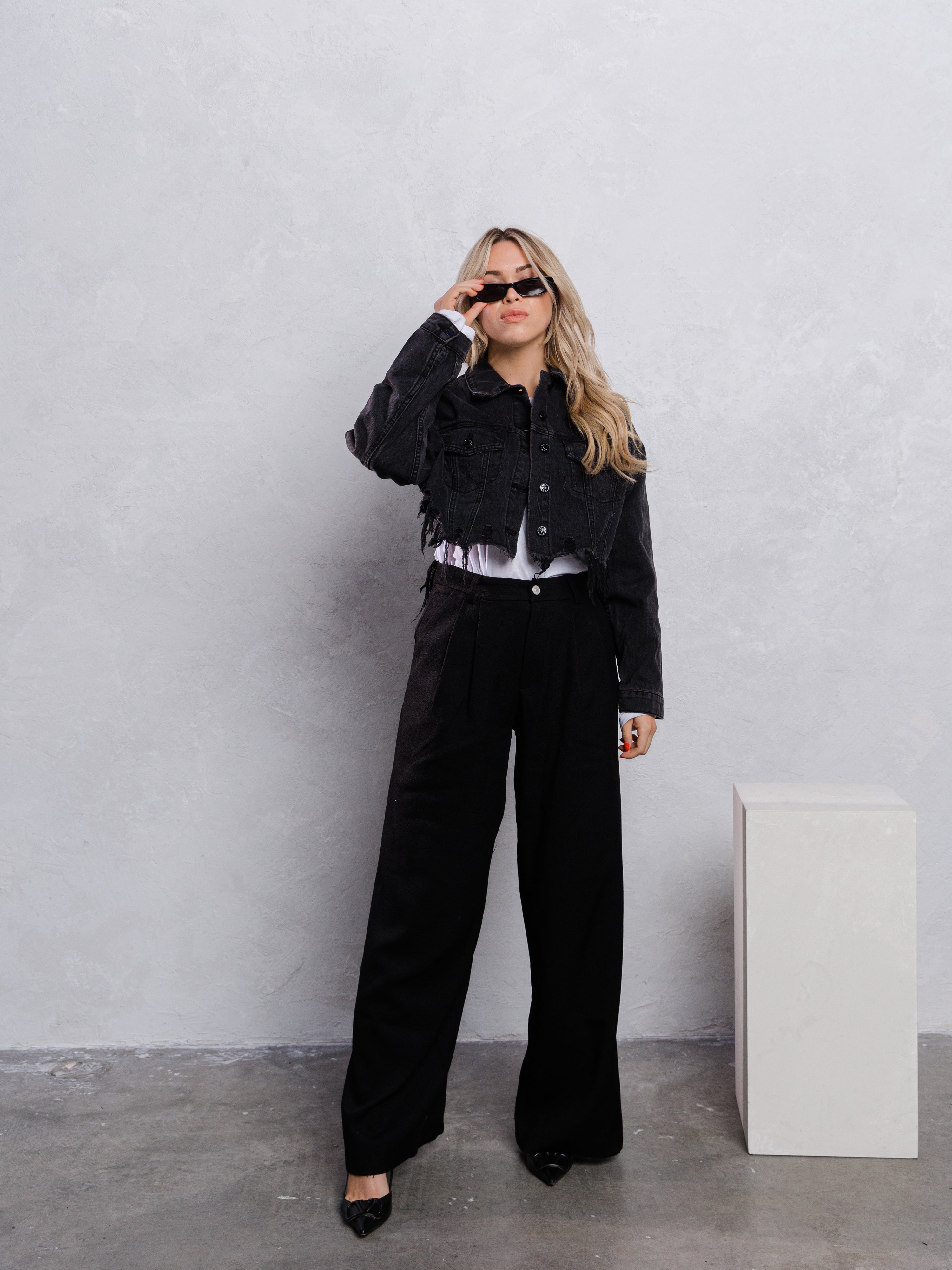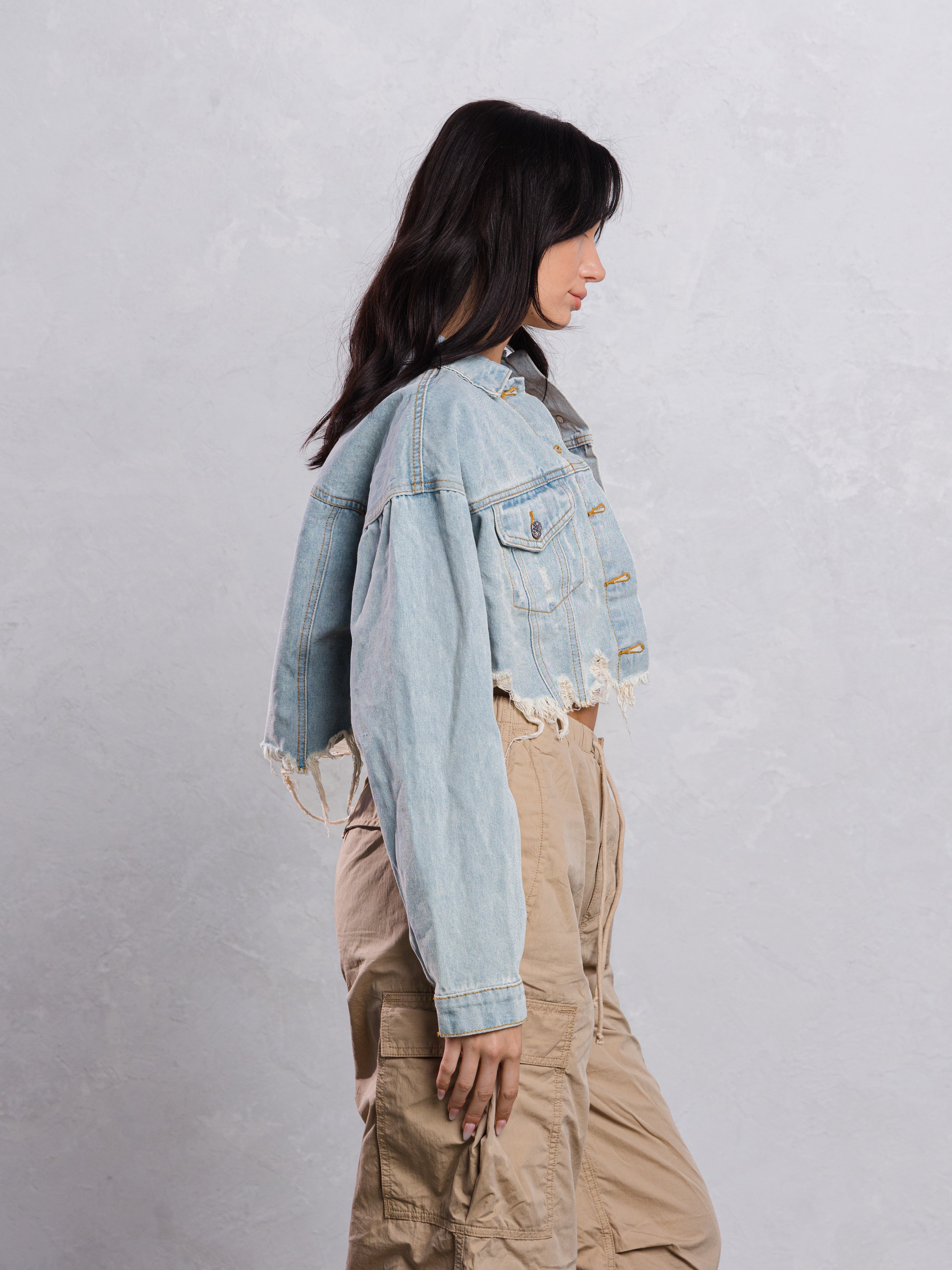 Cropped Distressed Denim Jacket, crafted distressed hemline,