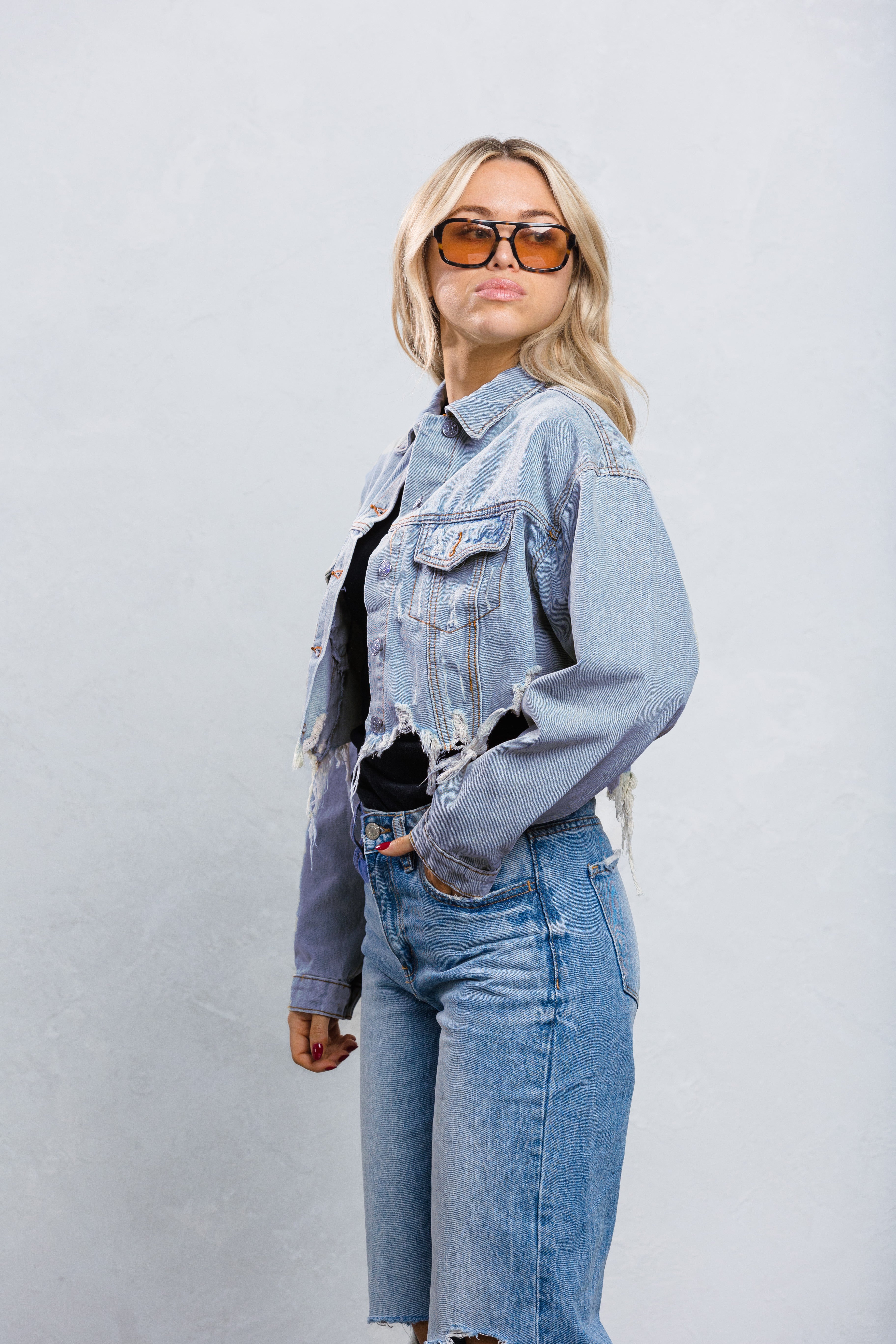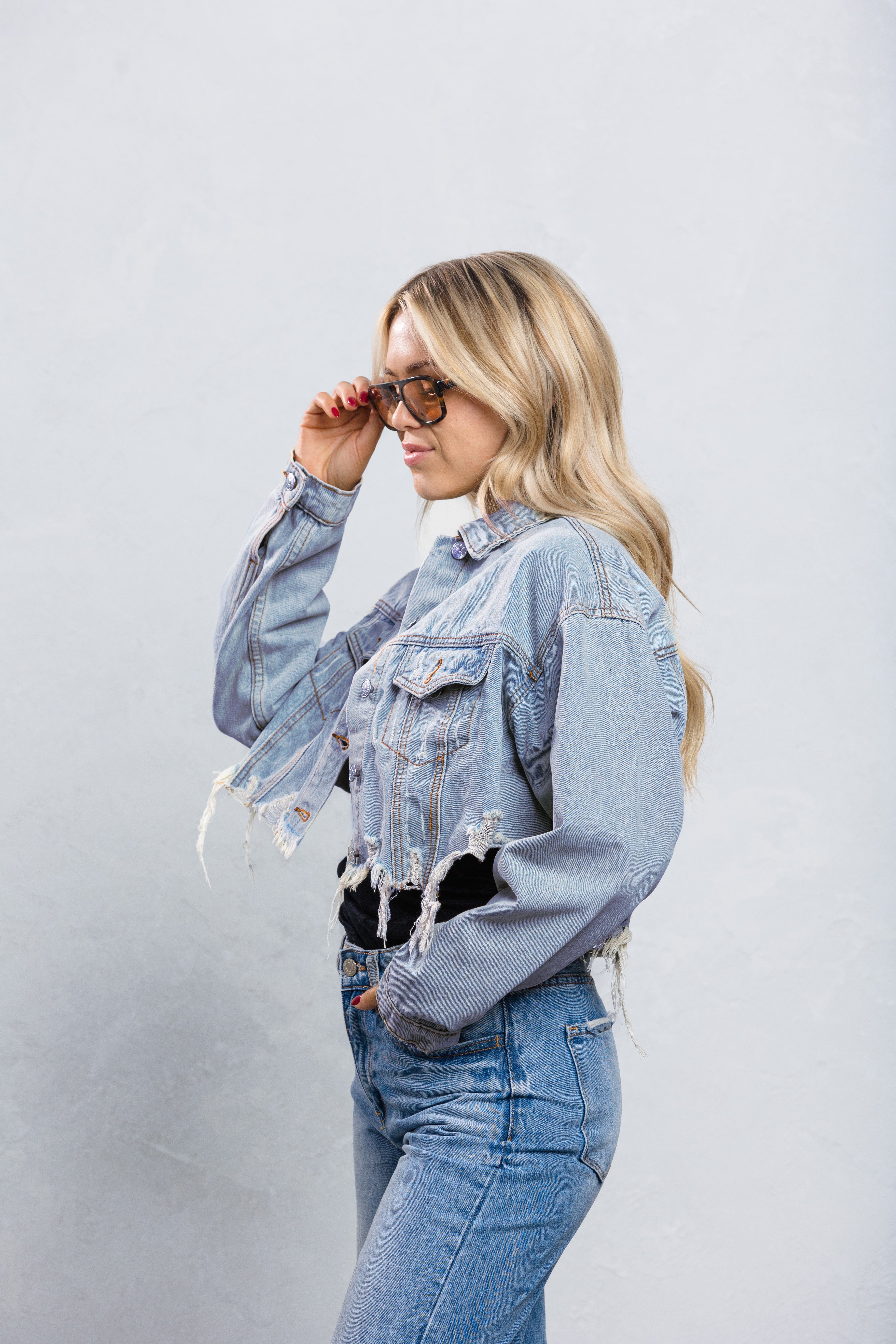 Cropped Distressed Denim Jacket, crafted distressed hemline,