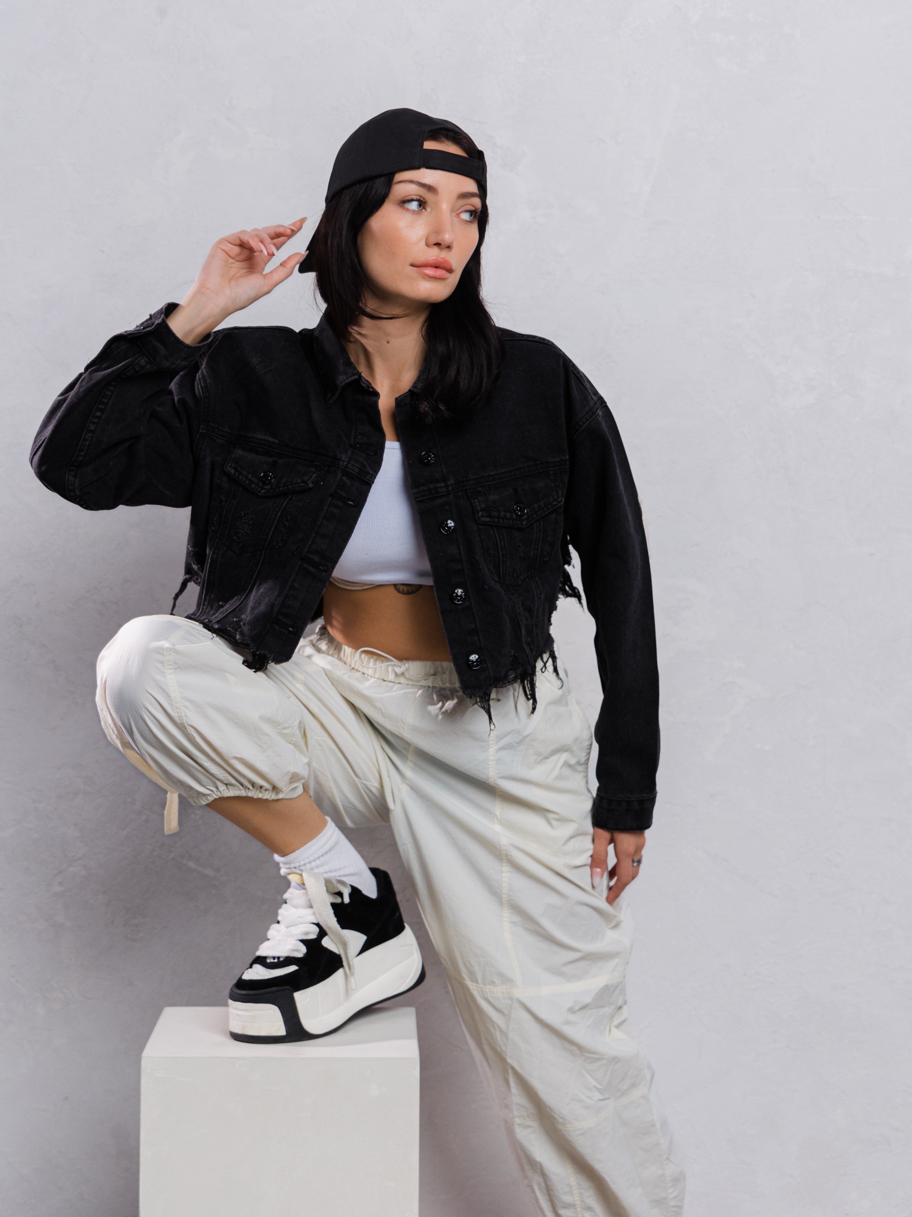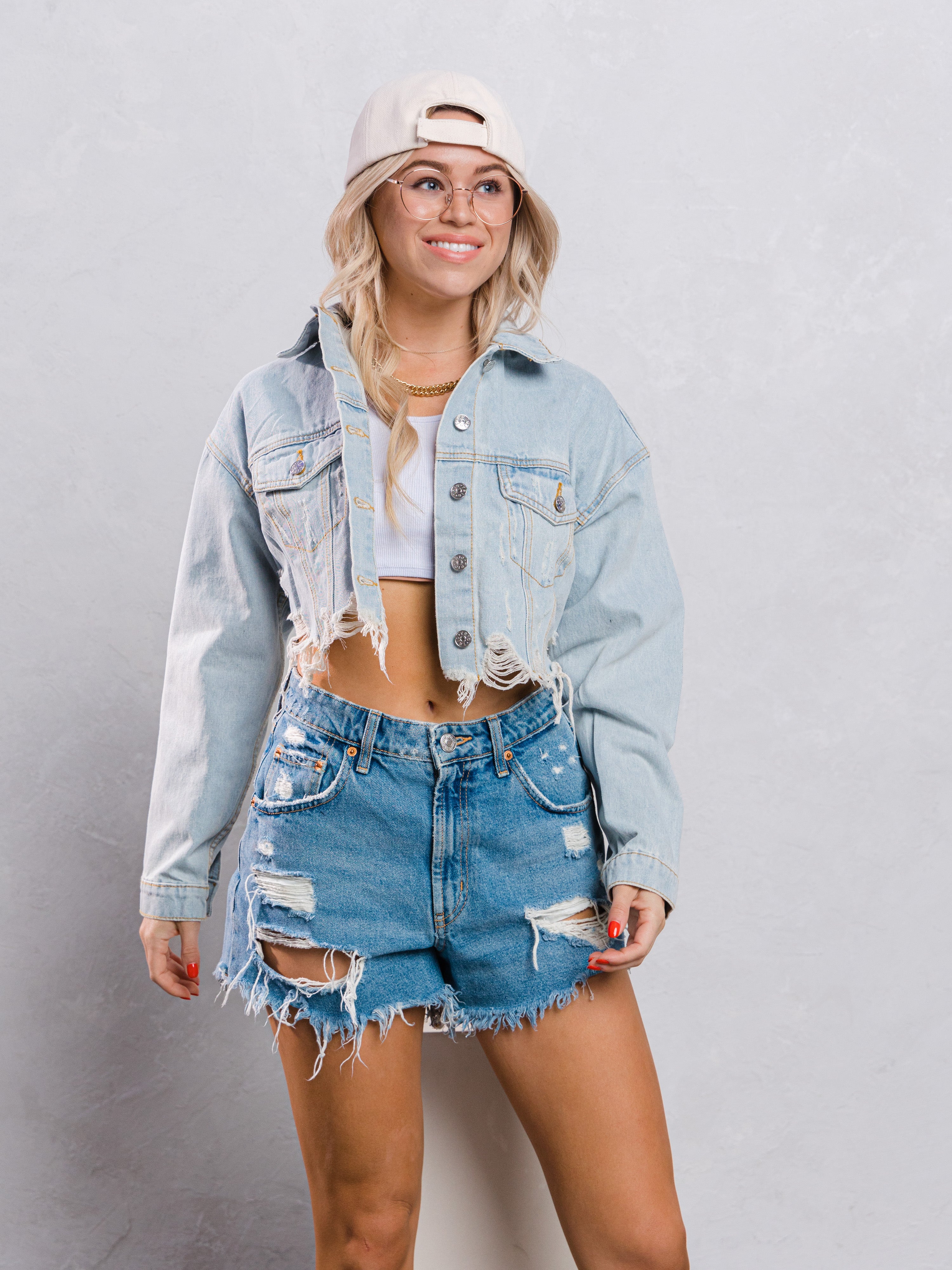 Cropped Distressed Denim Jacket, crafted distressed hemline,