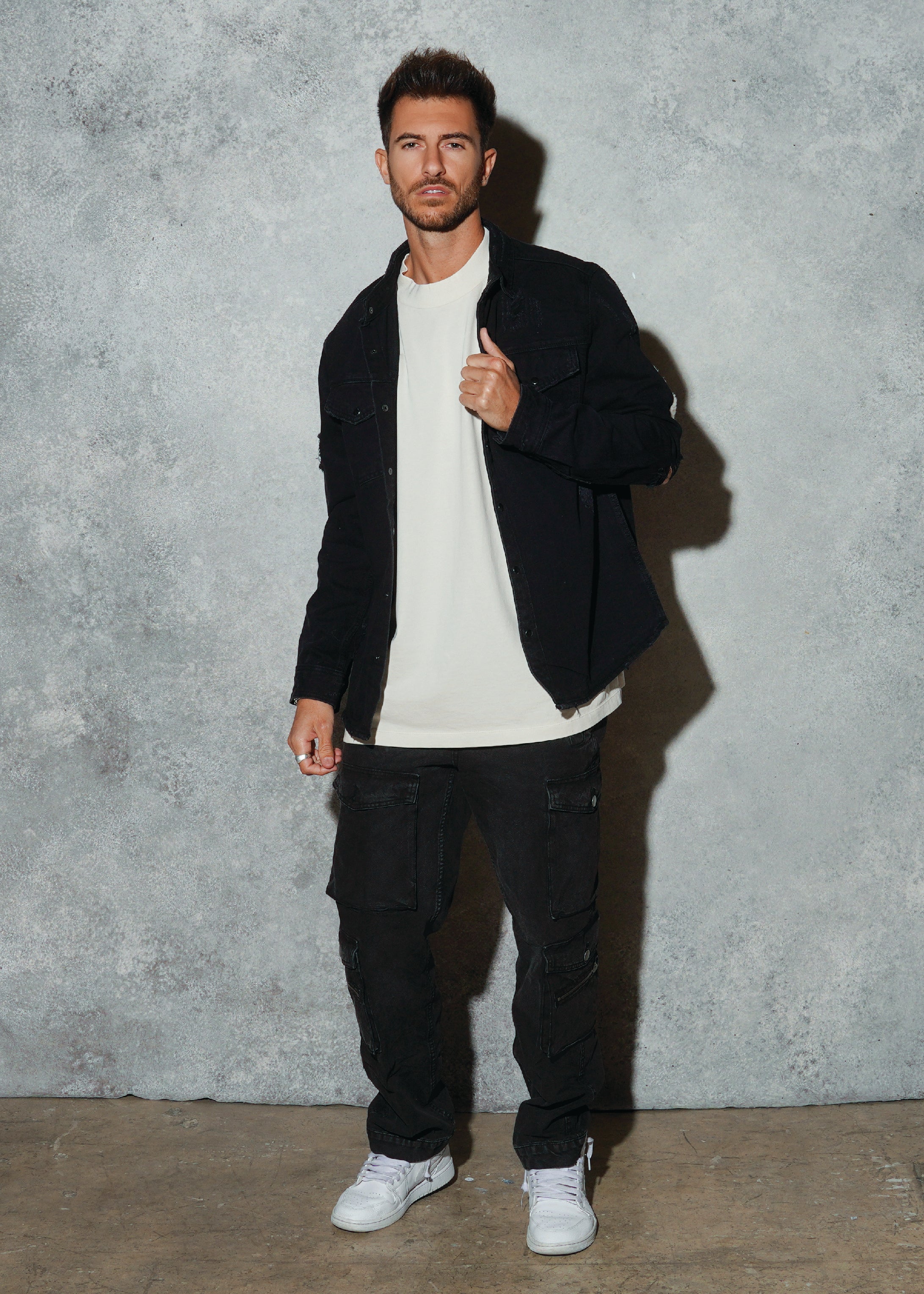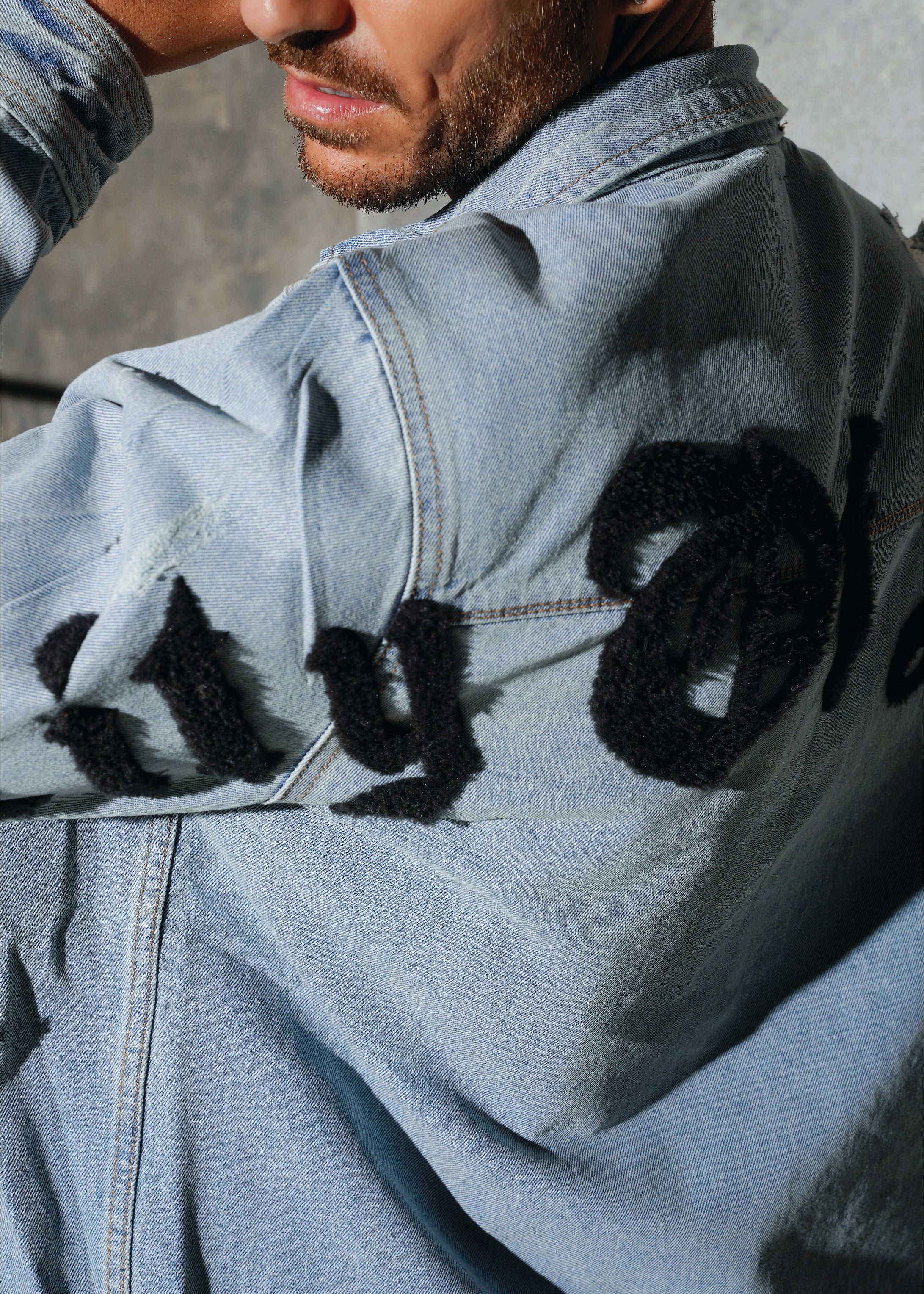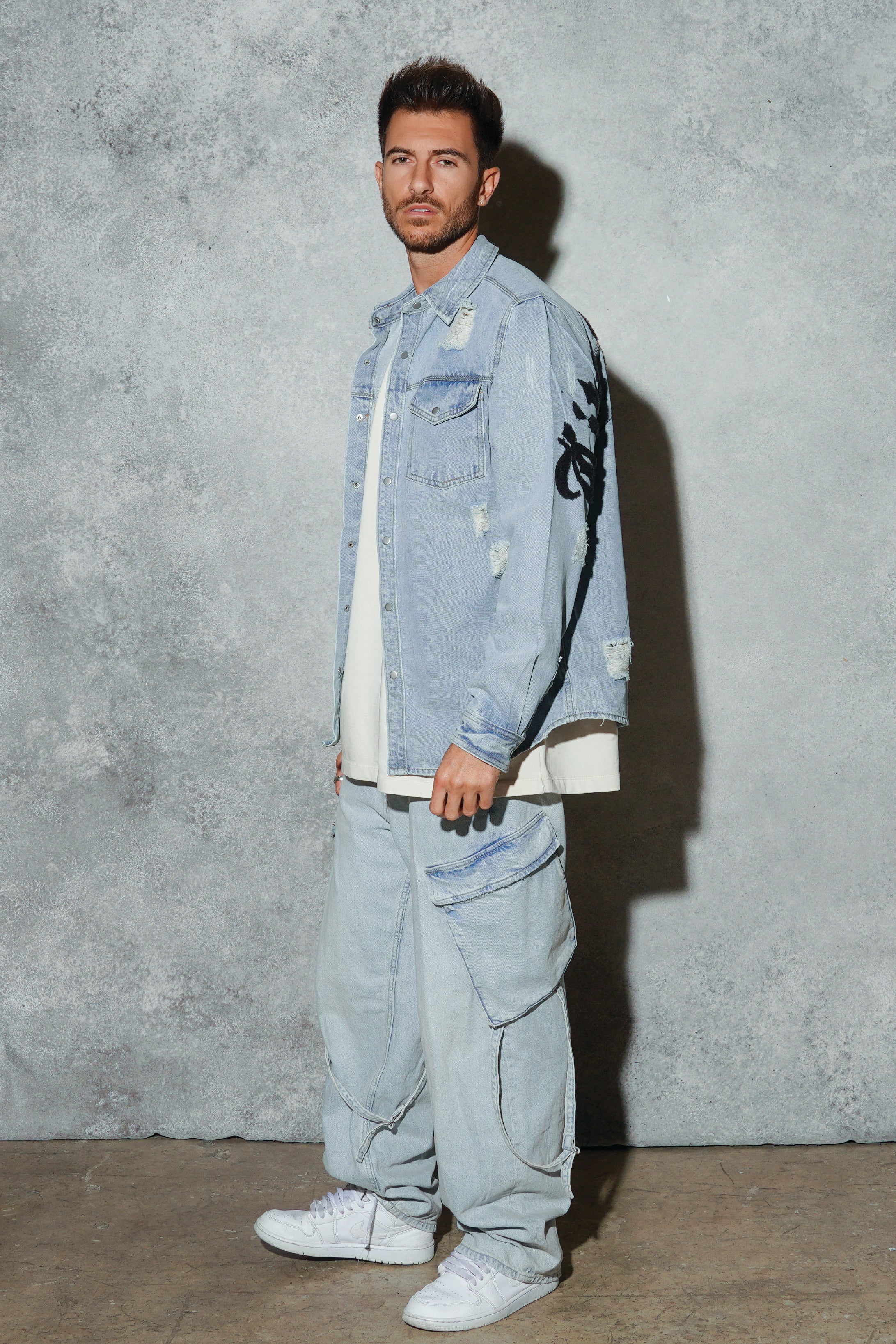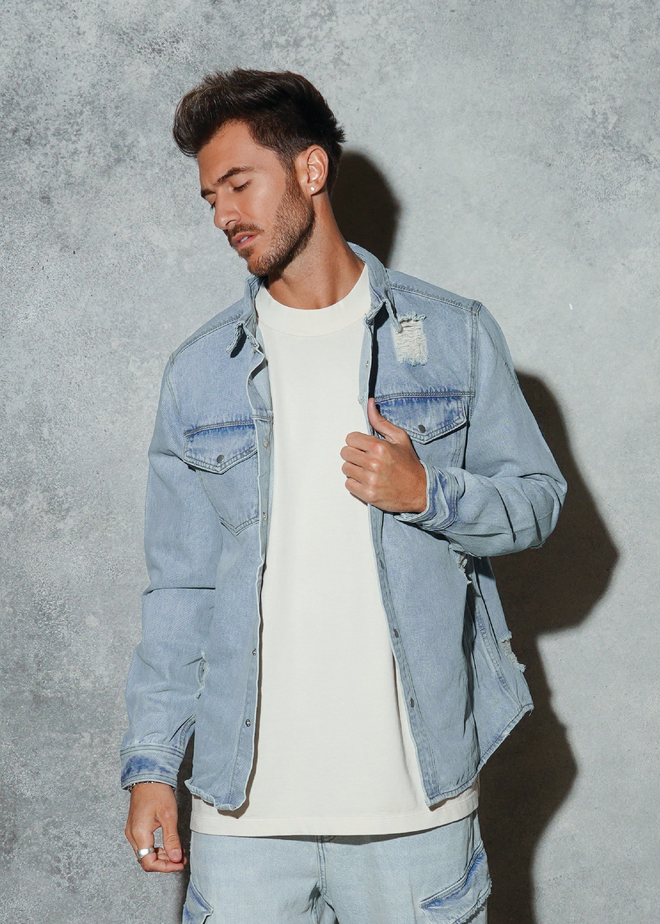 Long Distressed Denim Jacket, crafted distressed hemline,