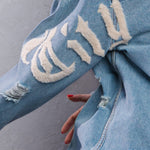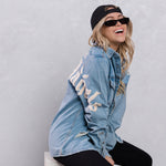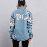 Long Distressed Denim Jacket, crafted distressed hemline,