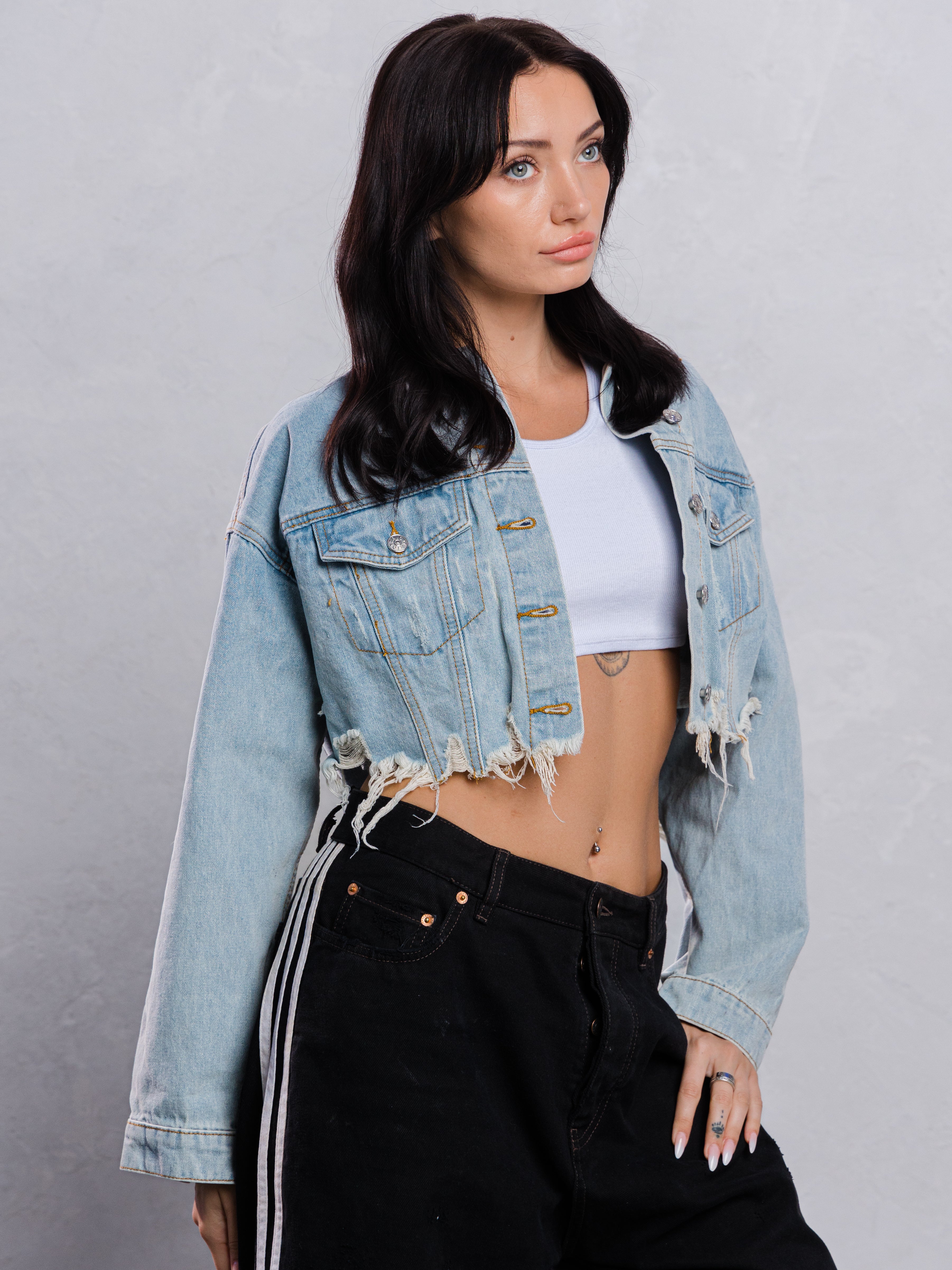Cropped Distressed Denim Jacket, crafted distressed hemline,