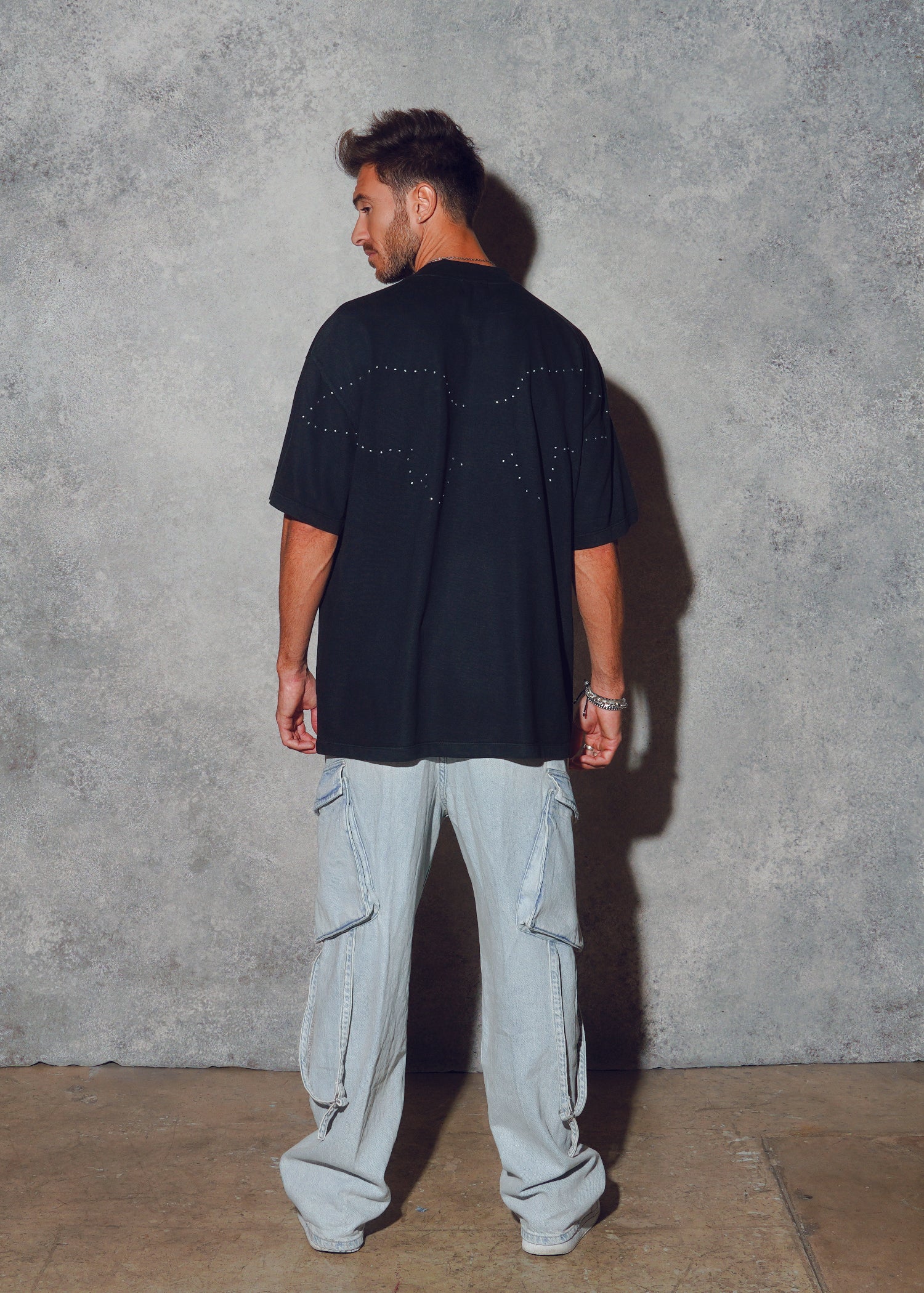 Featuring The "FALLEN ANGEL" design made of metal studs in the shape of angel wings on the back and furry lettering on the front.