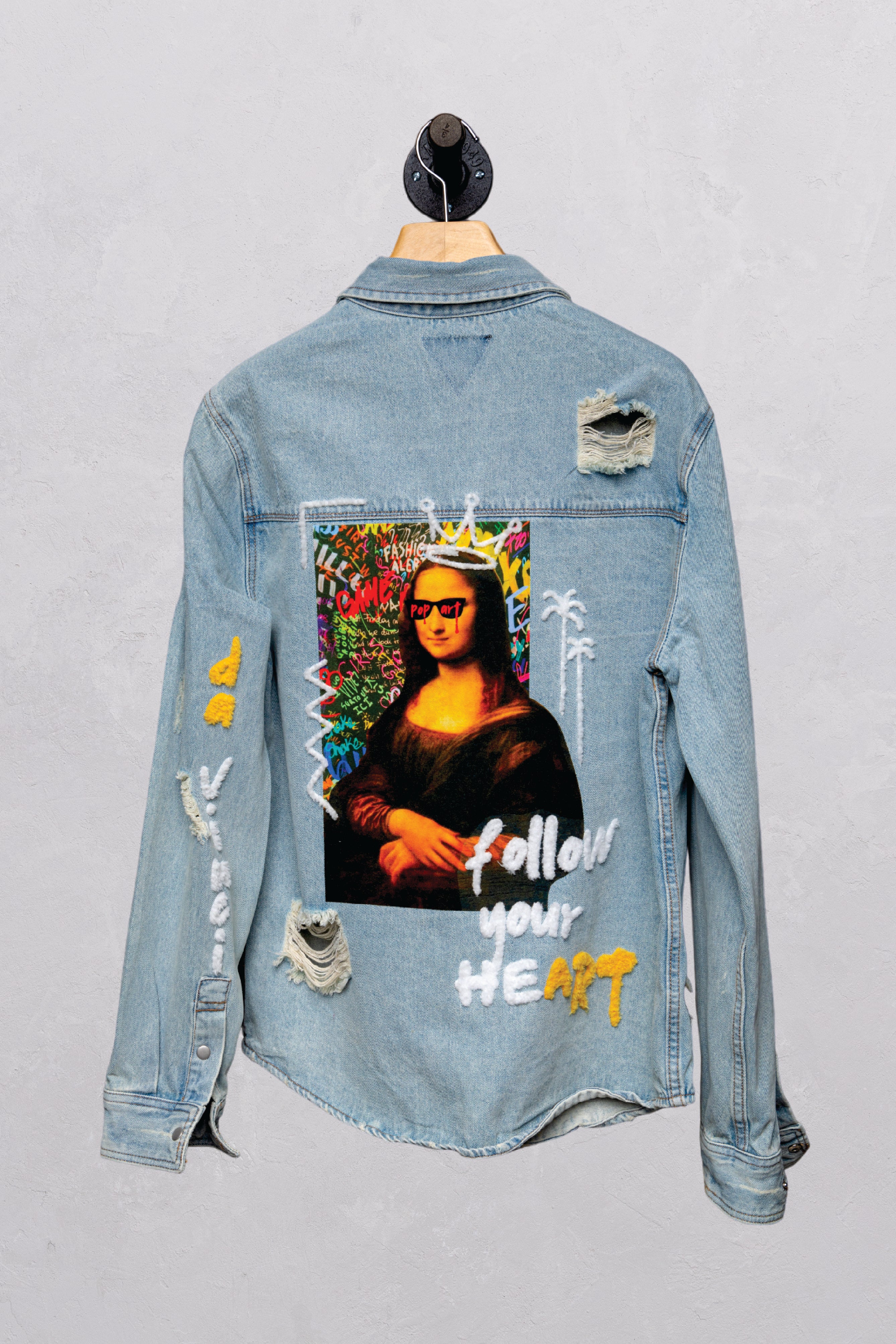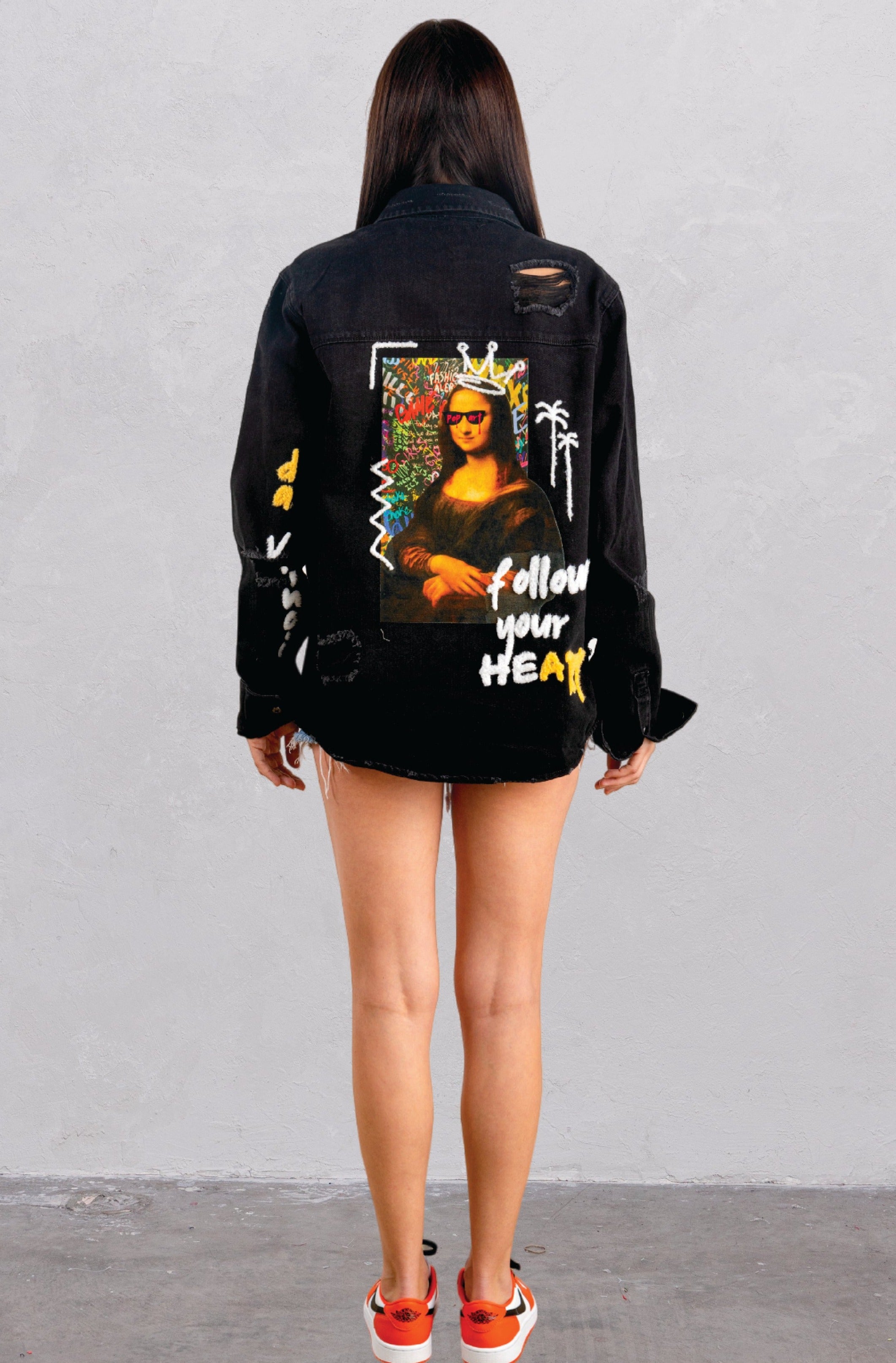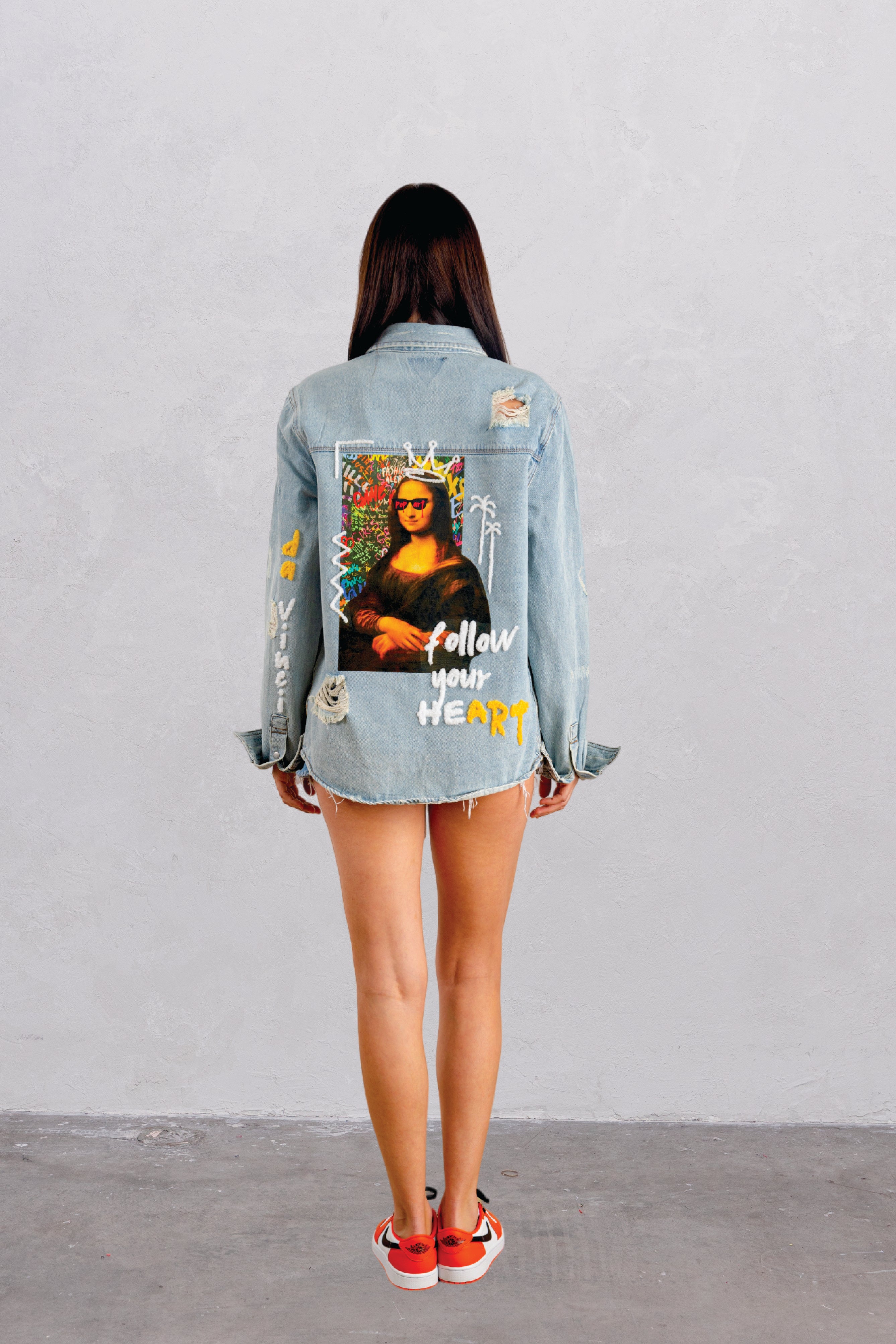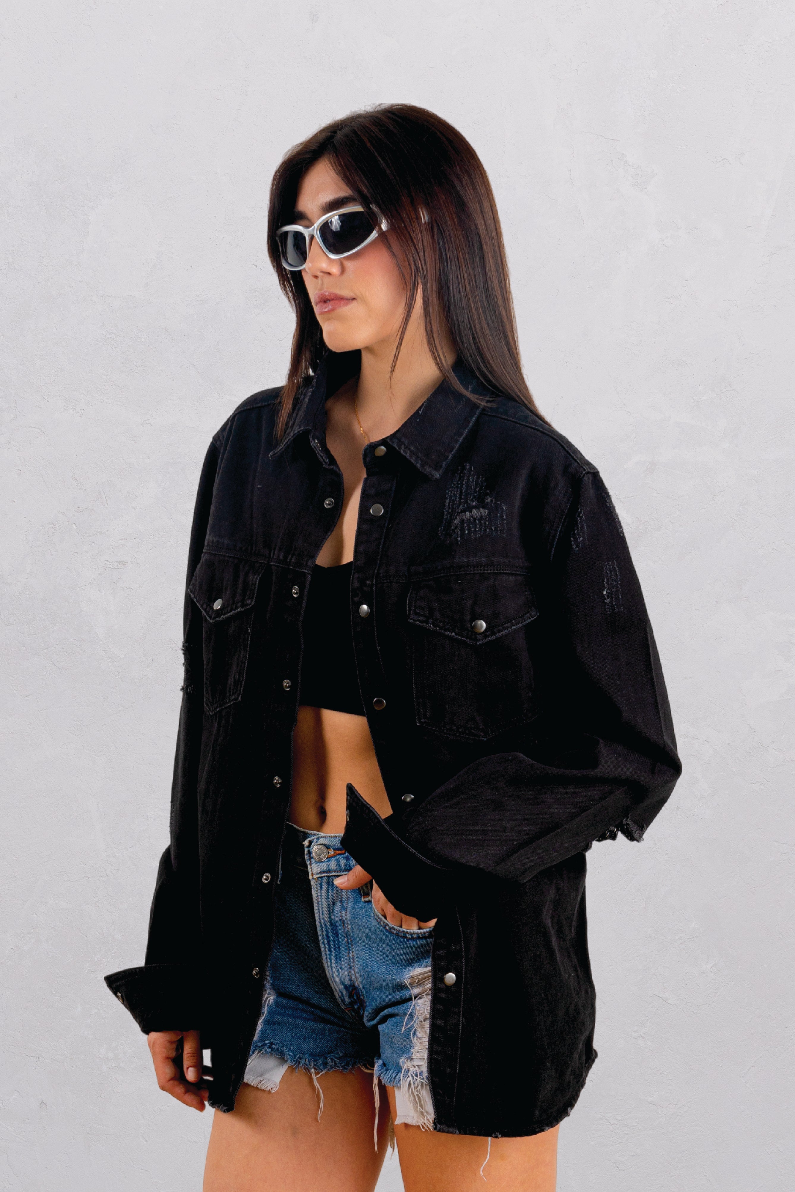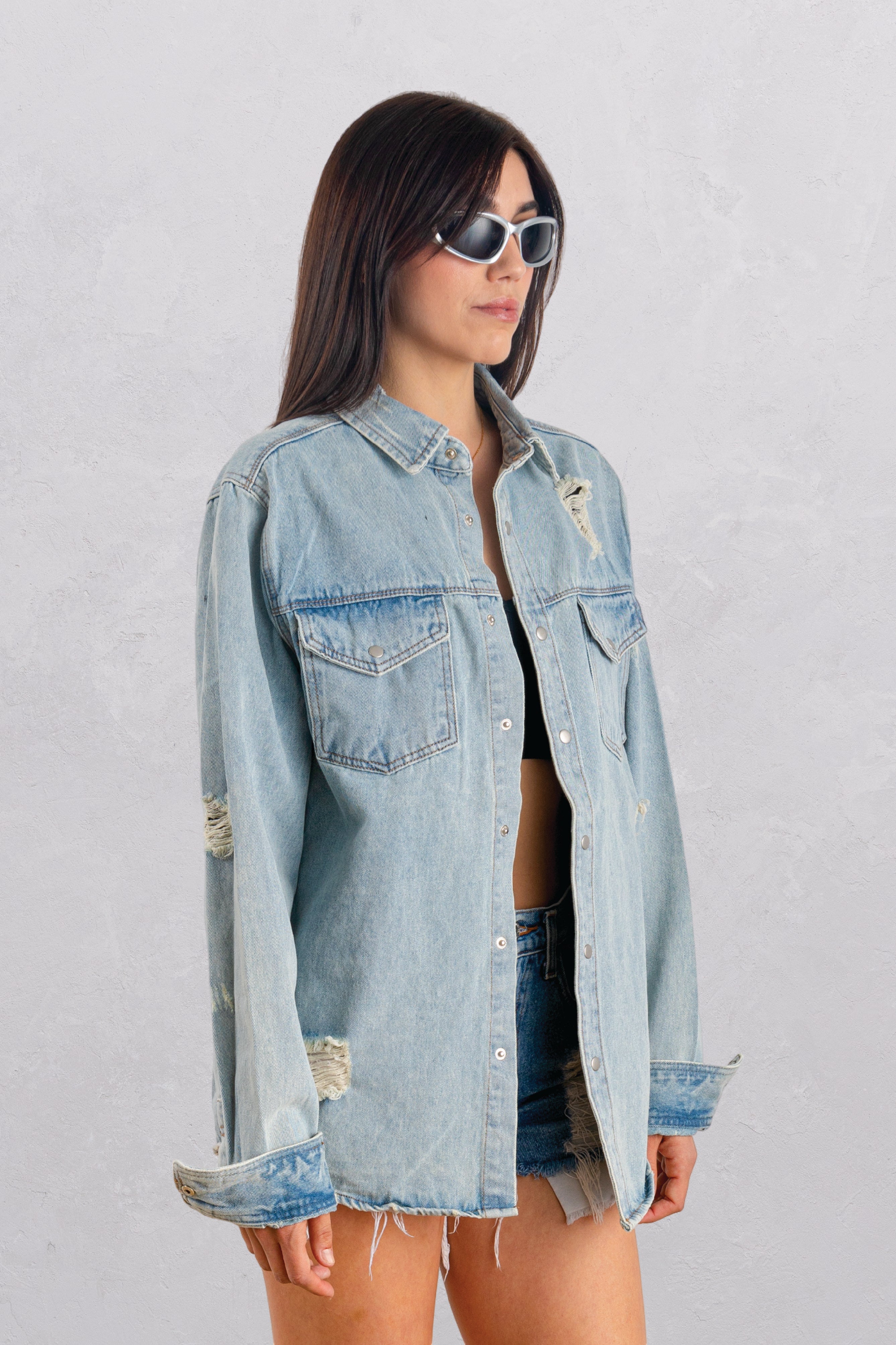 Long Distressed Denim Jacket, crafted distressed hemline,