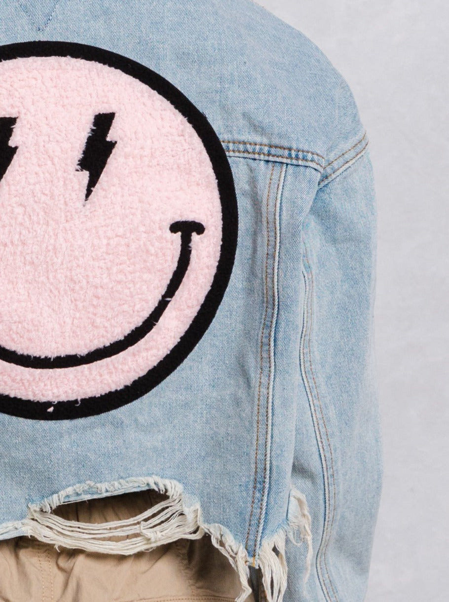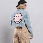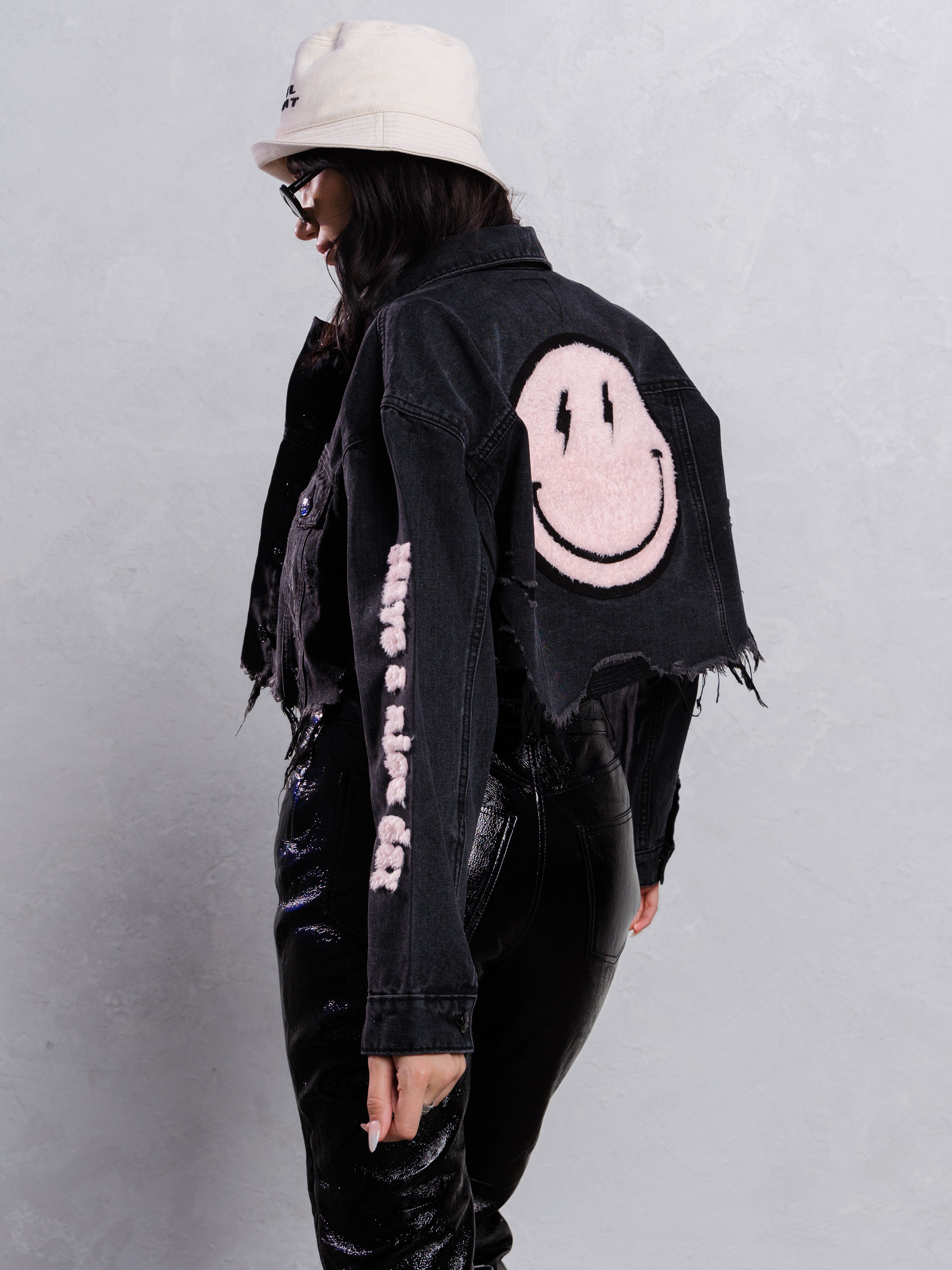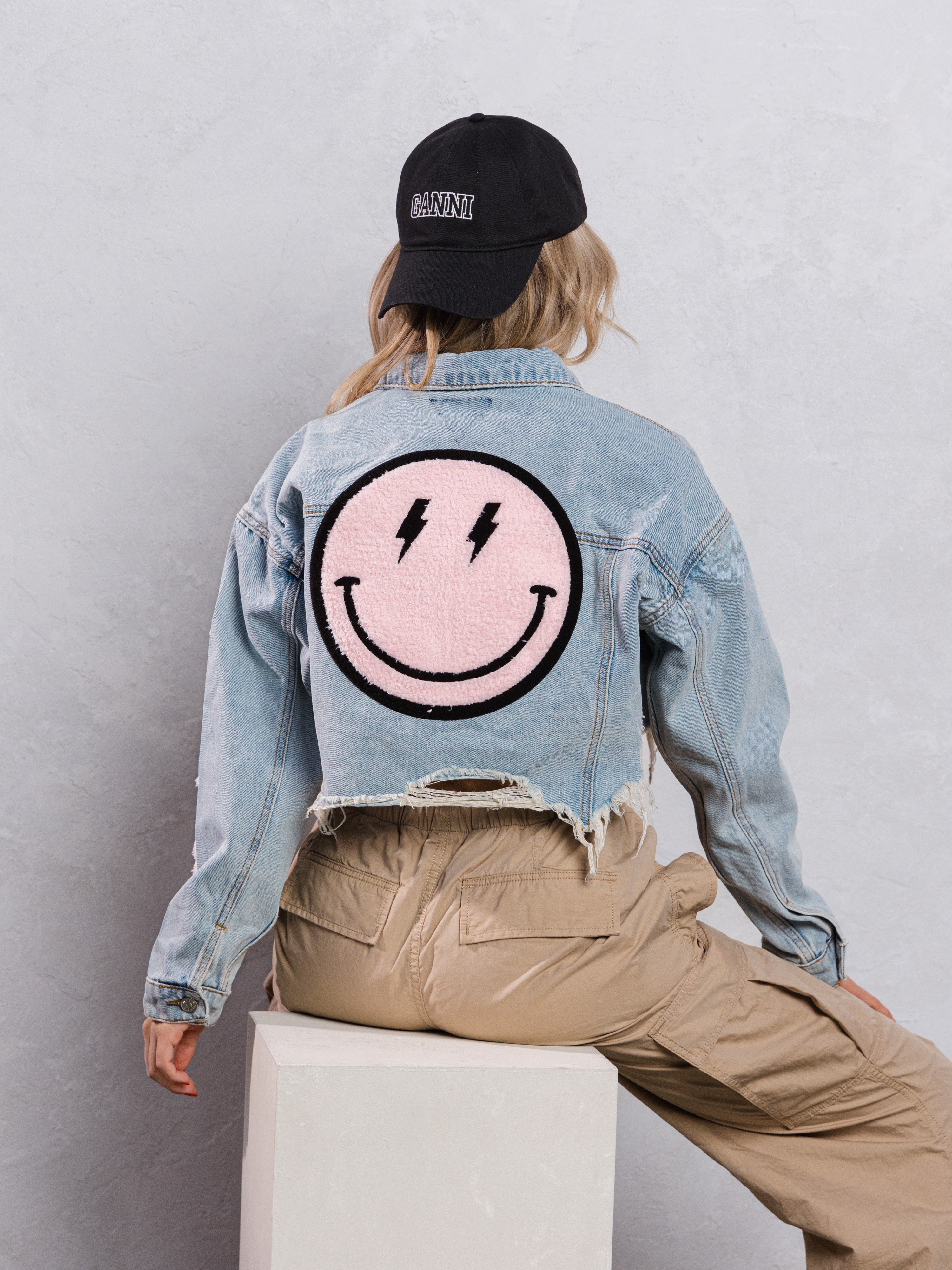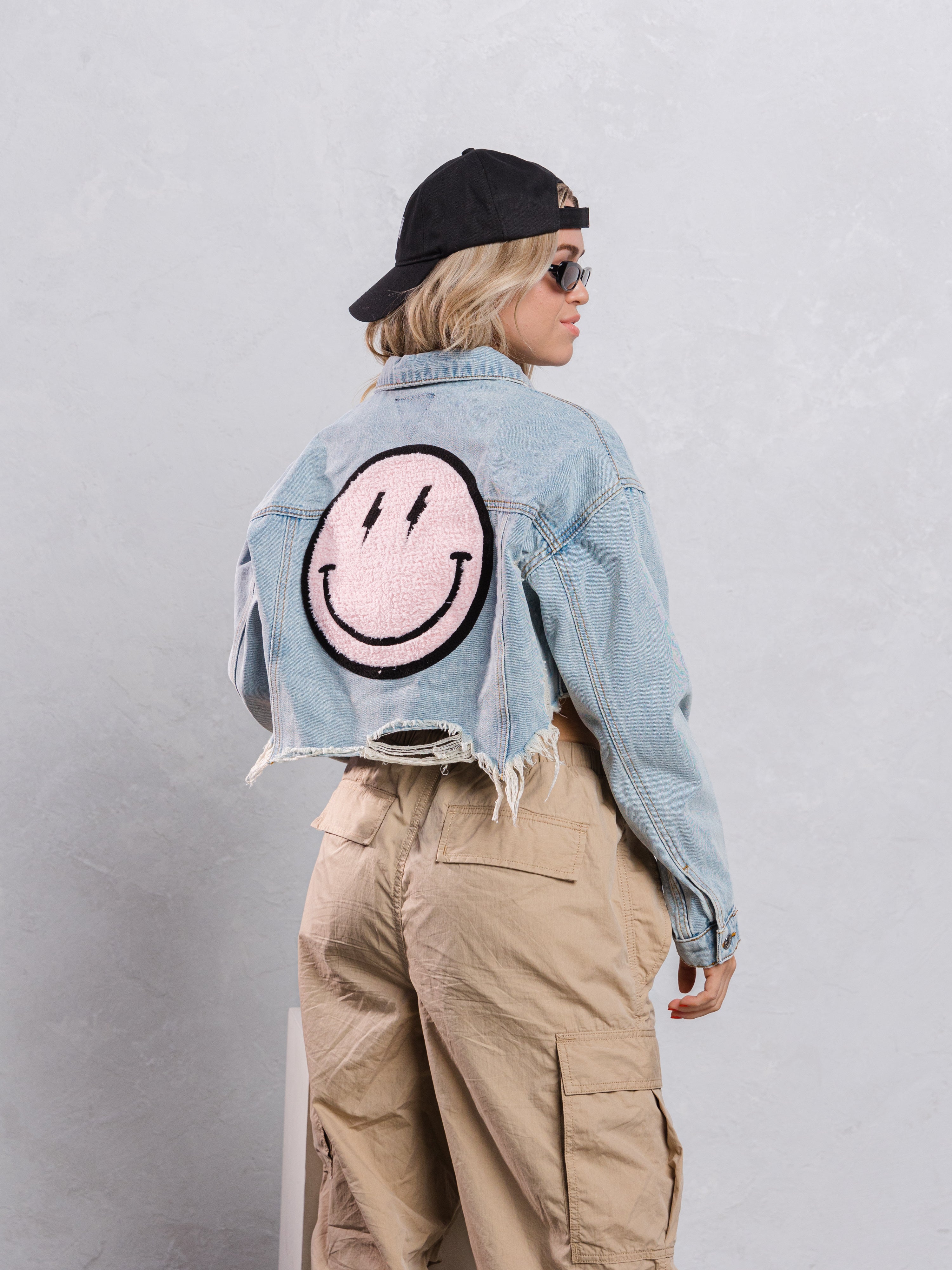 HAVE A NICE DAY pink smiley Crop Denim Jacket