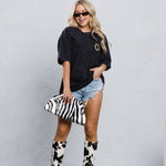 Featuring a crafted 3D Fuzzy texture Patch design. Model is wearing a Large size.