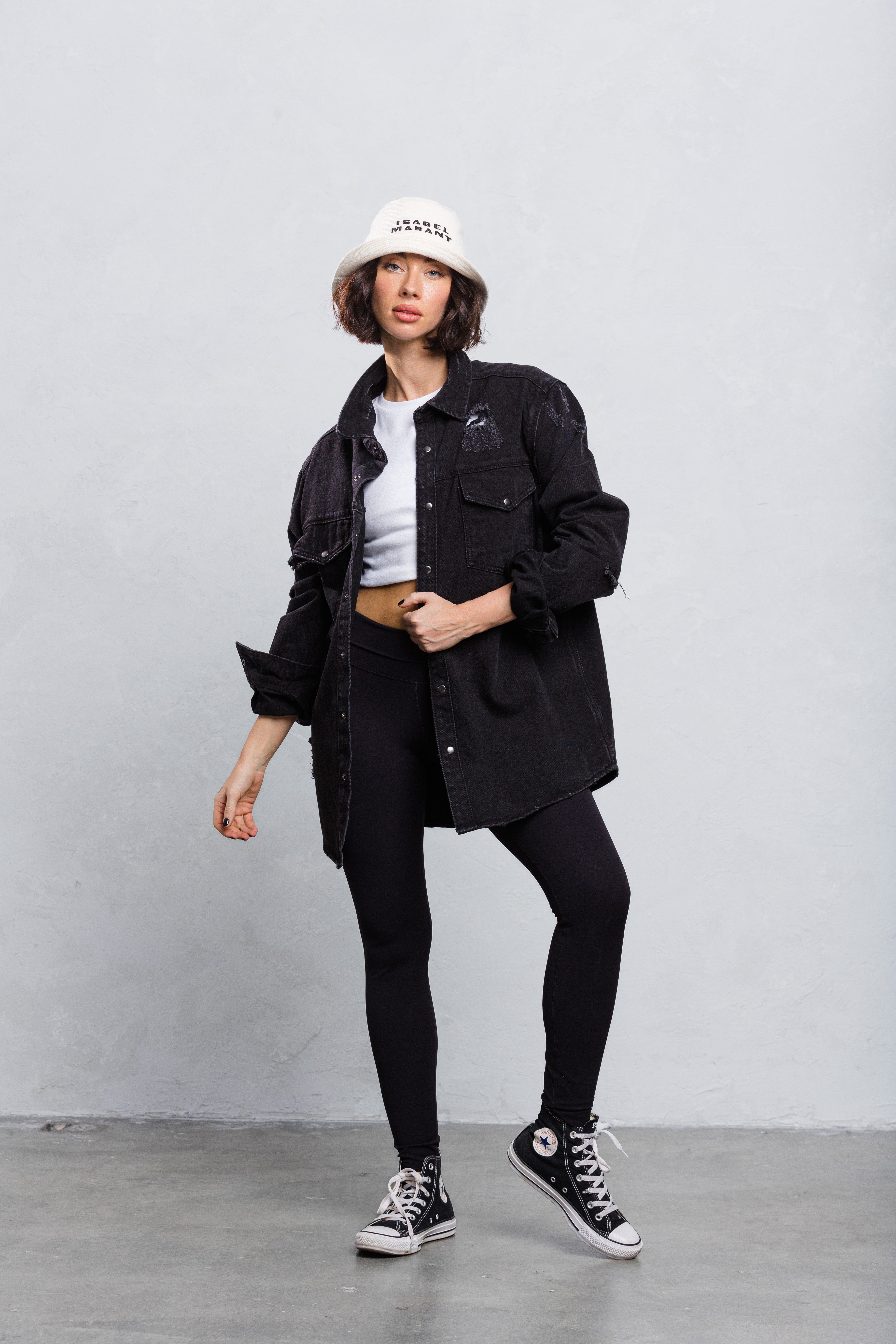 Long Distressed Denim Jacket, crafted distressed hemline,