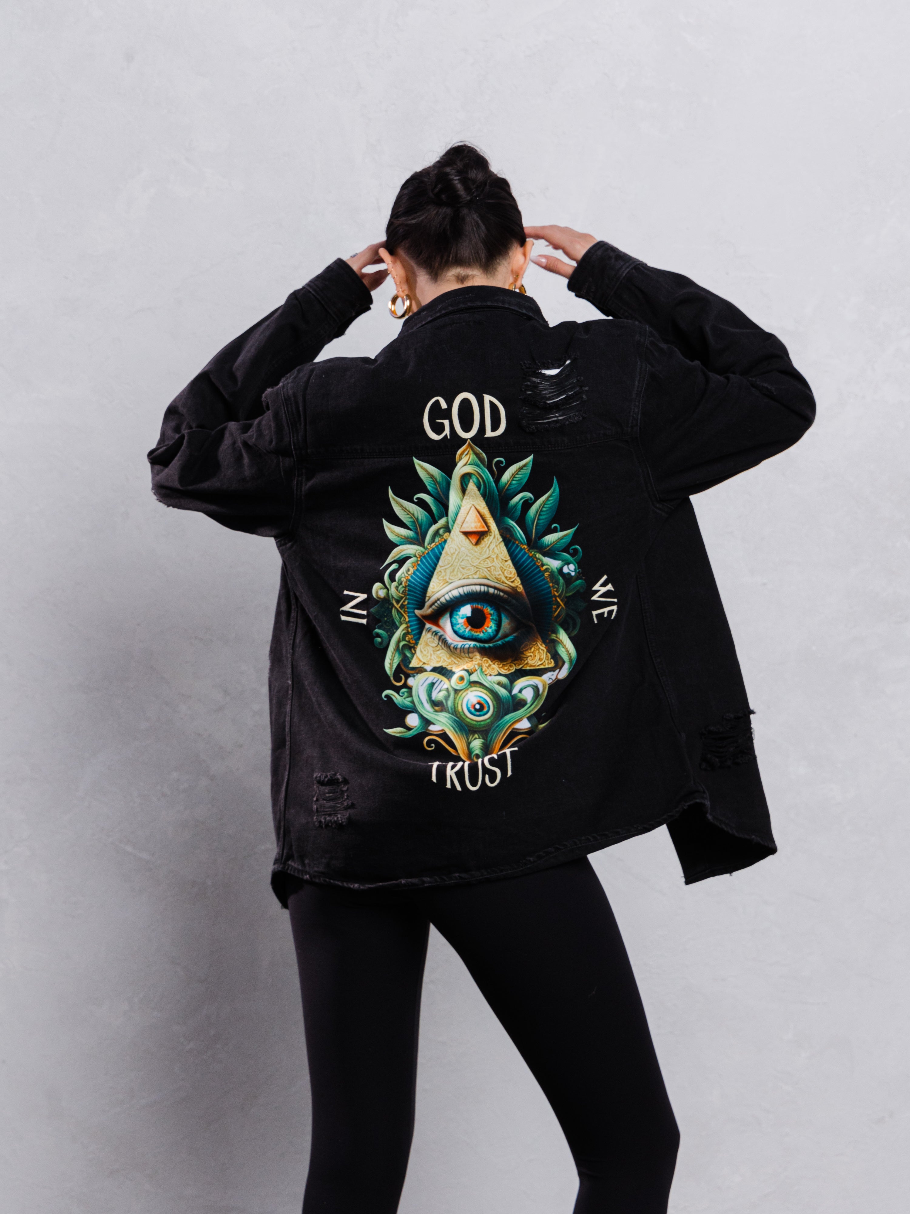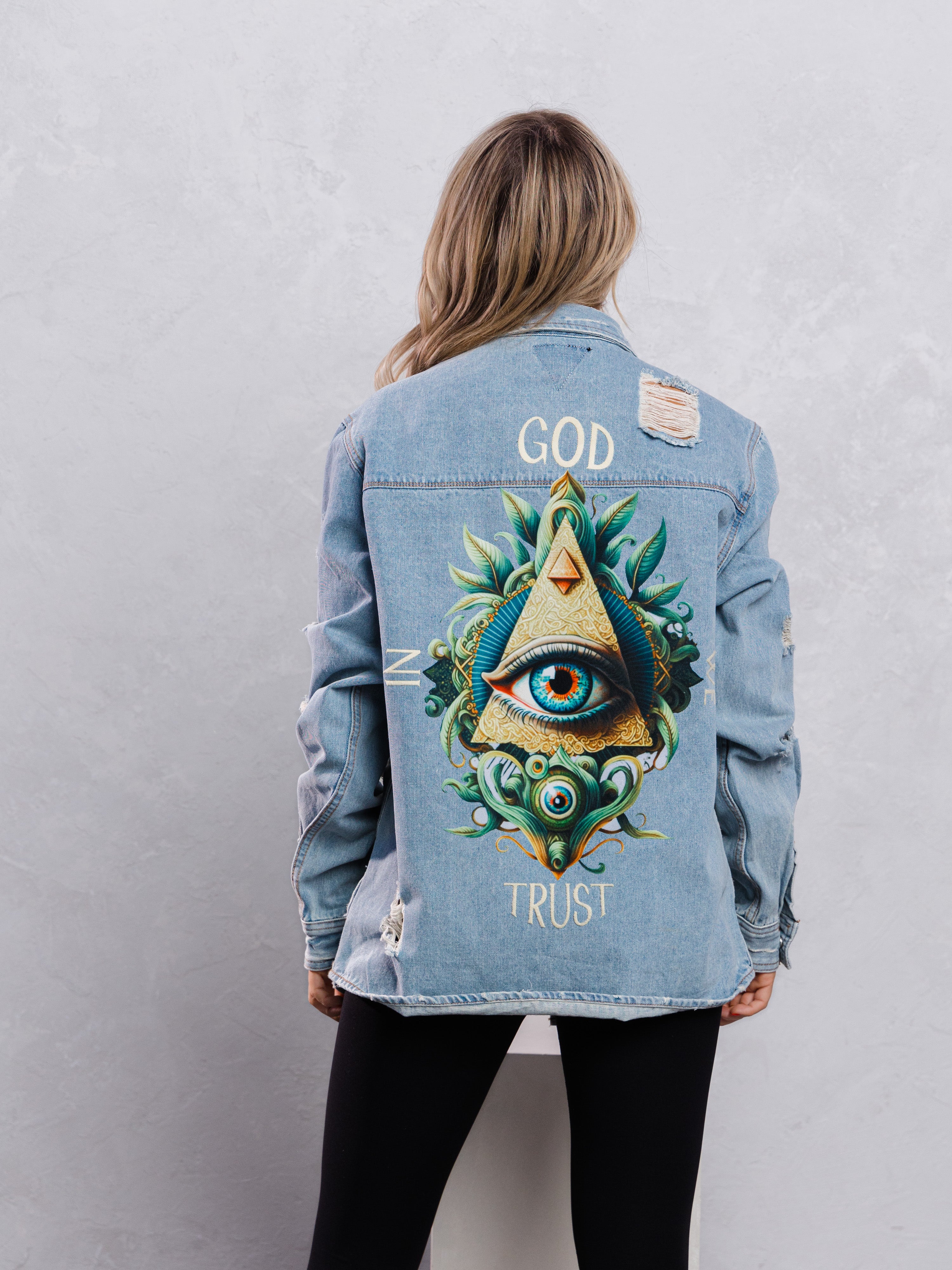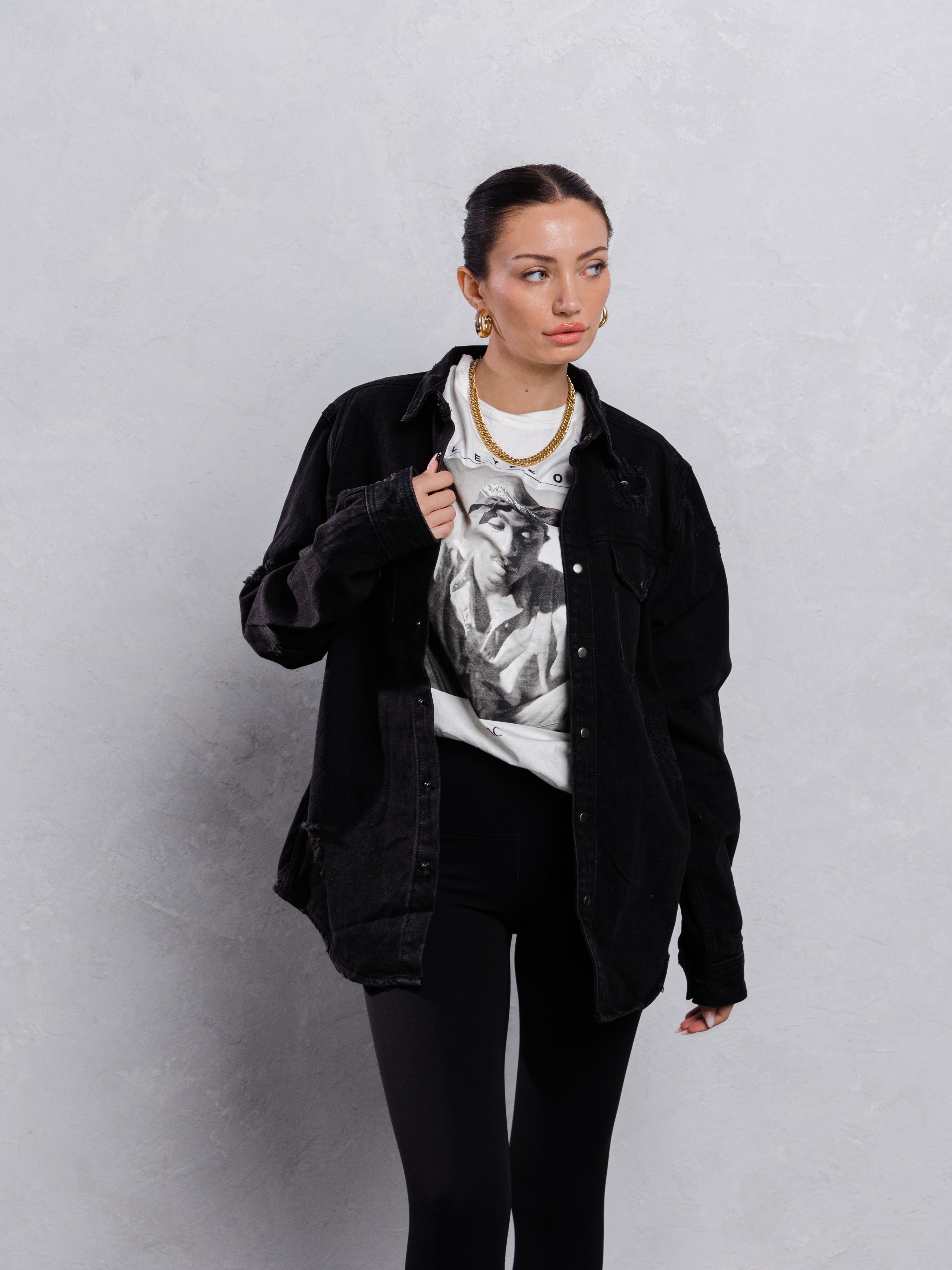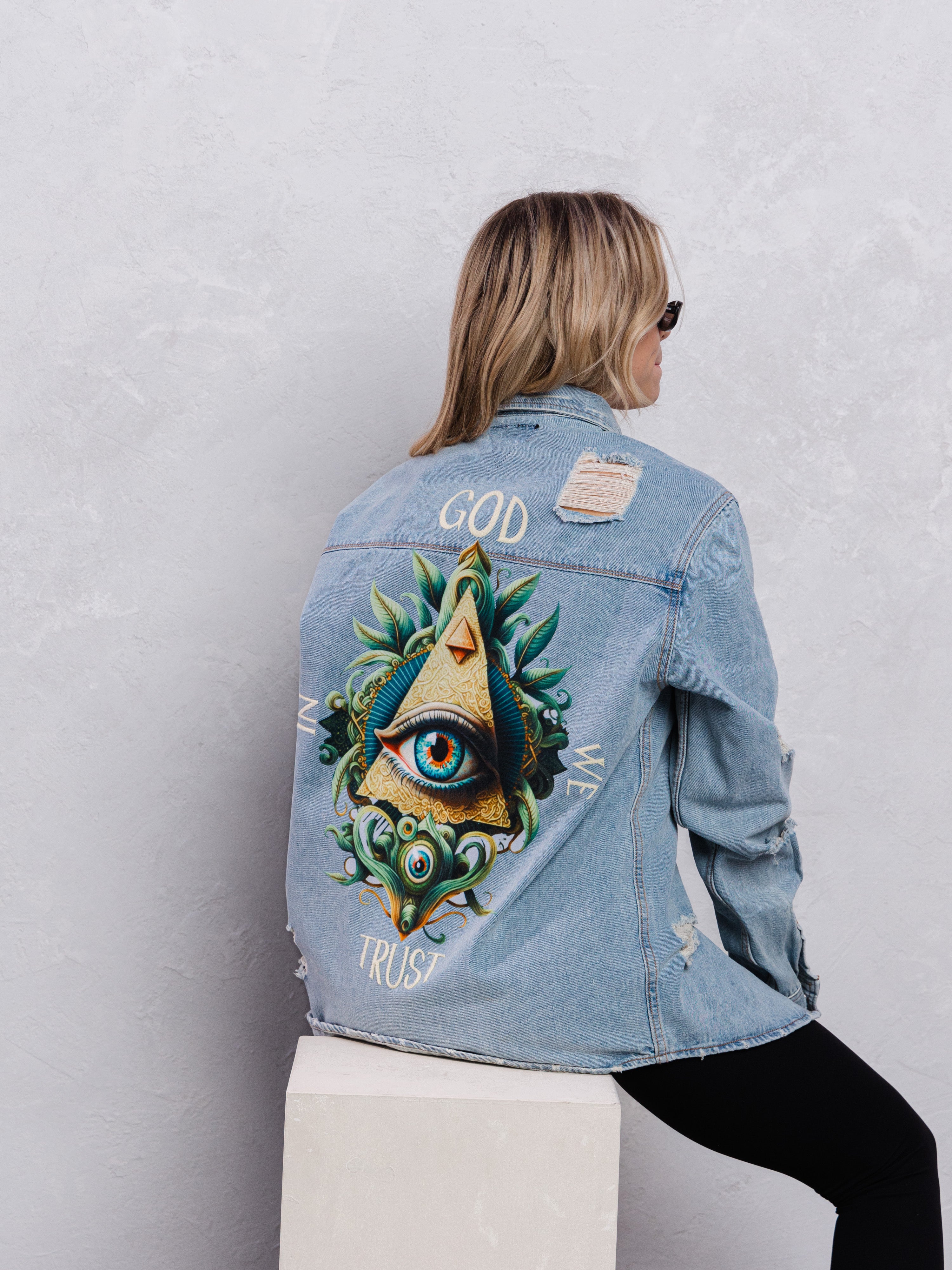 Long Distressed Denim Jacket, crafted distressed hemline,