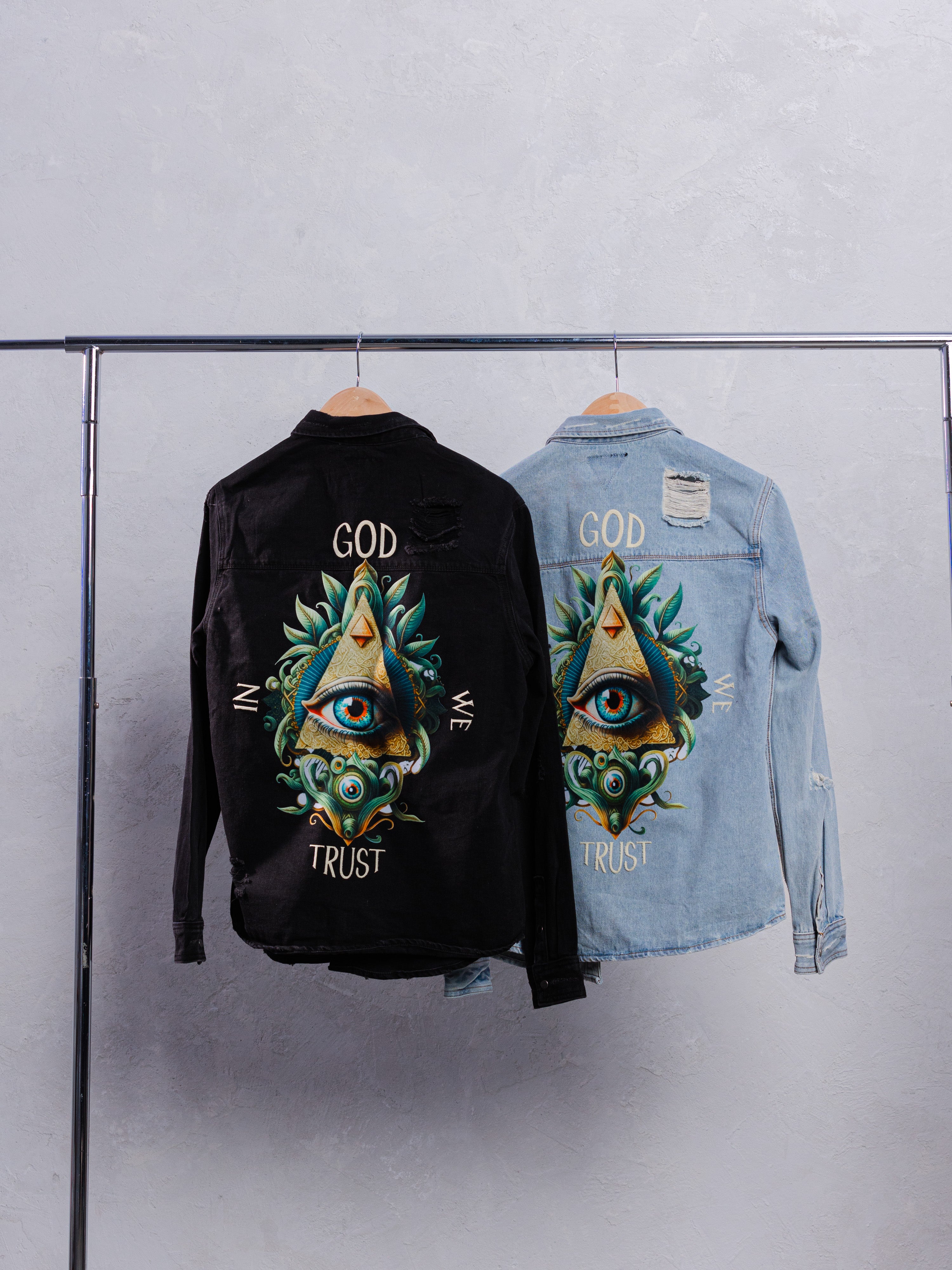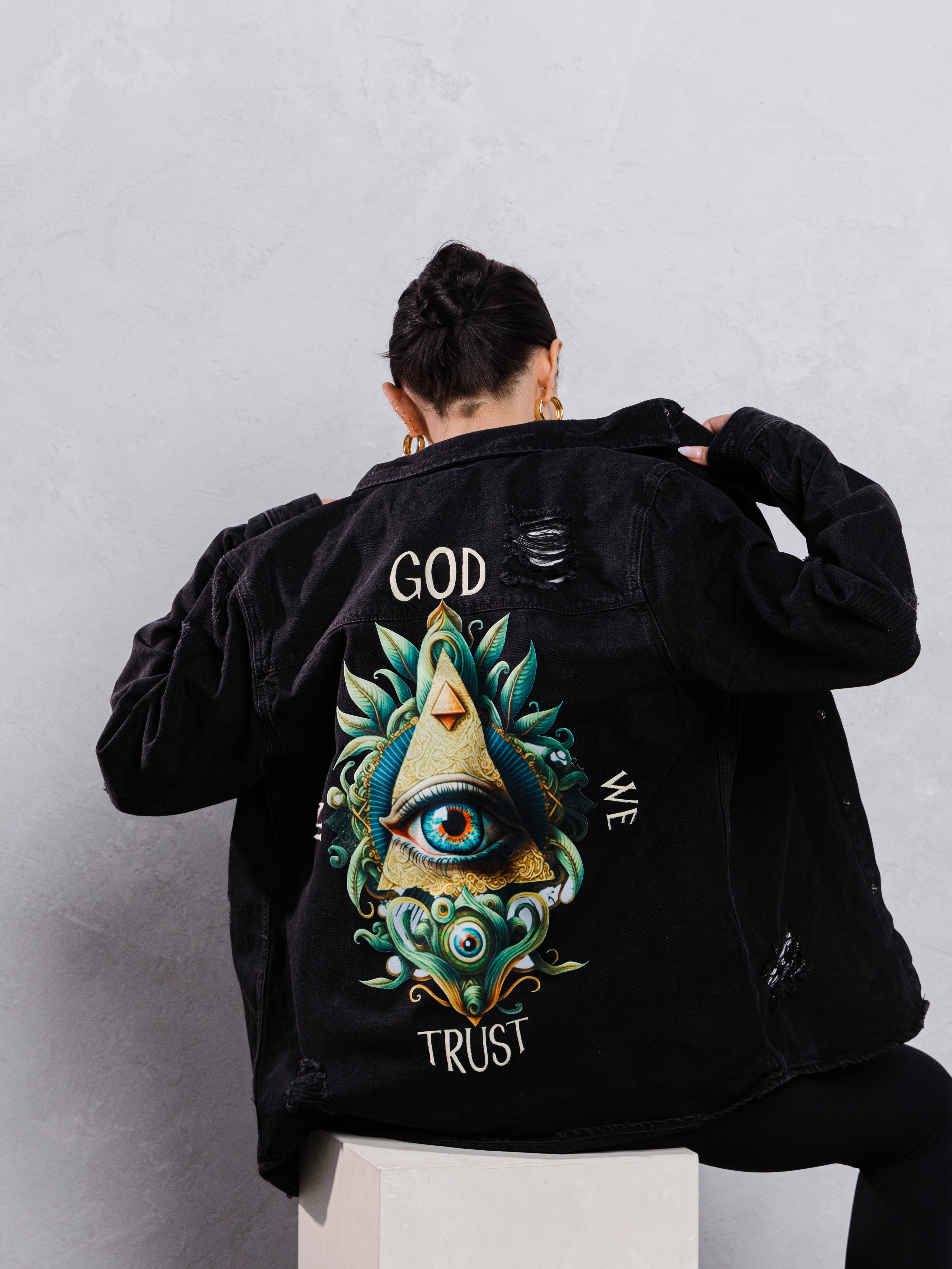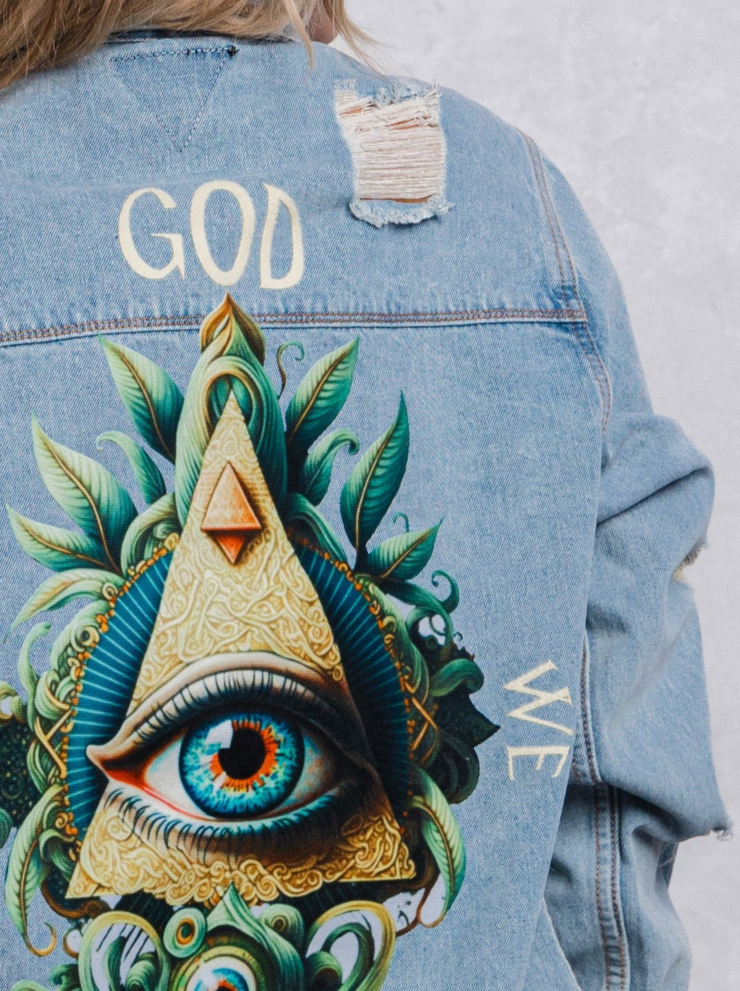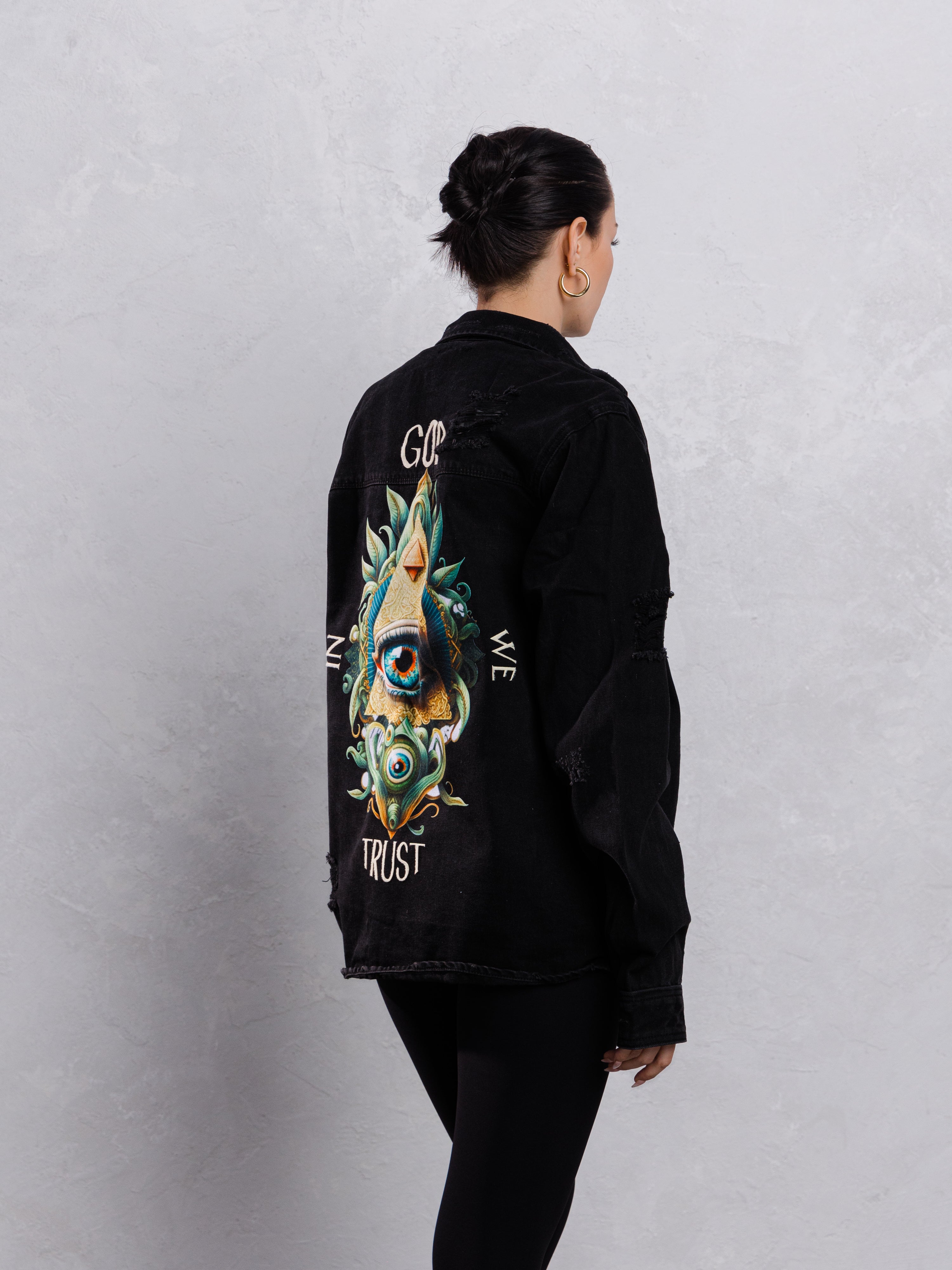 Long Distressed Denim Jacket, crafted distressed hemline,