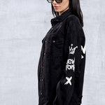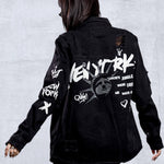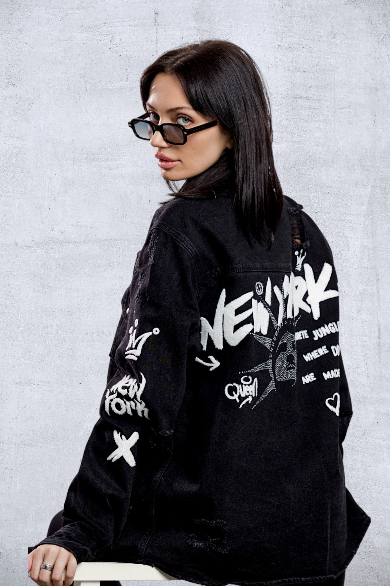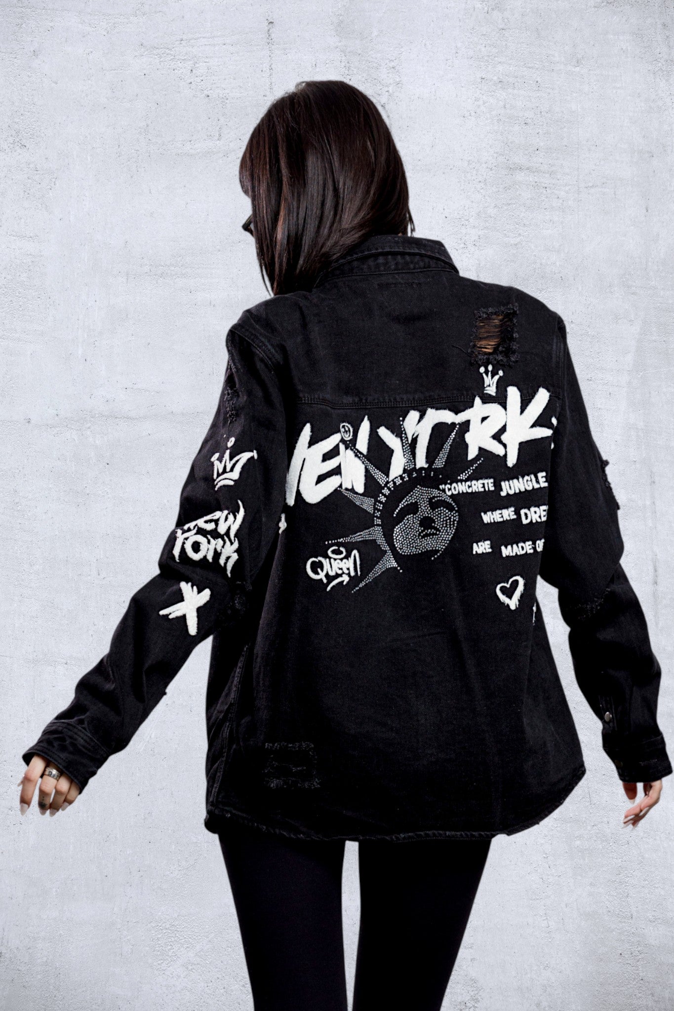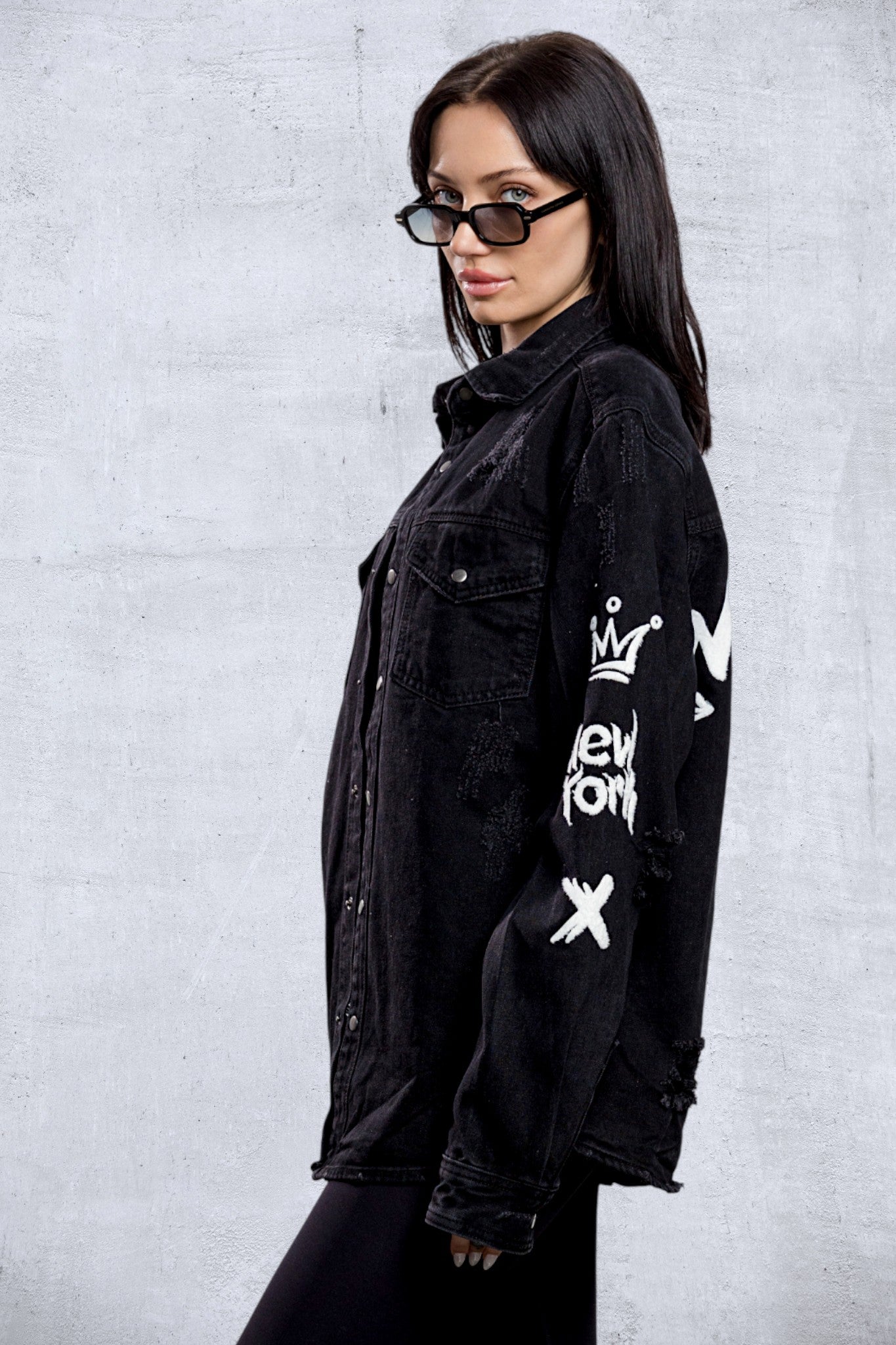 Long Distressed Denim Jacket, crafted distressed hemline,