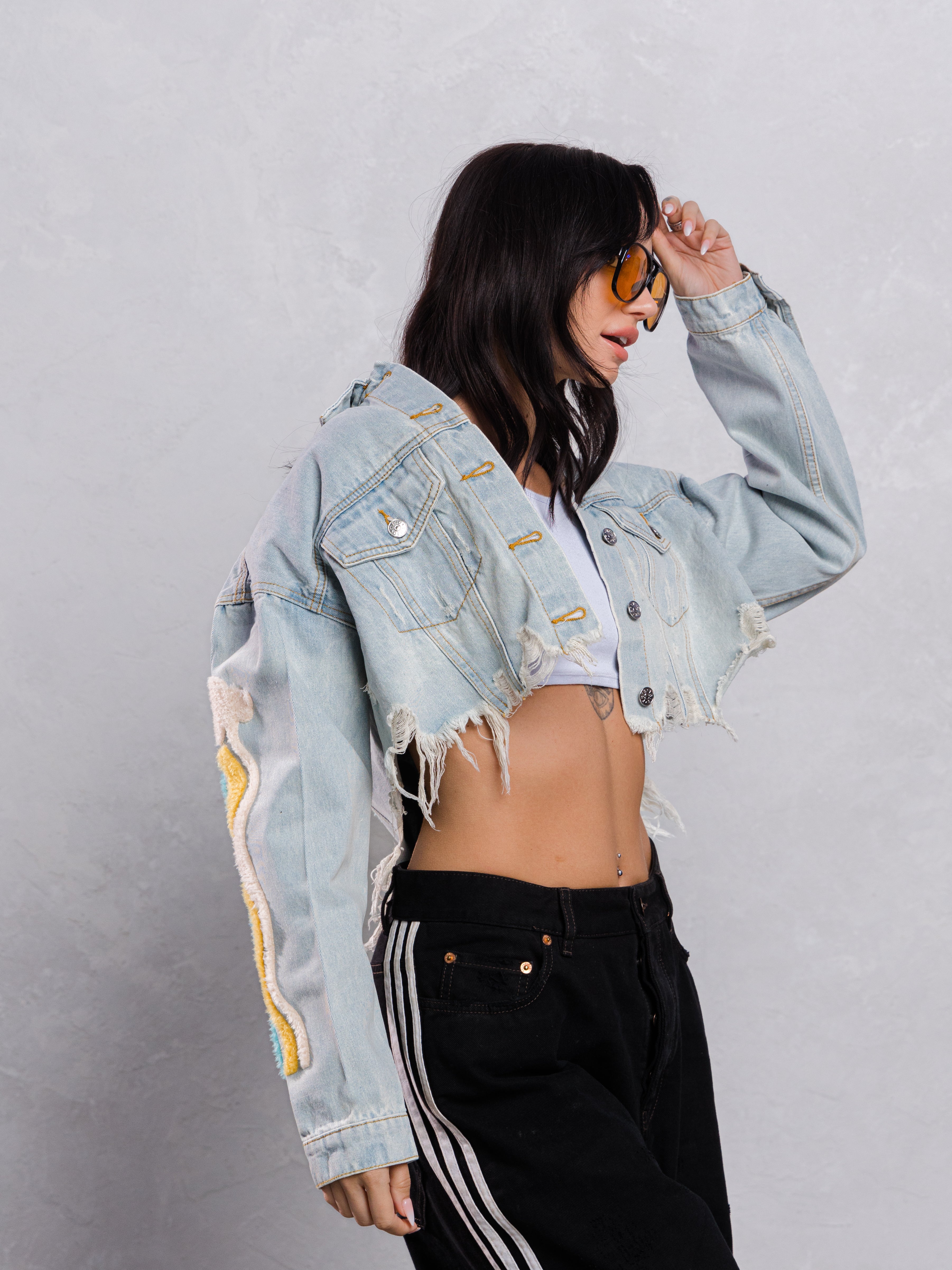 Cropped Distressed Denim Jacket, crafted distressed hemline,