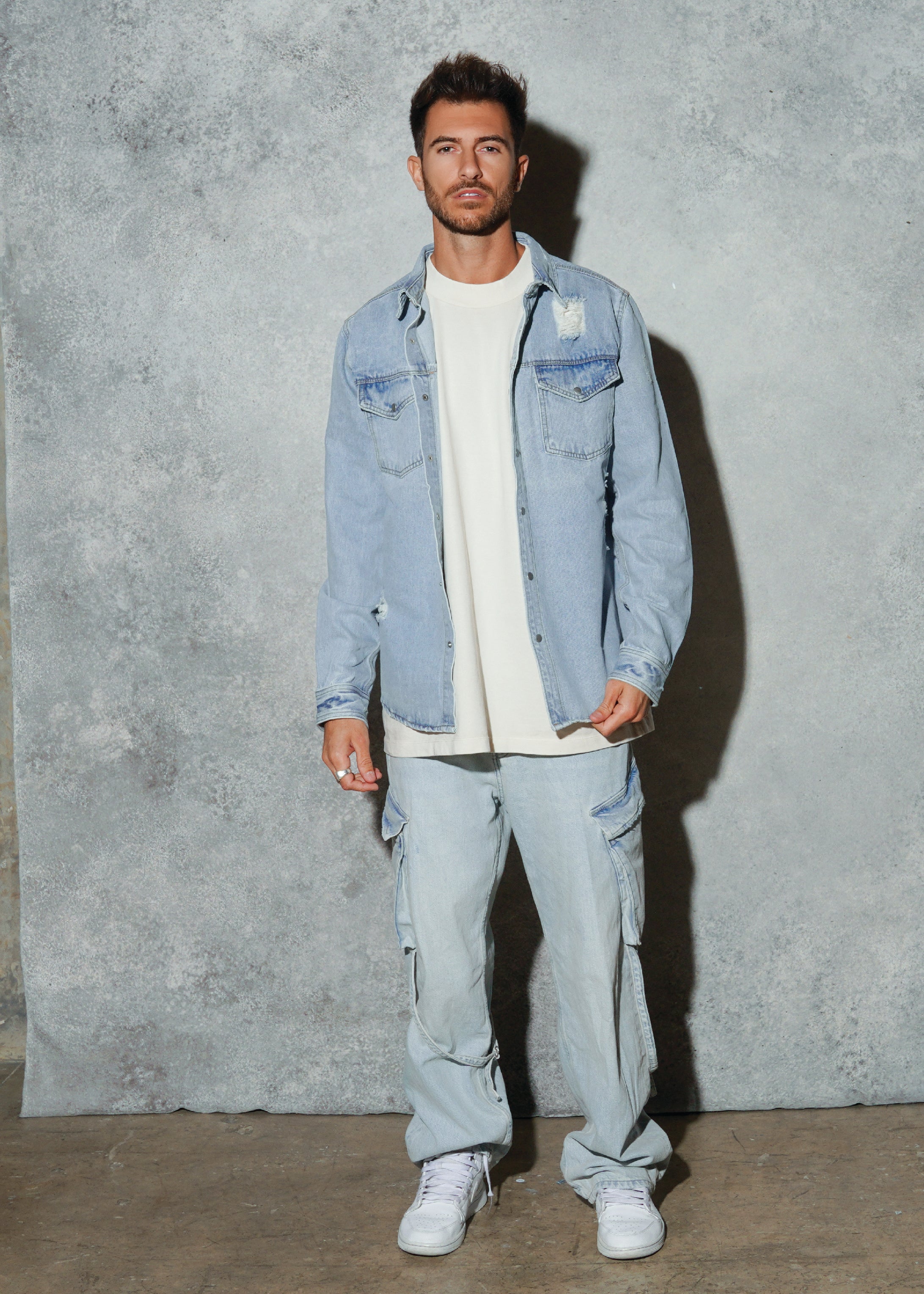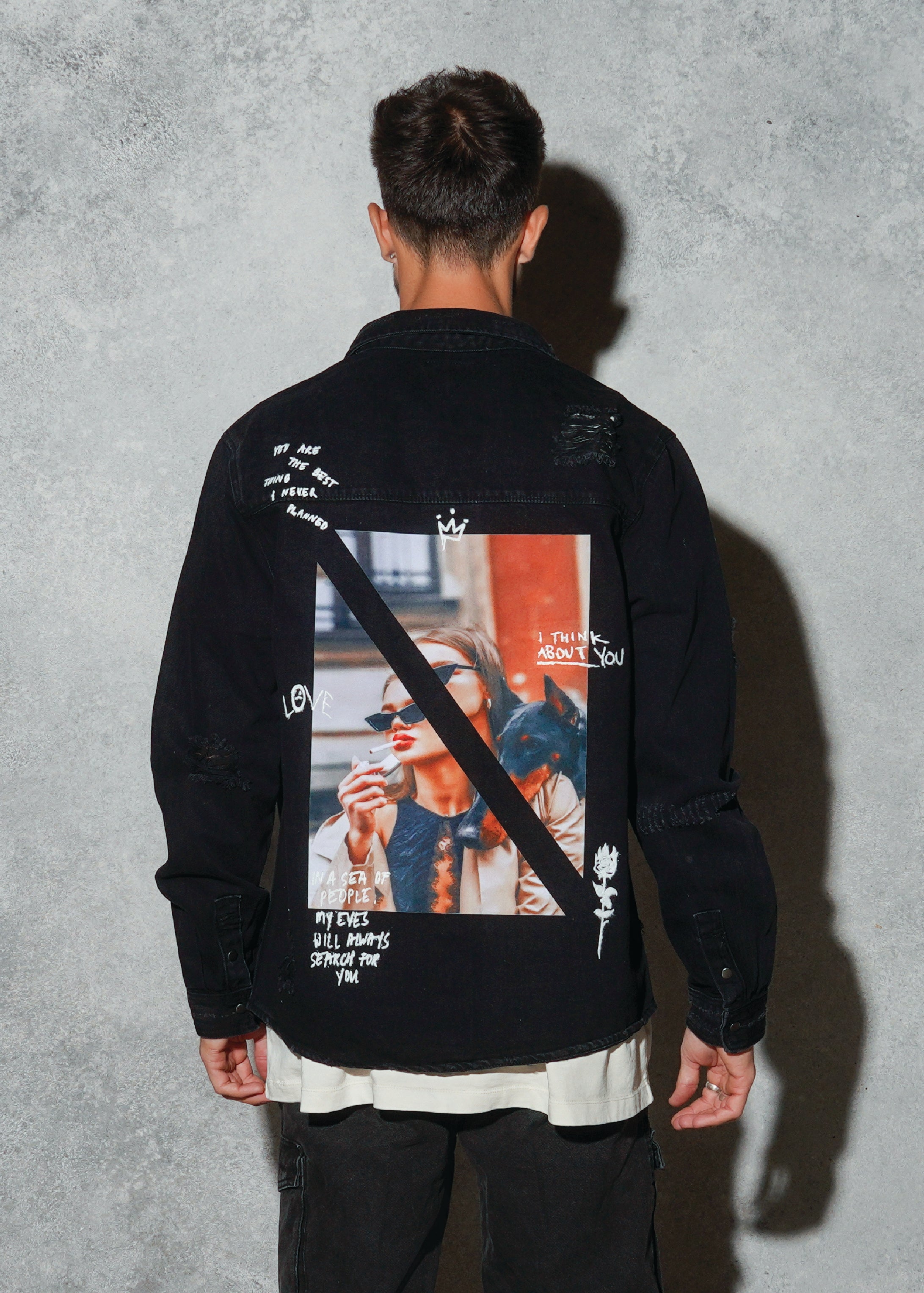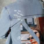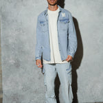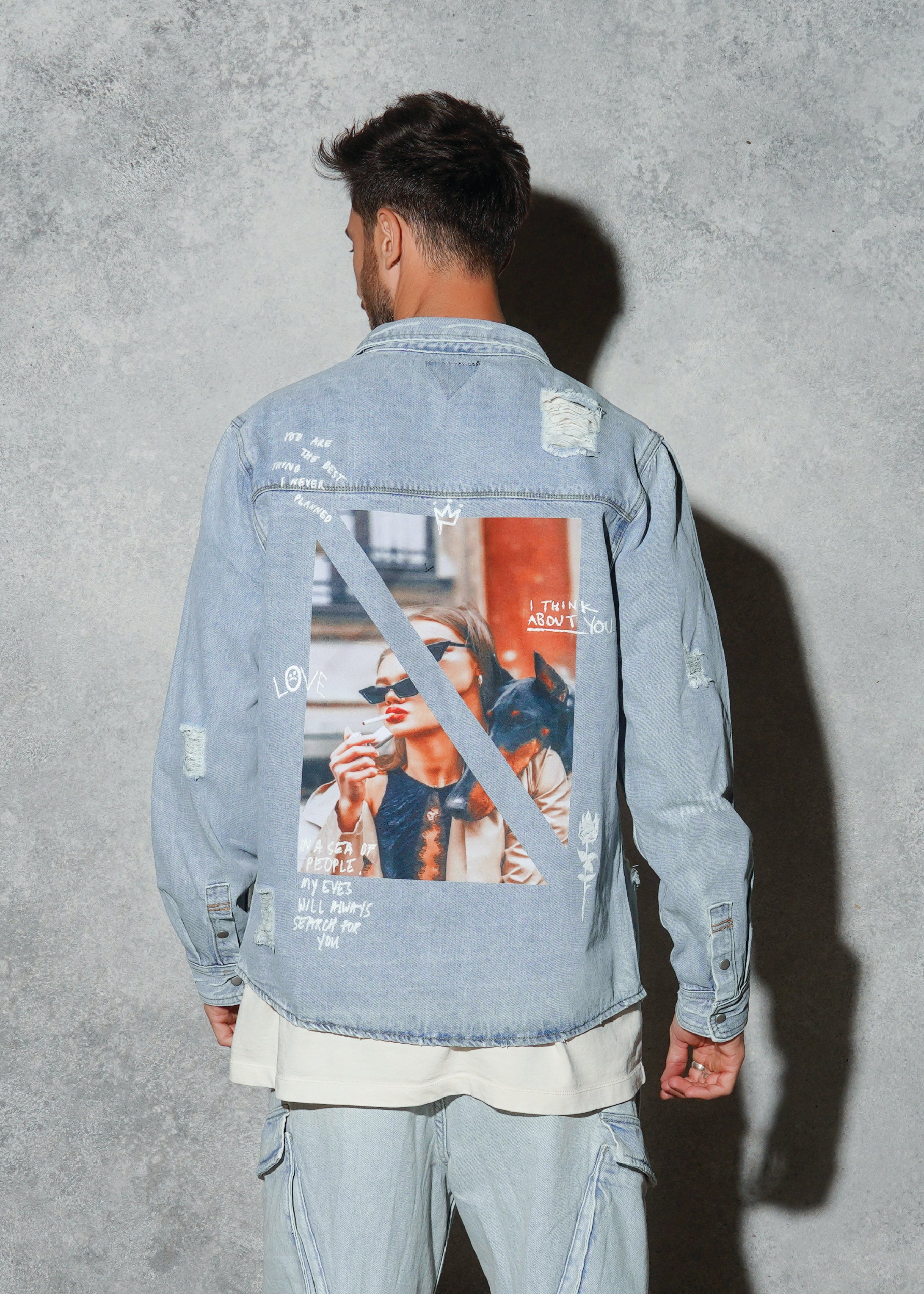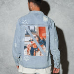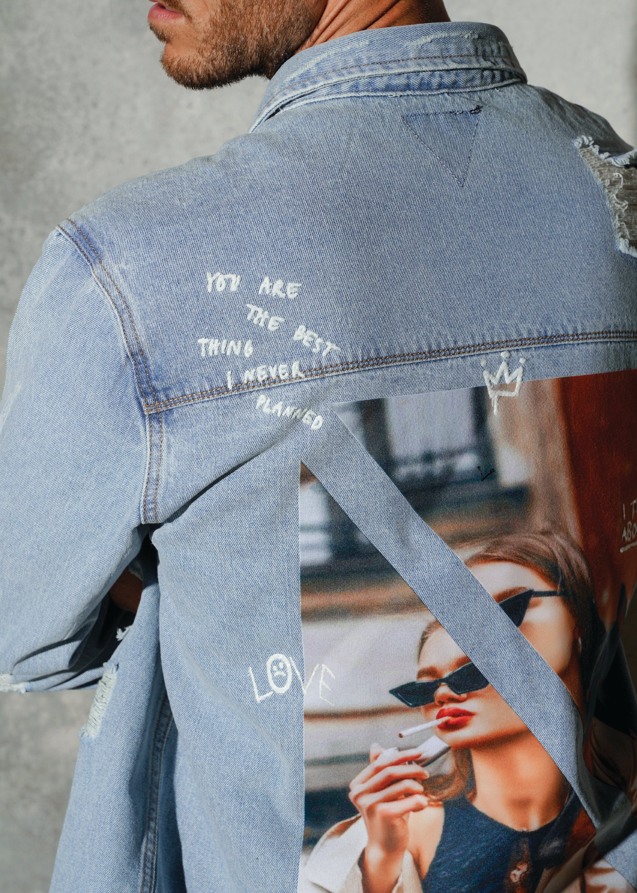 Long Distressed Denim Jacket, crafted distressed hemline,