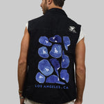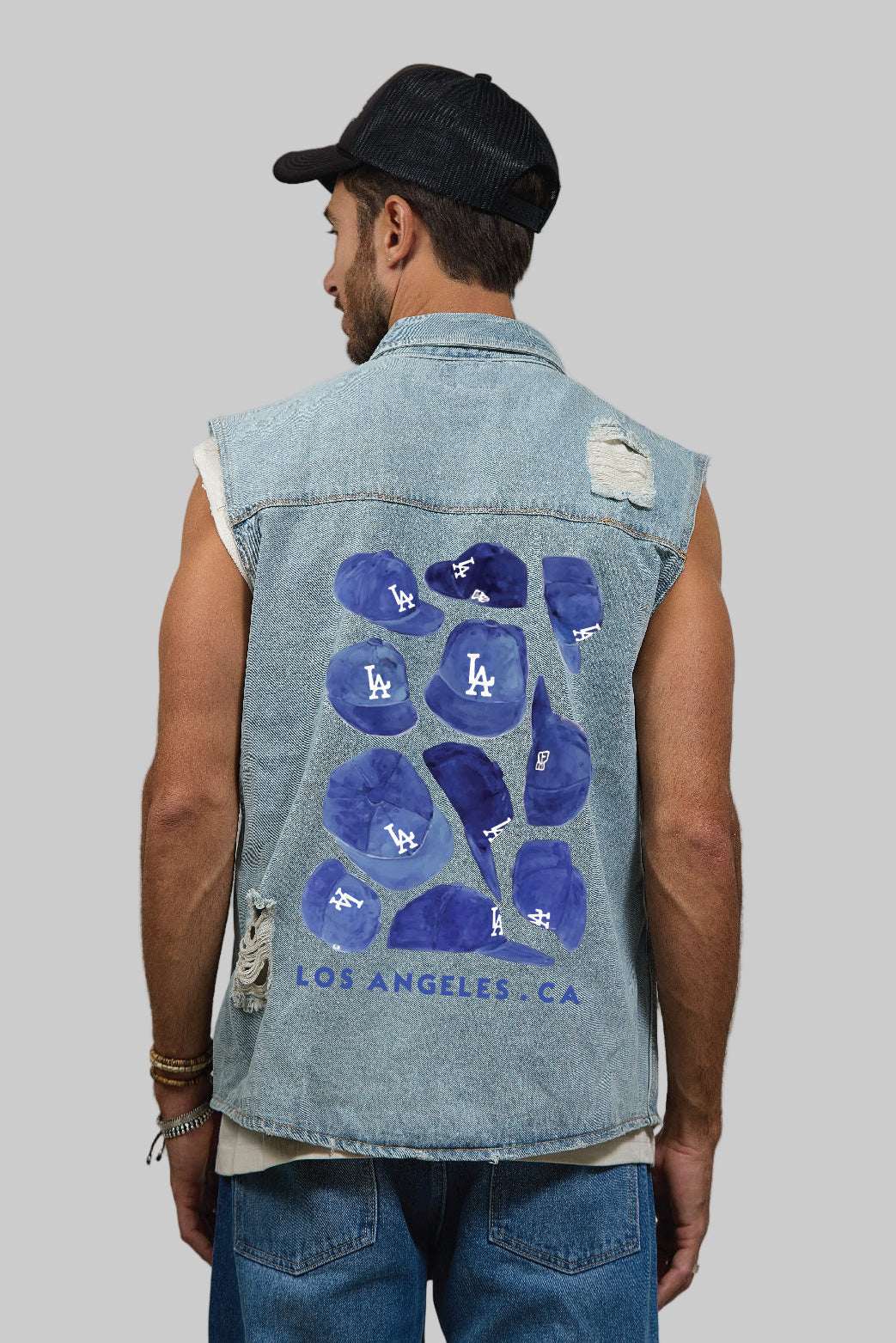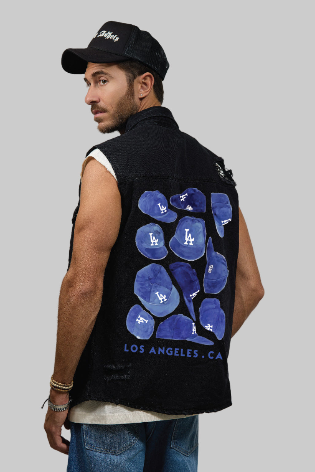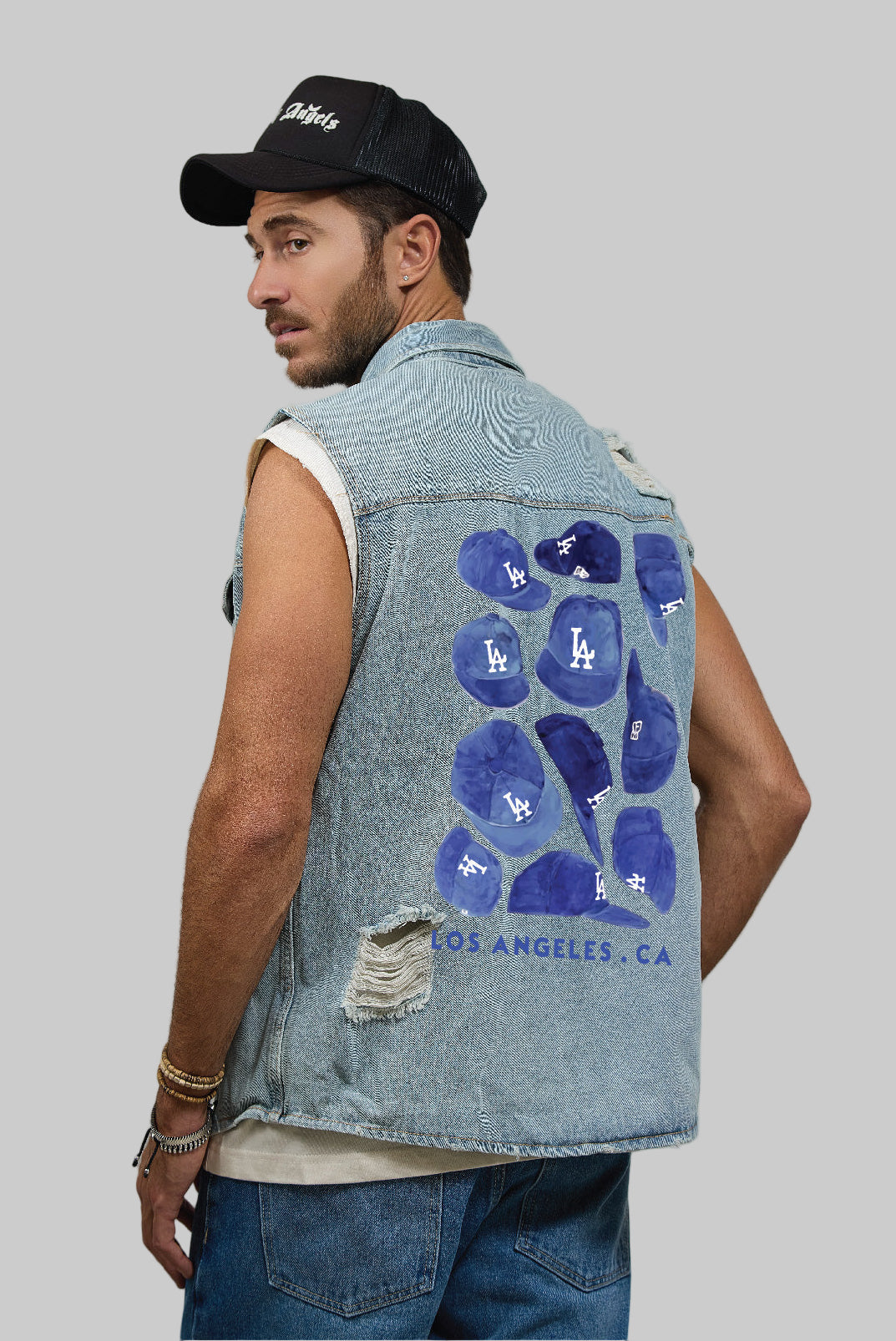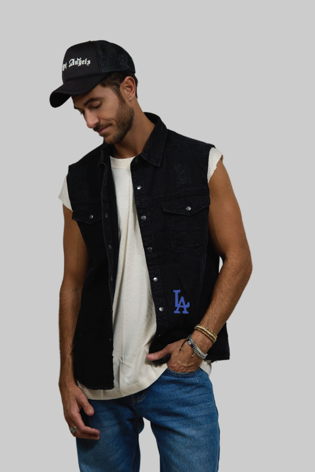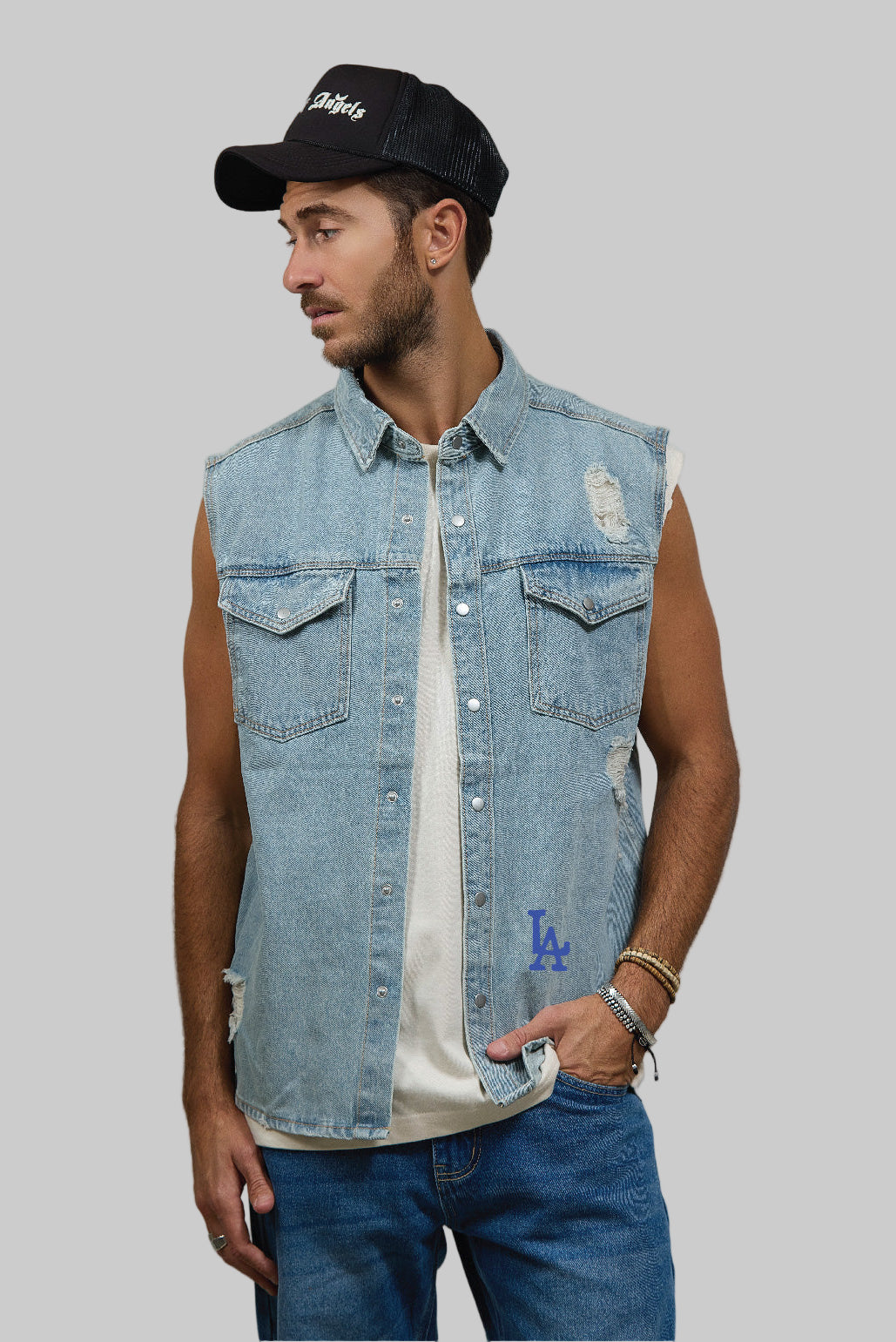 Long Distressed Denim Vest Jacket, crafted distressed hemline,