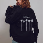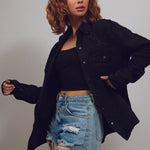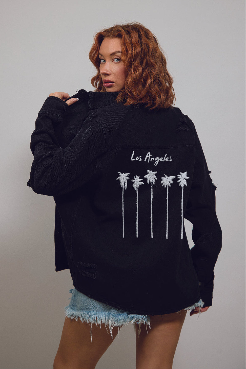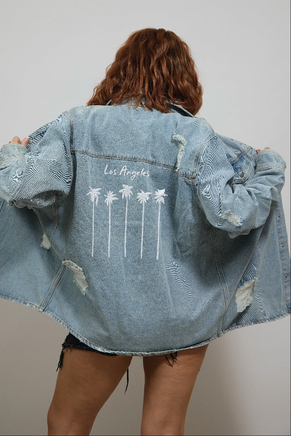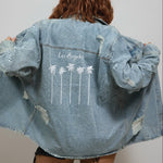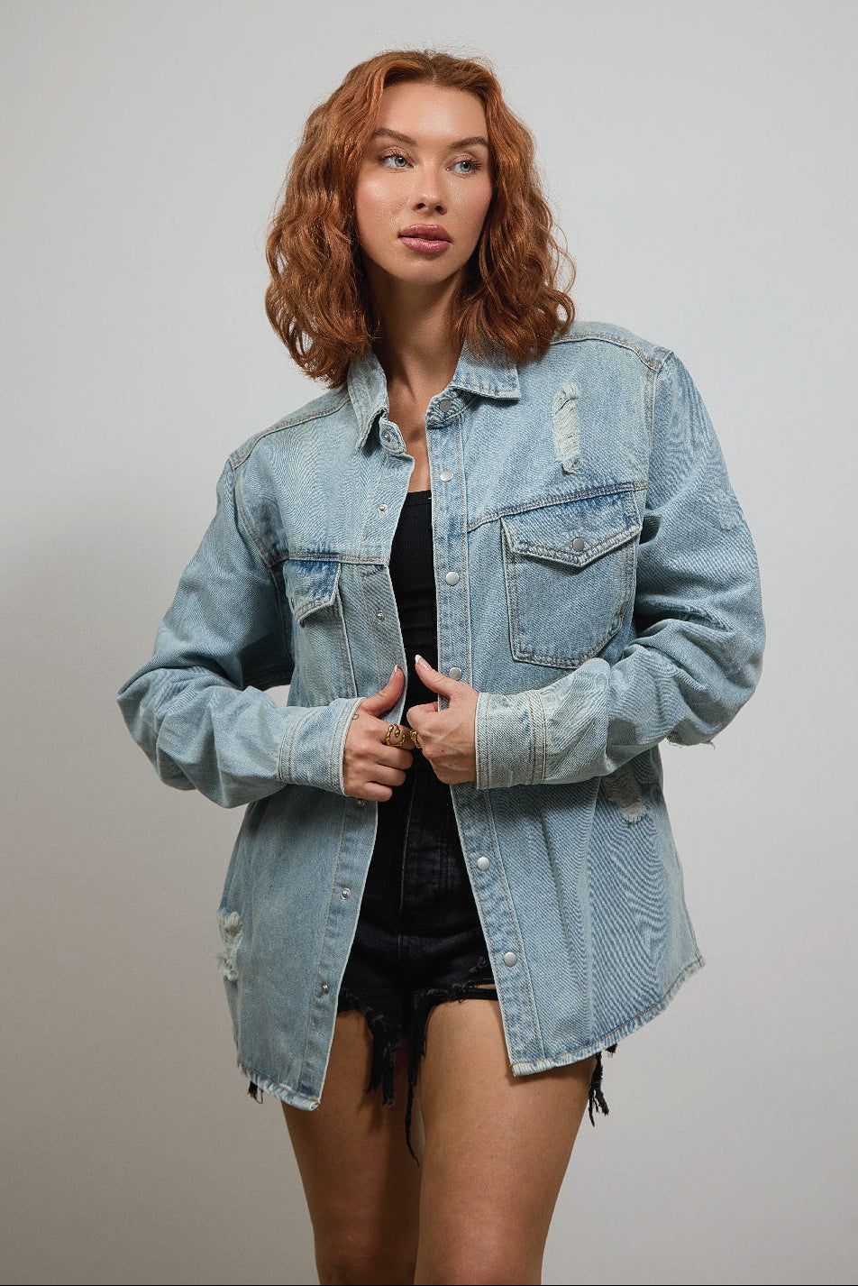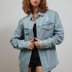 Long Distressed Denim Jacket, crafted distressed hemline,
