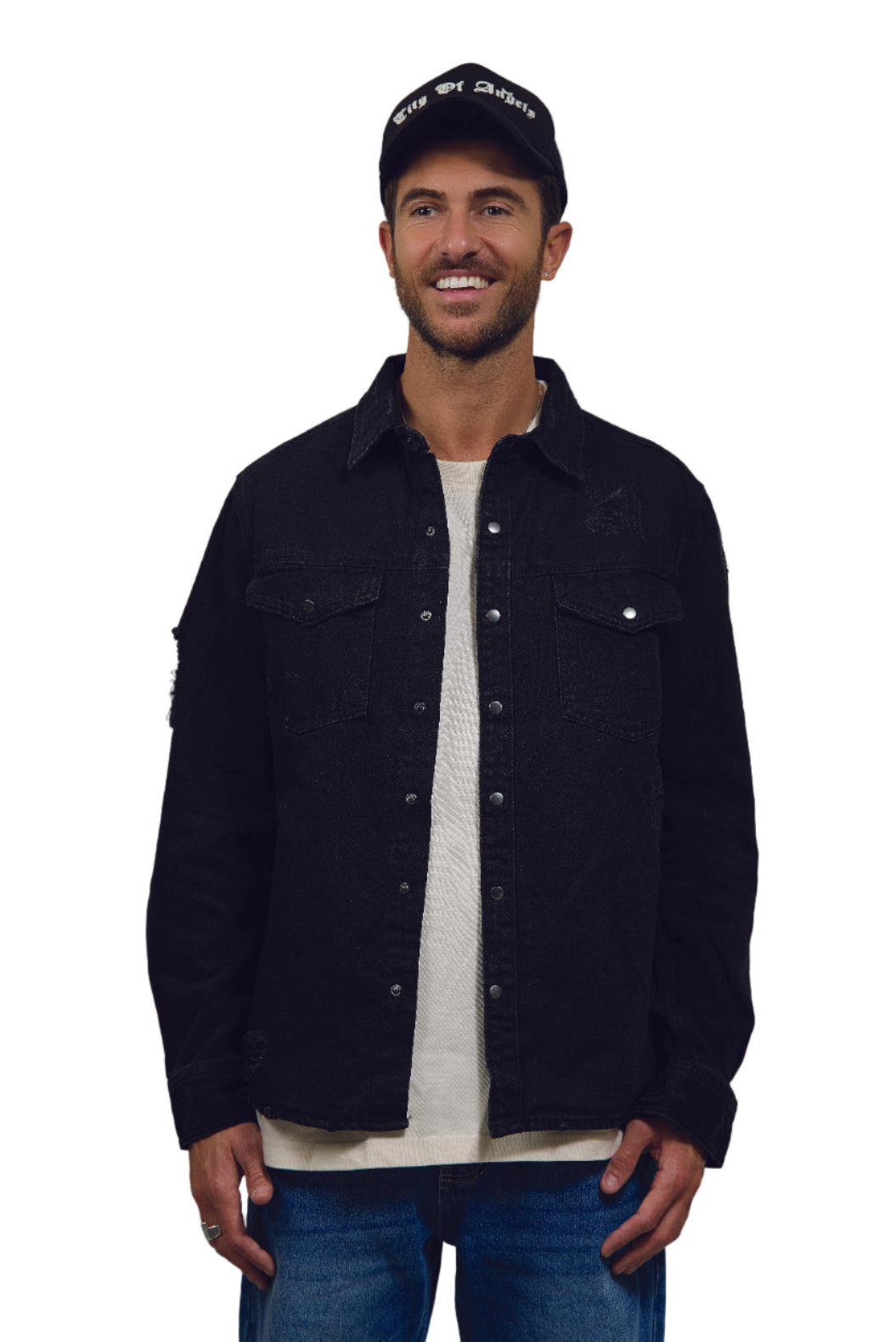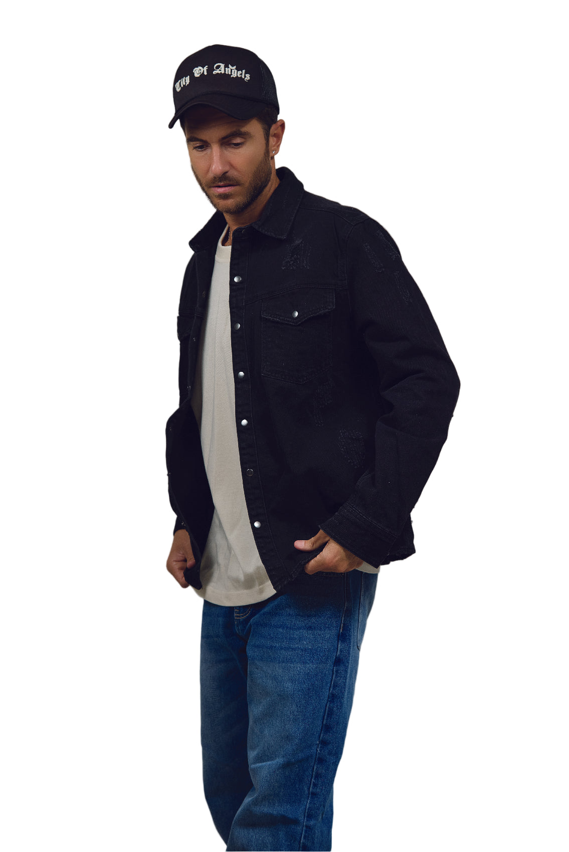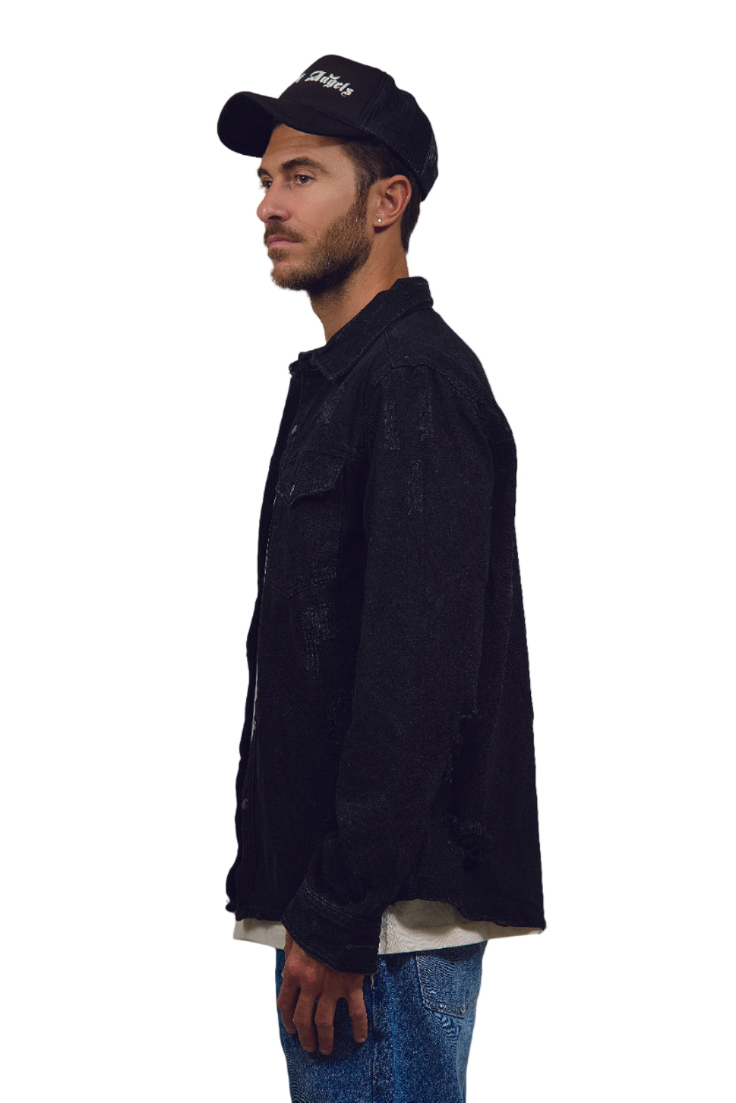 Long Distressed Denim Jacket, crafted distressed hemline,