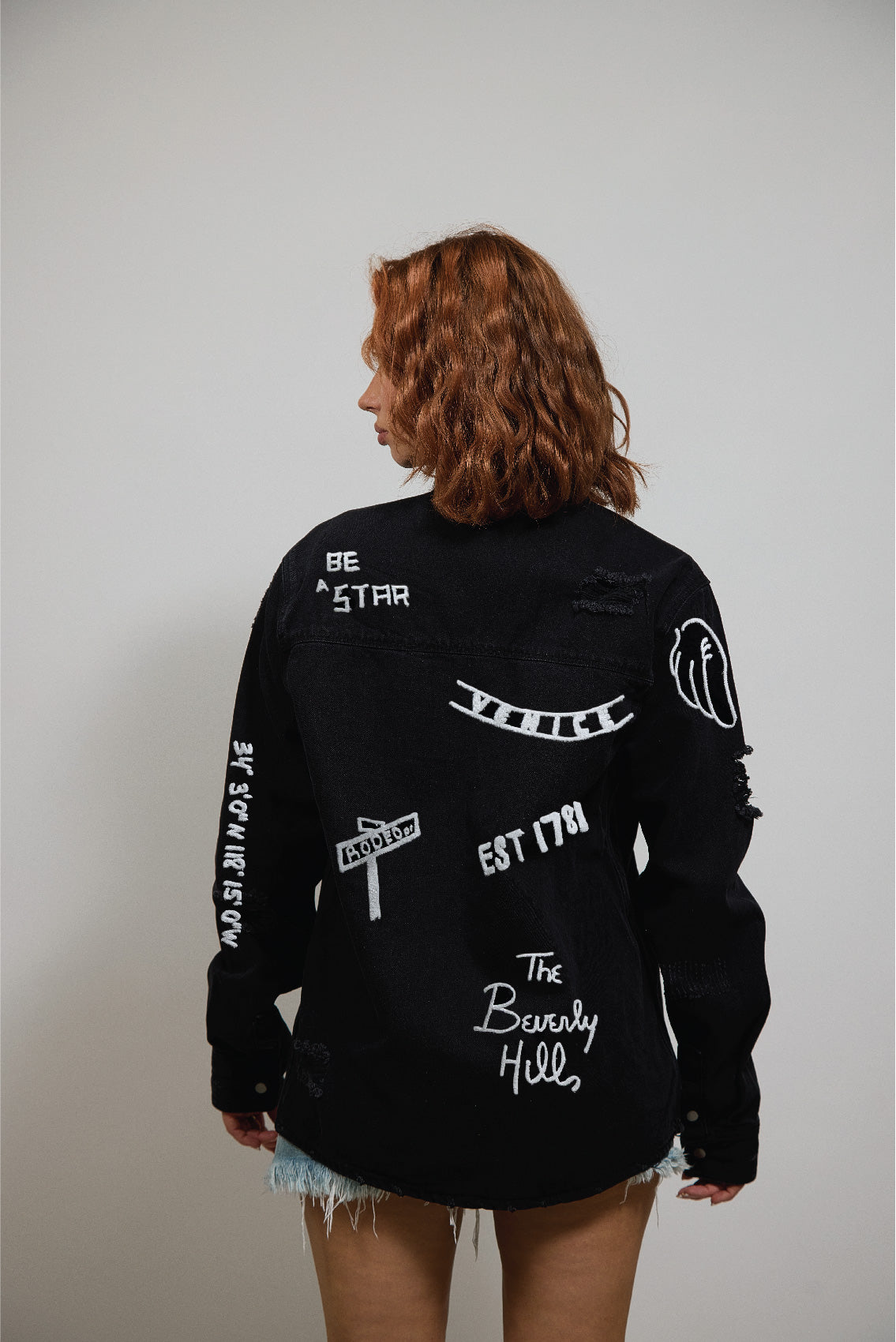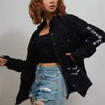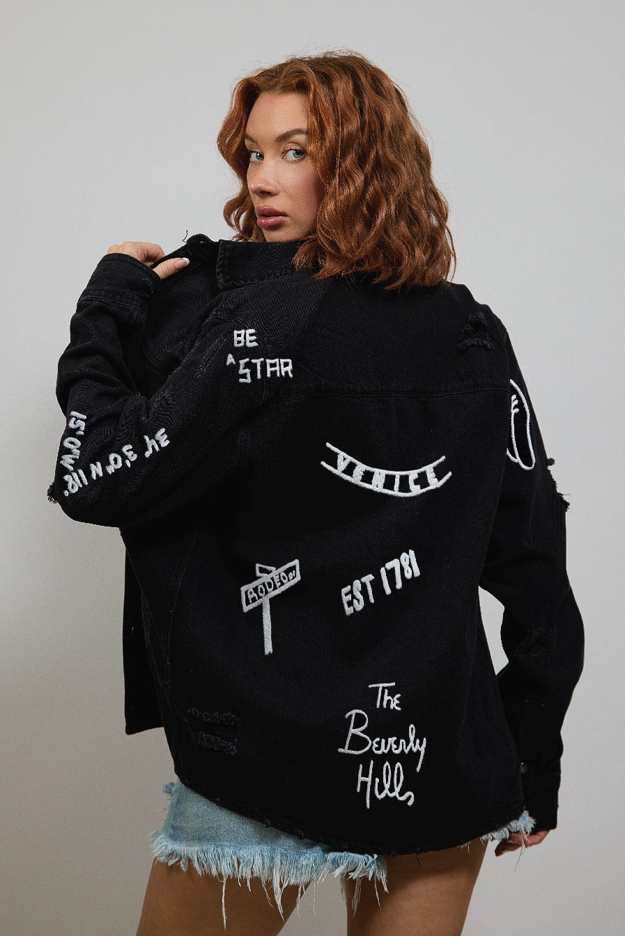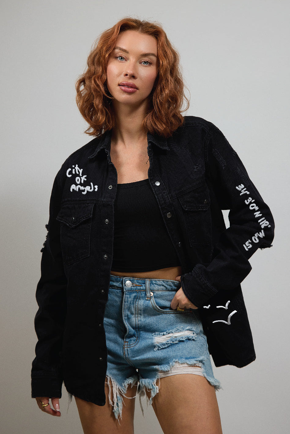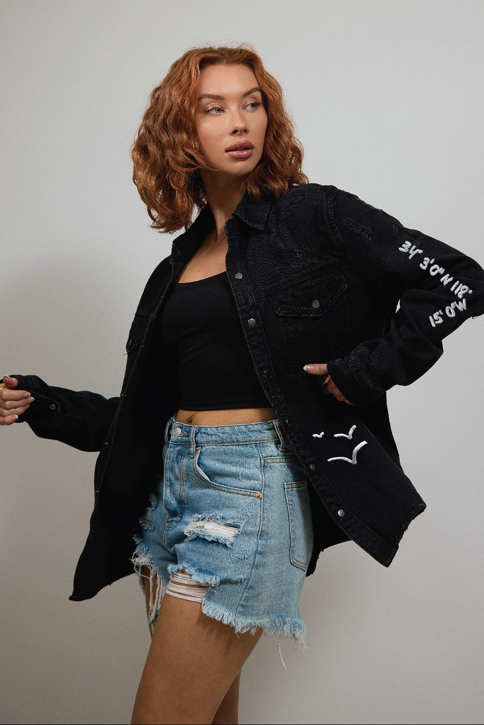 Long Distressed Denim Jacket, crafted distressed hemline,