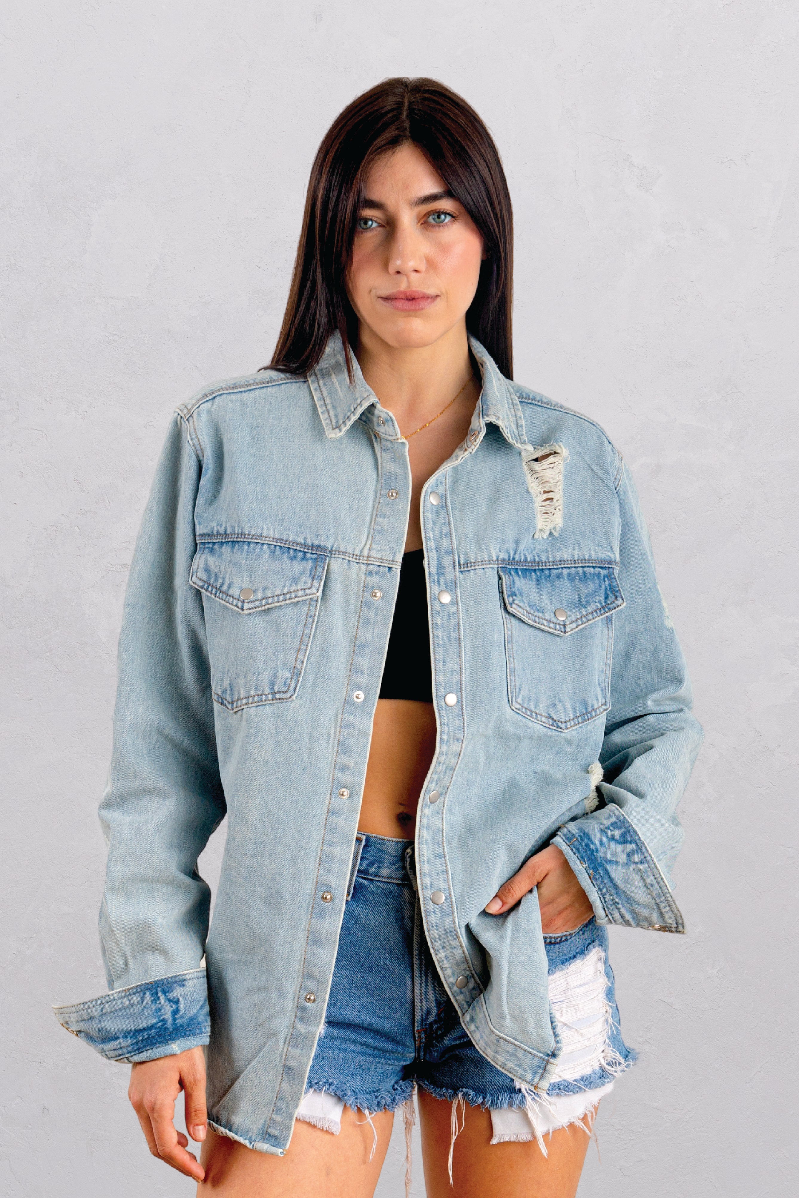 Long Distressed Denim Jacket, crafted distressed hemline,