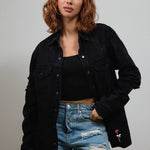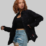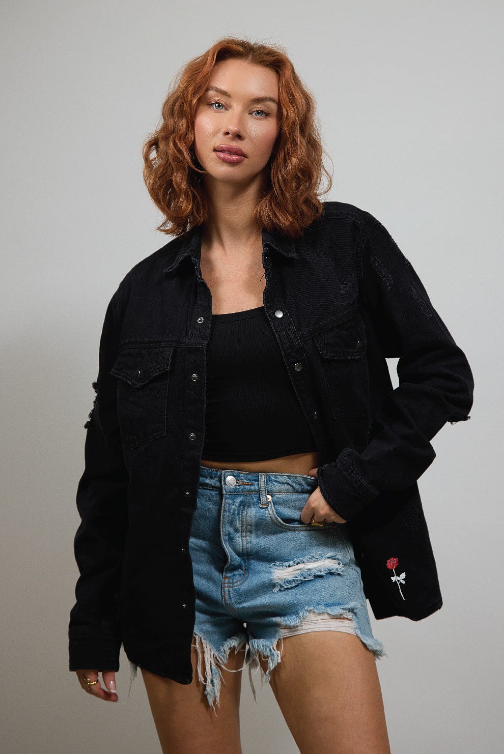 Long Distressed Denim Jacket, crafted distressed hemline,