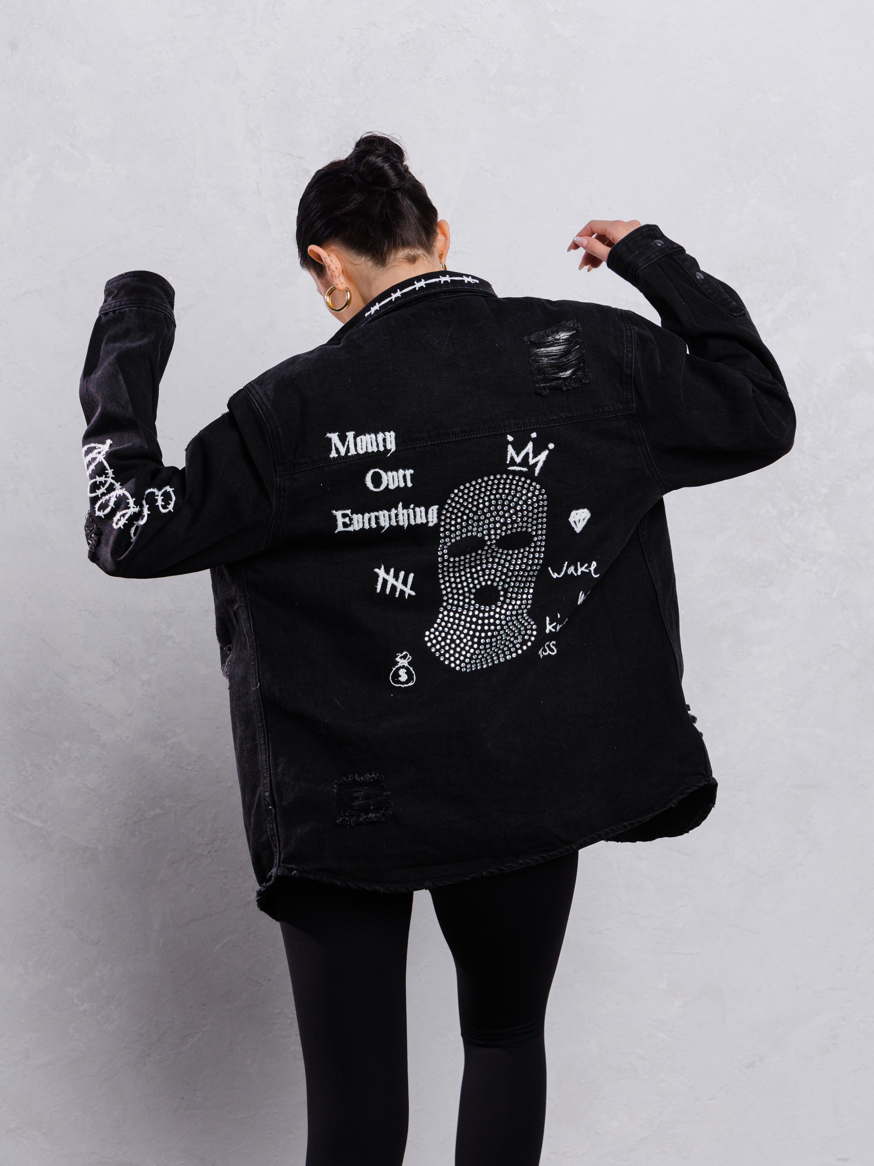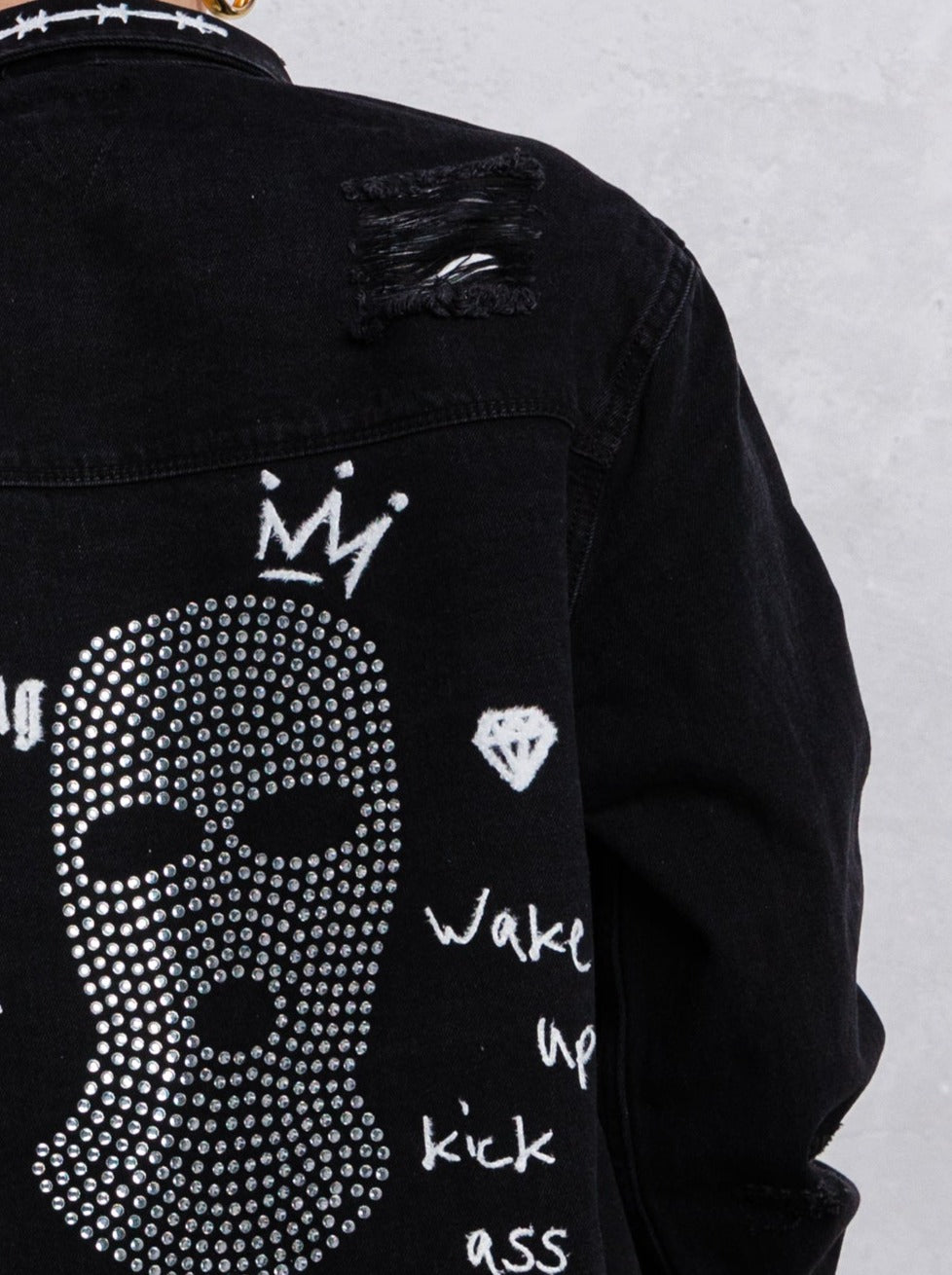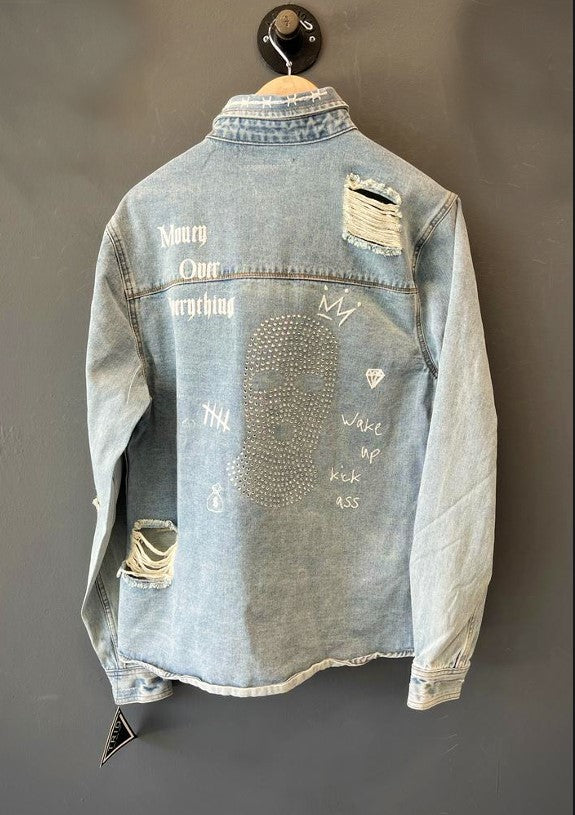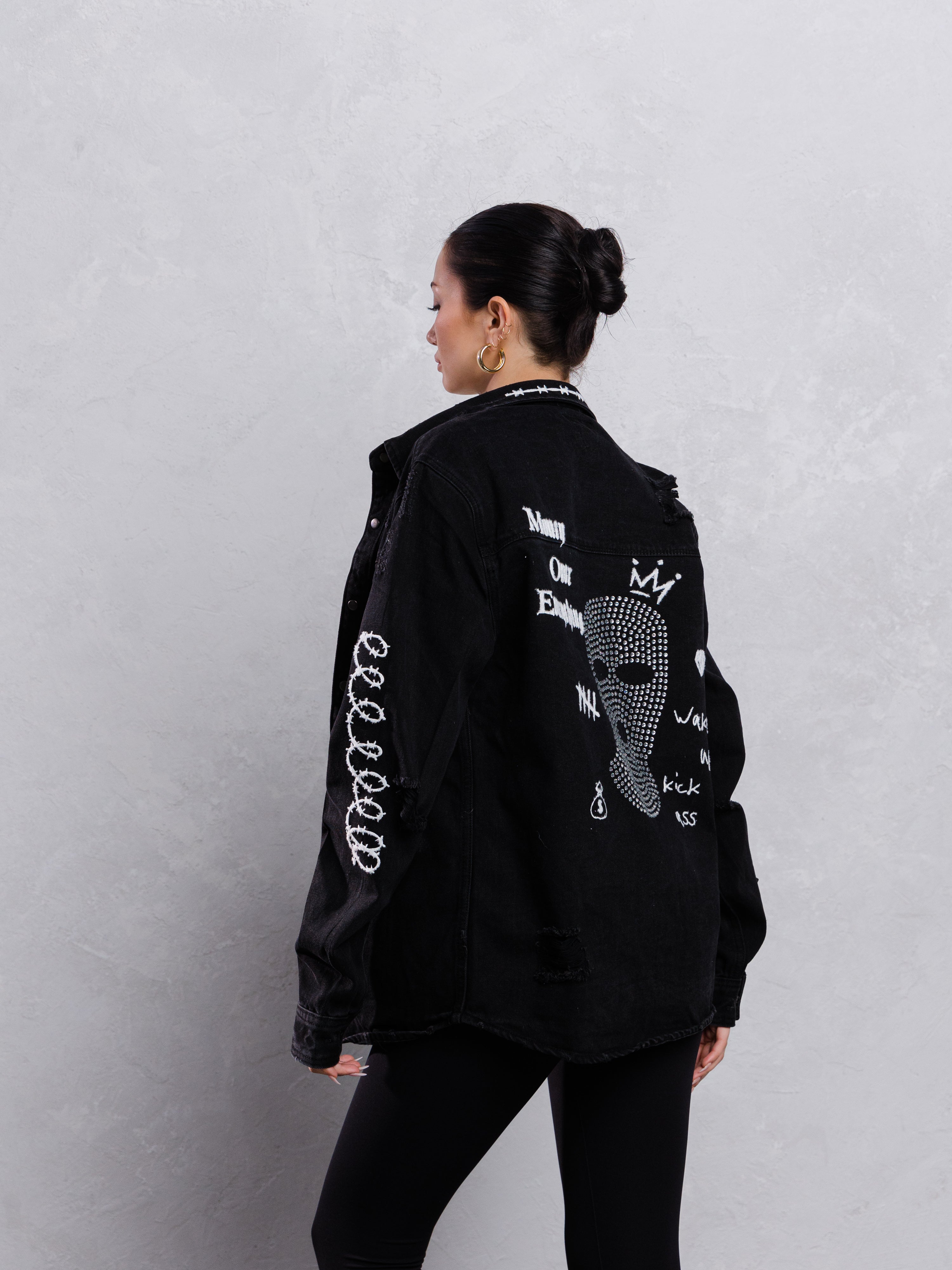 Long Distressed Denim Jacket, crafted distressed hemline,