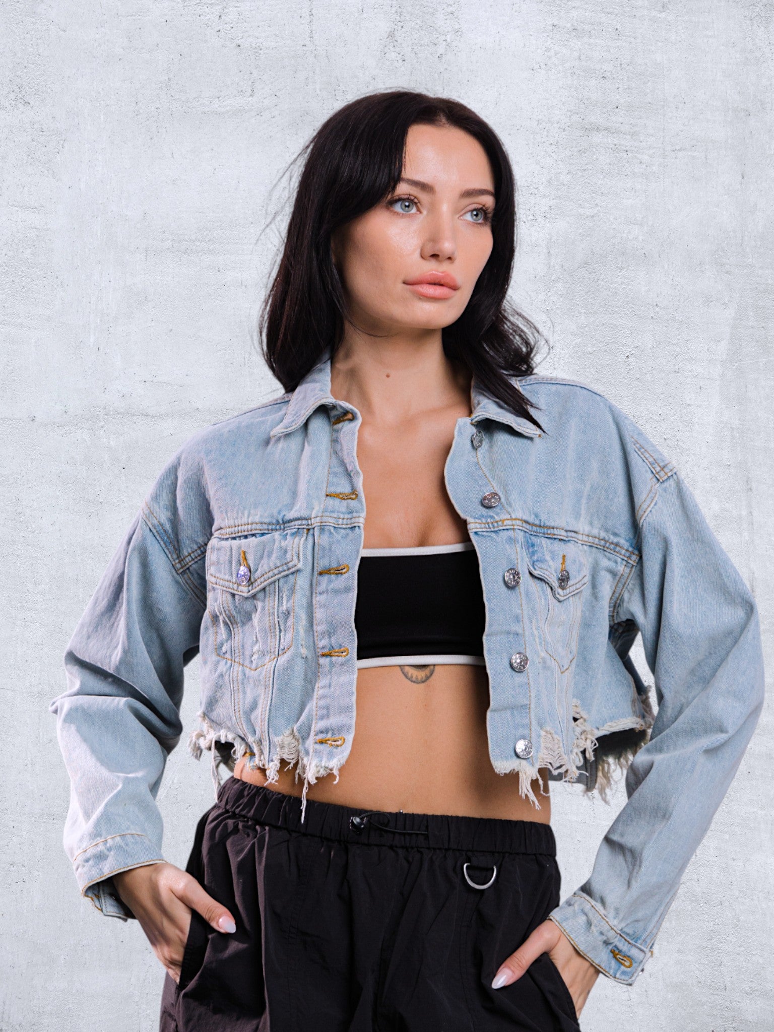 Cropped Distressed Denim Jacket, crafted distressed hemline,