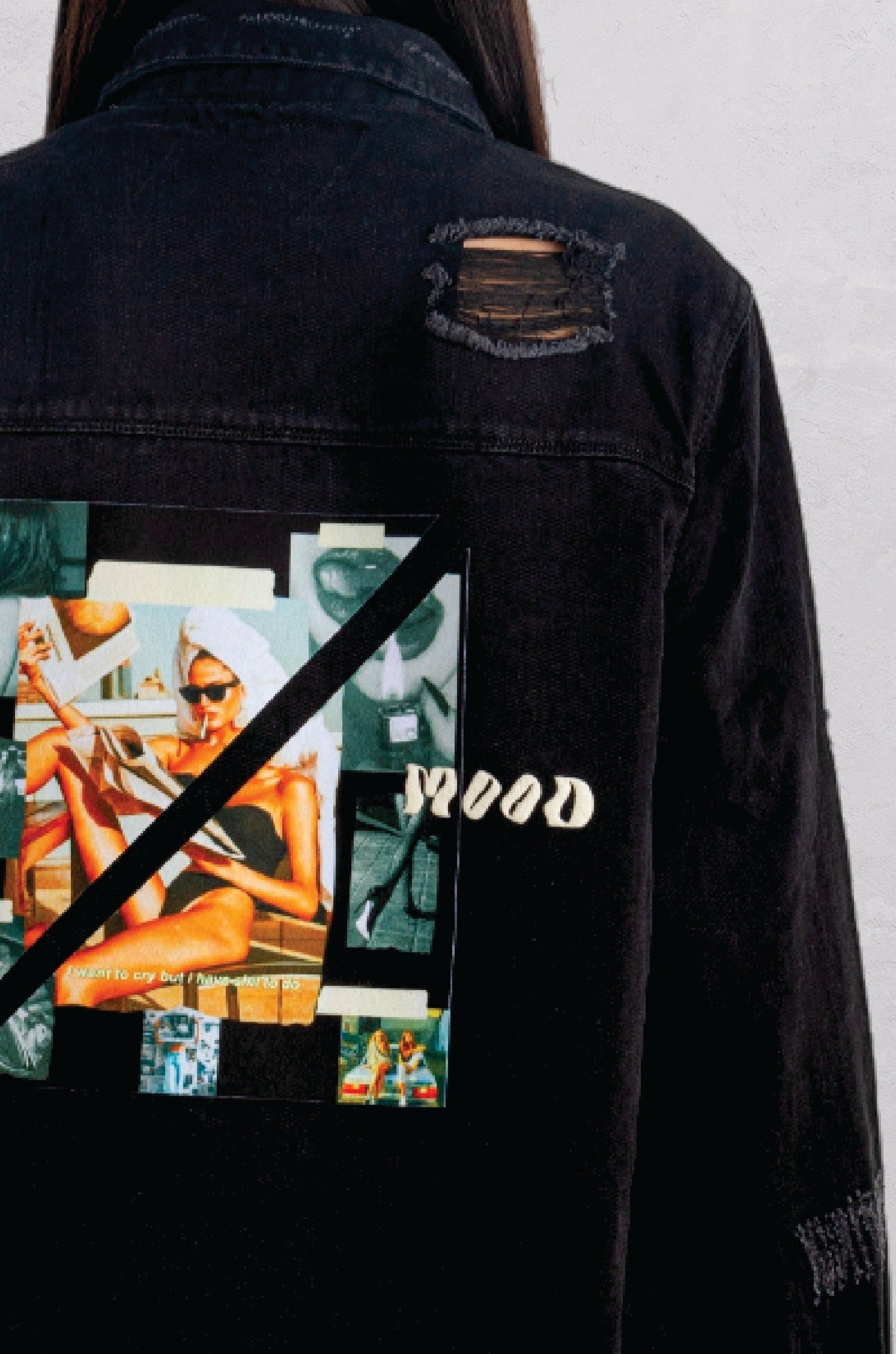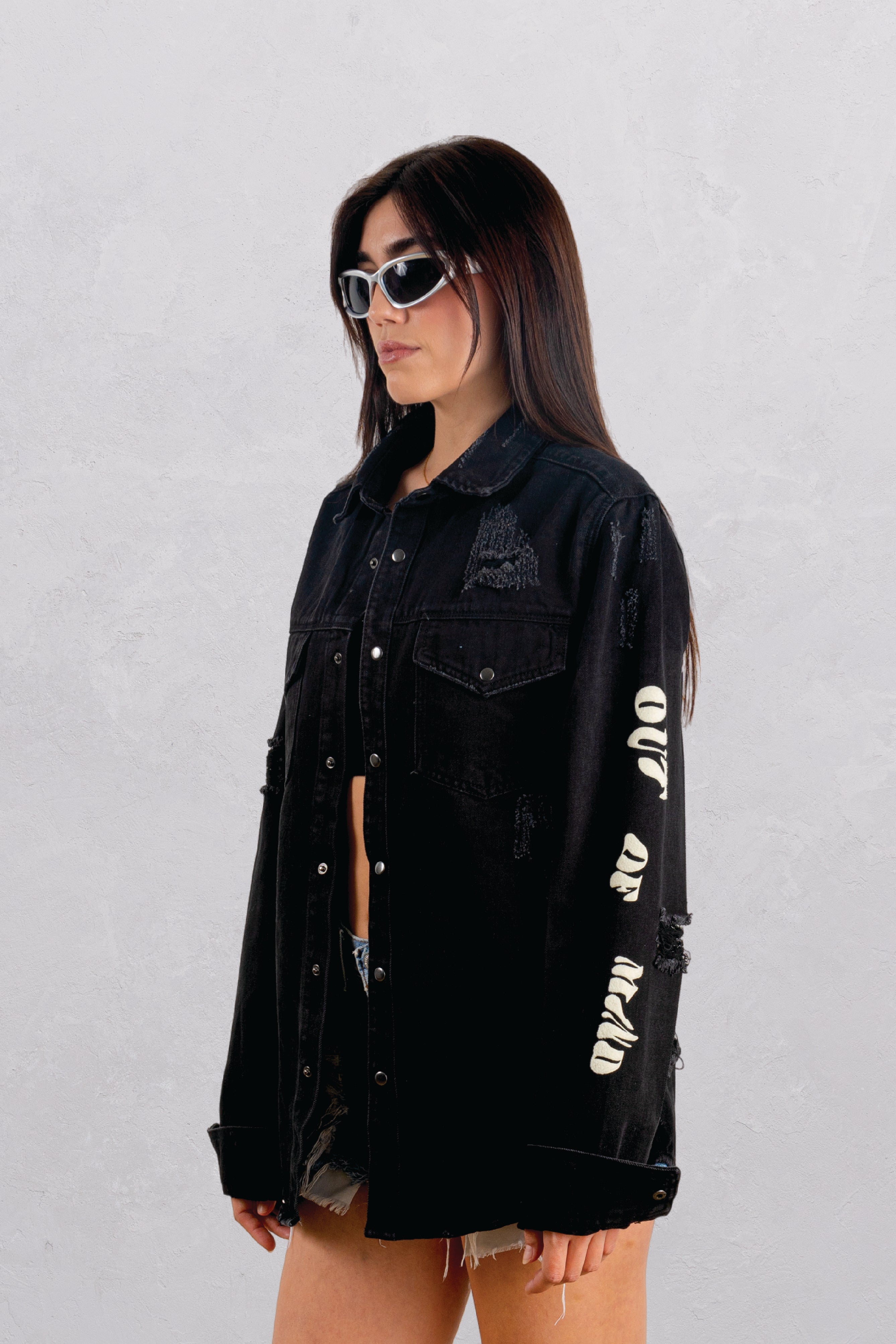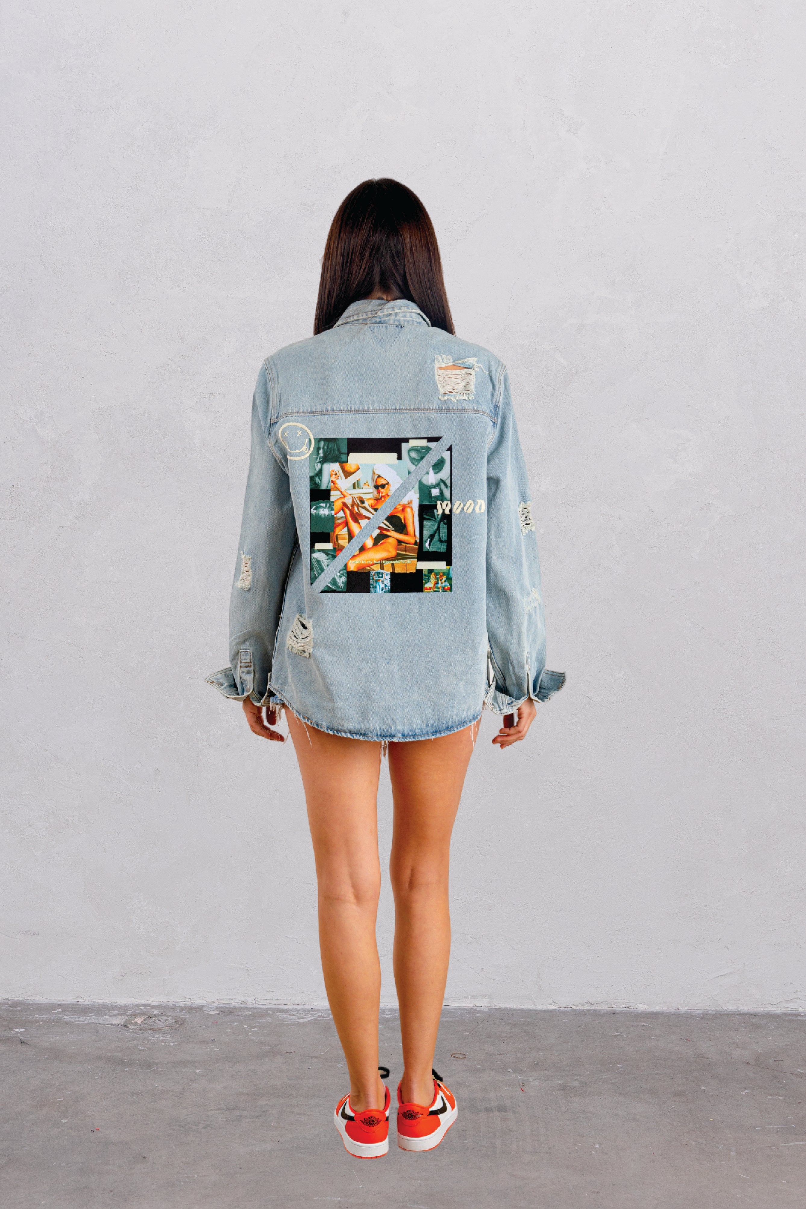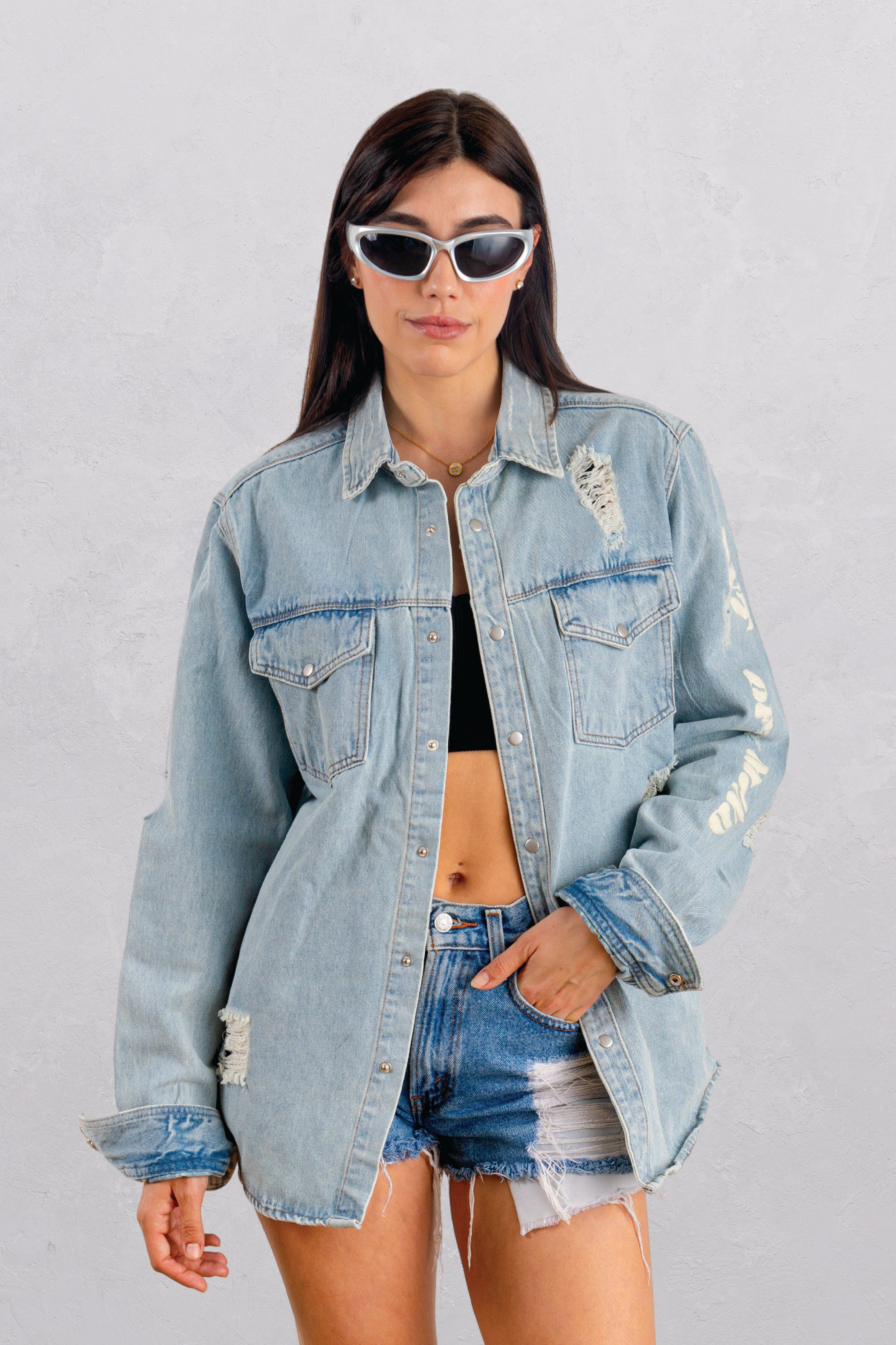 Long Distressed Denim Jacket, crafted distressed hemline,