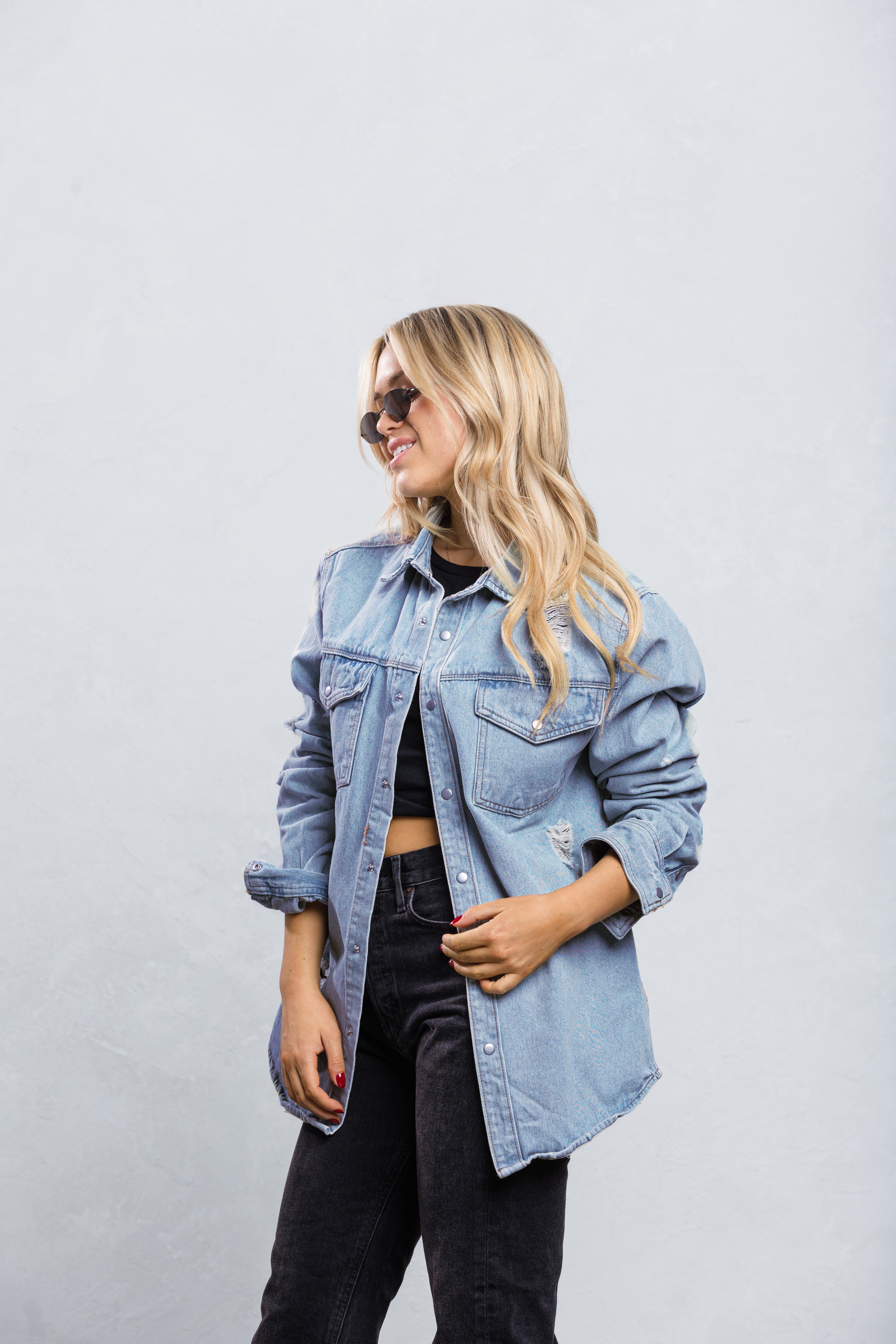 Long Distressed Denim Jacket, crafted distressed hemline,