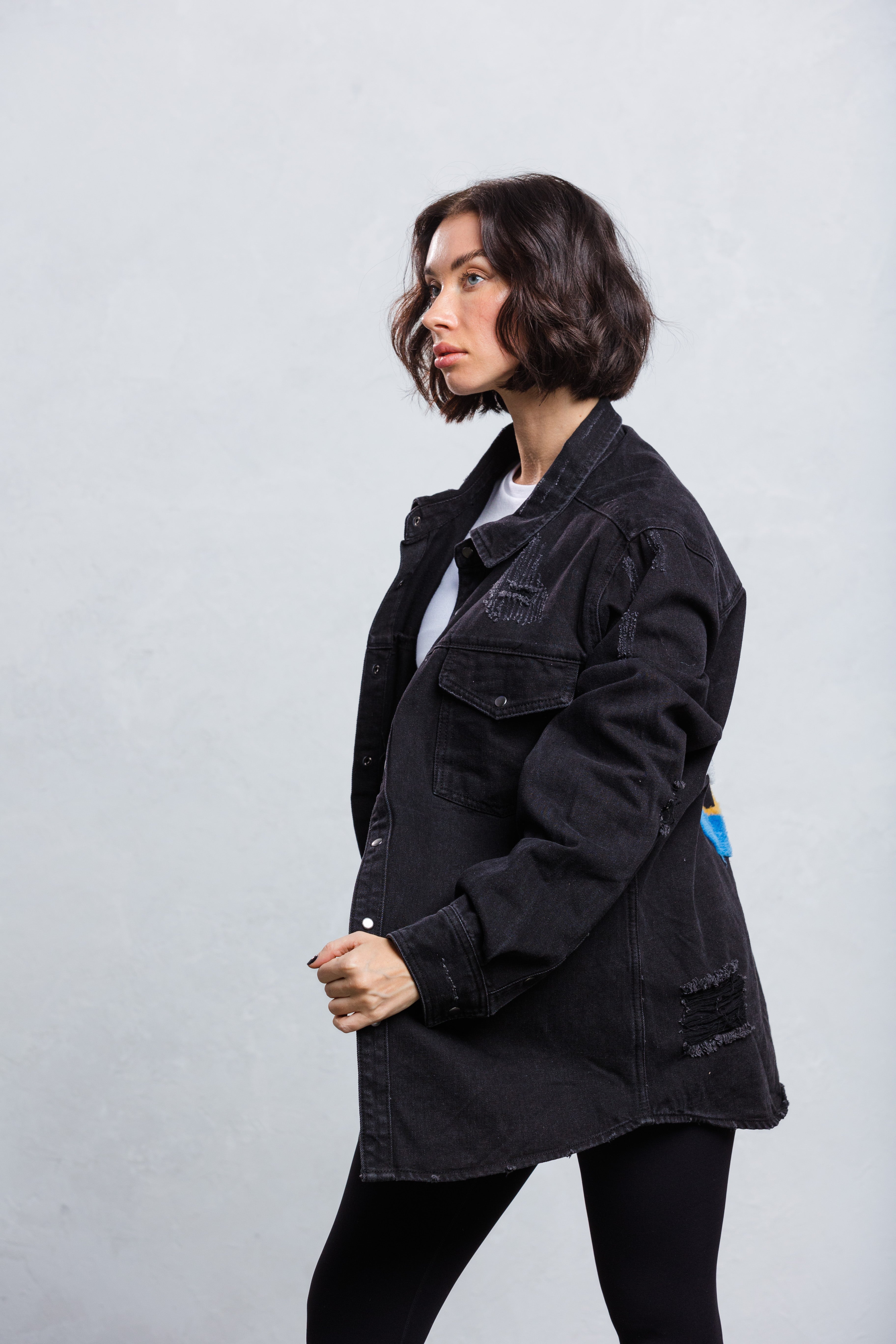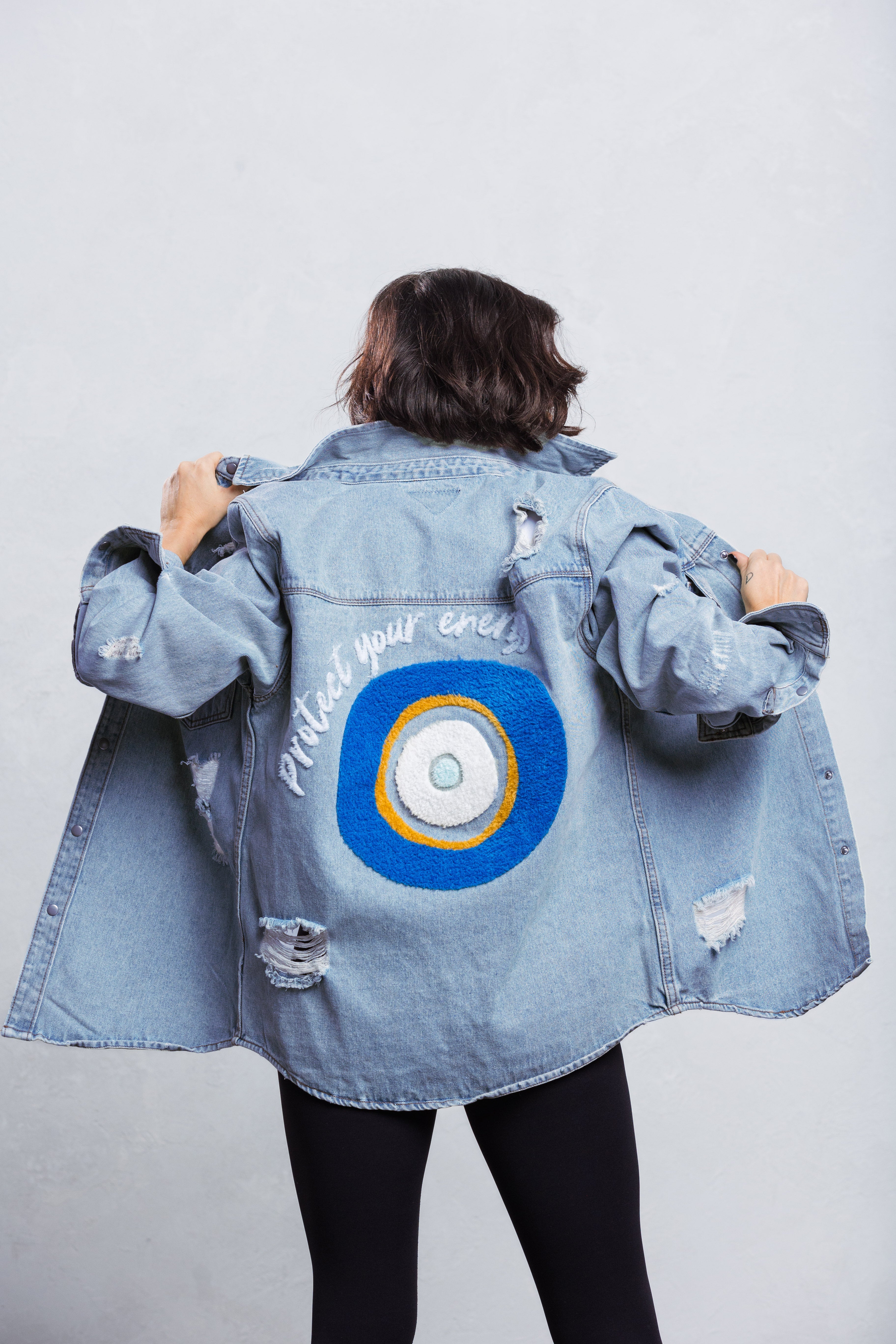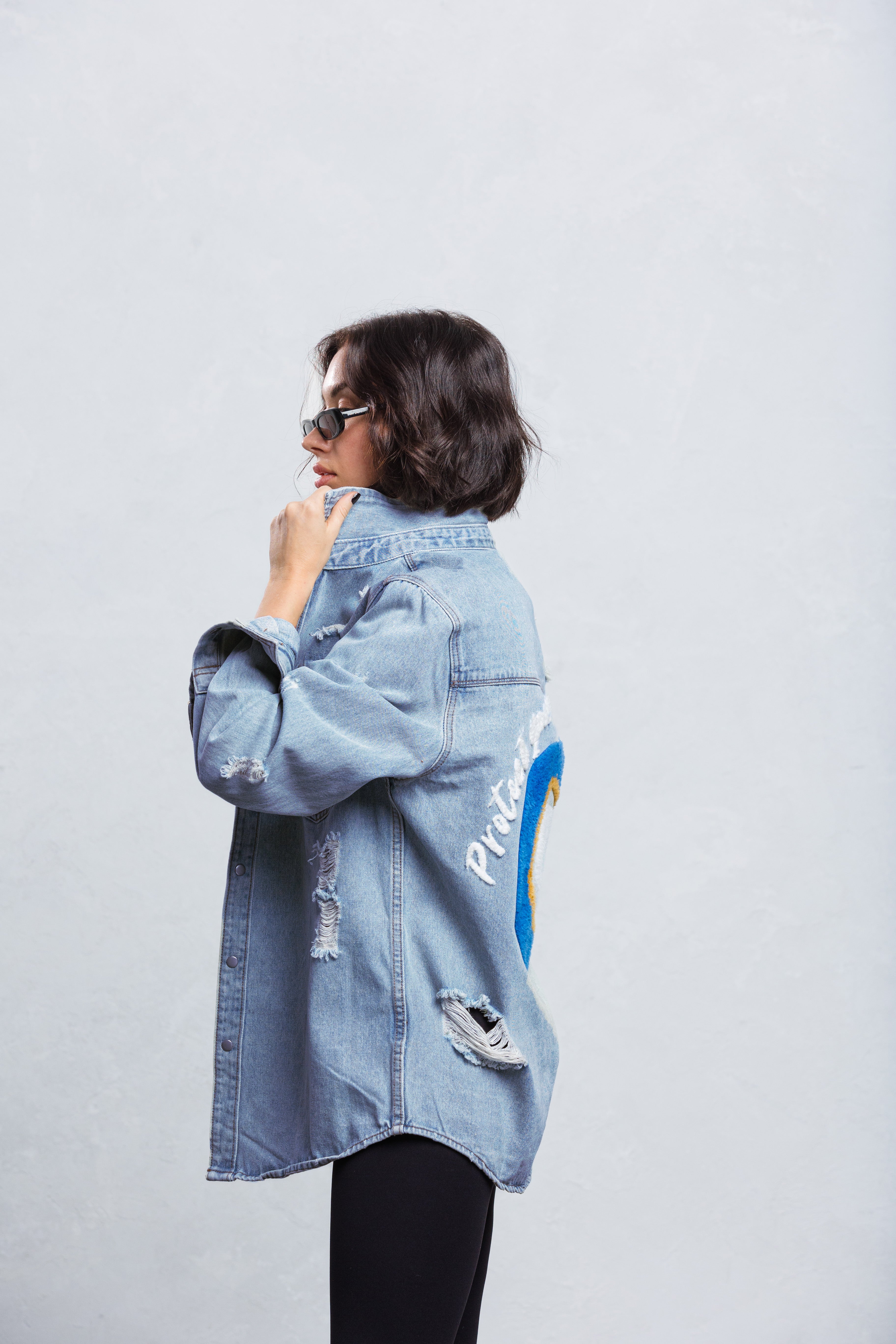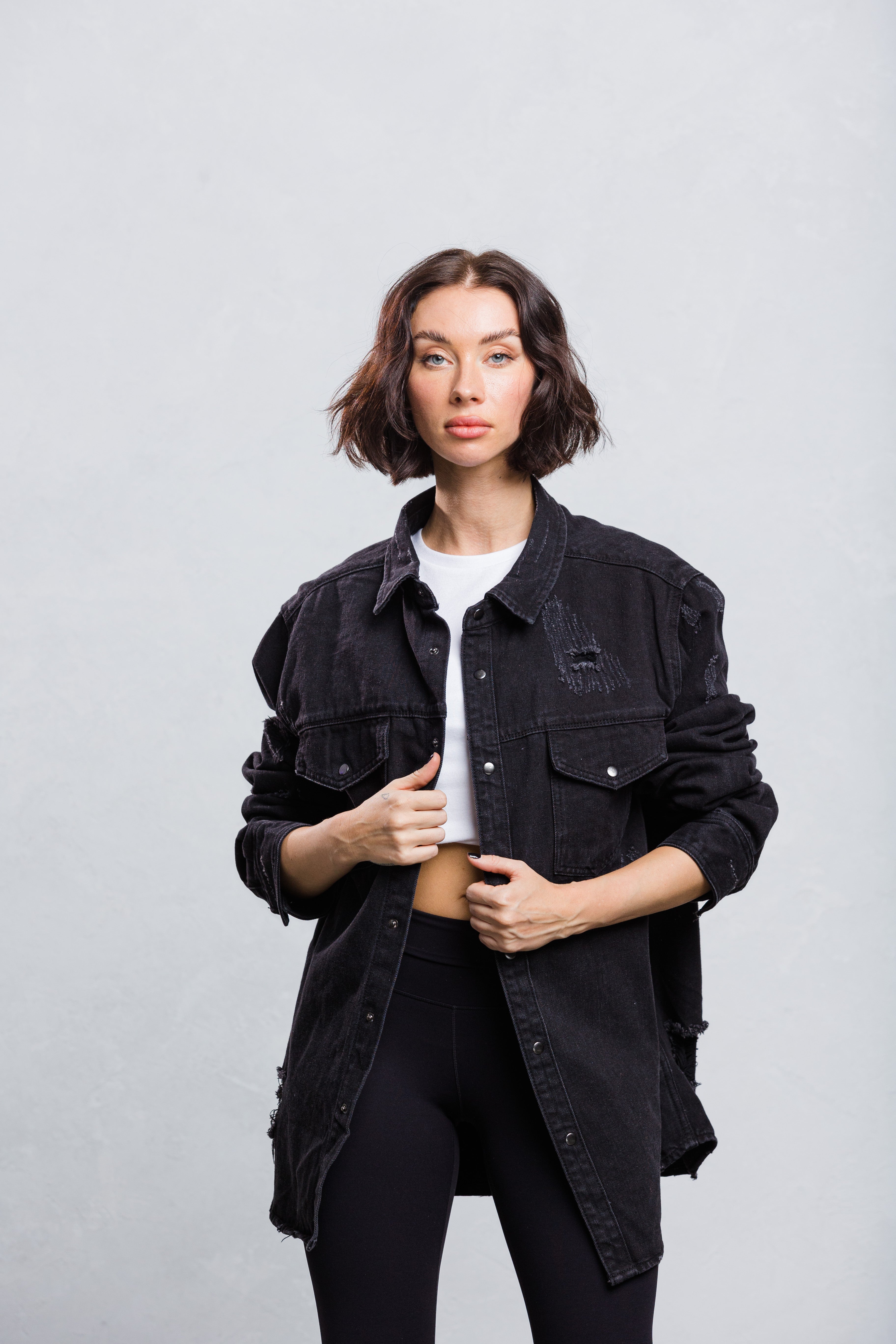 Long Distressed Denim Jacket, crafted distressed hemline,