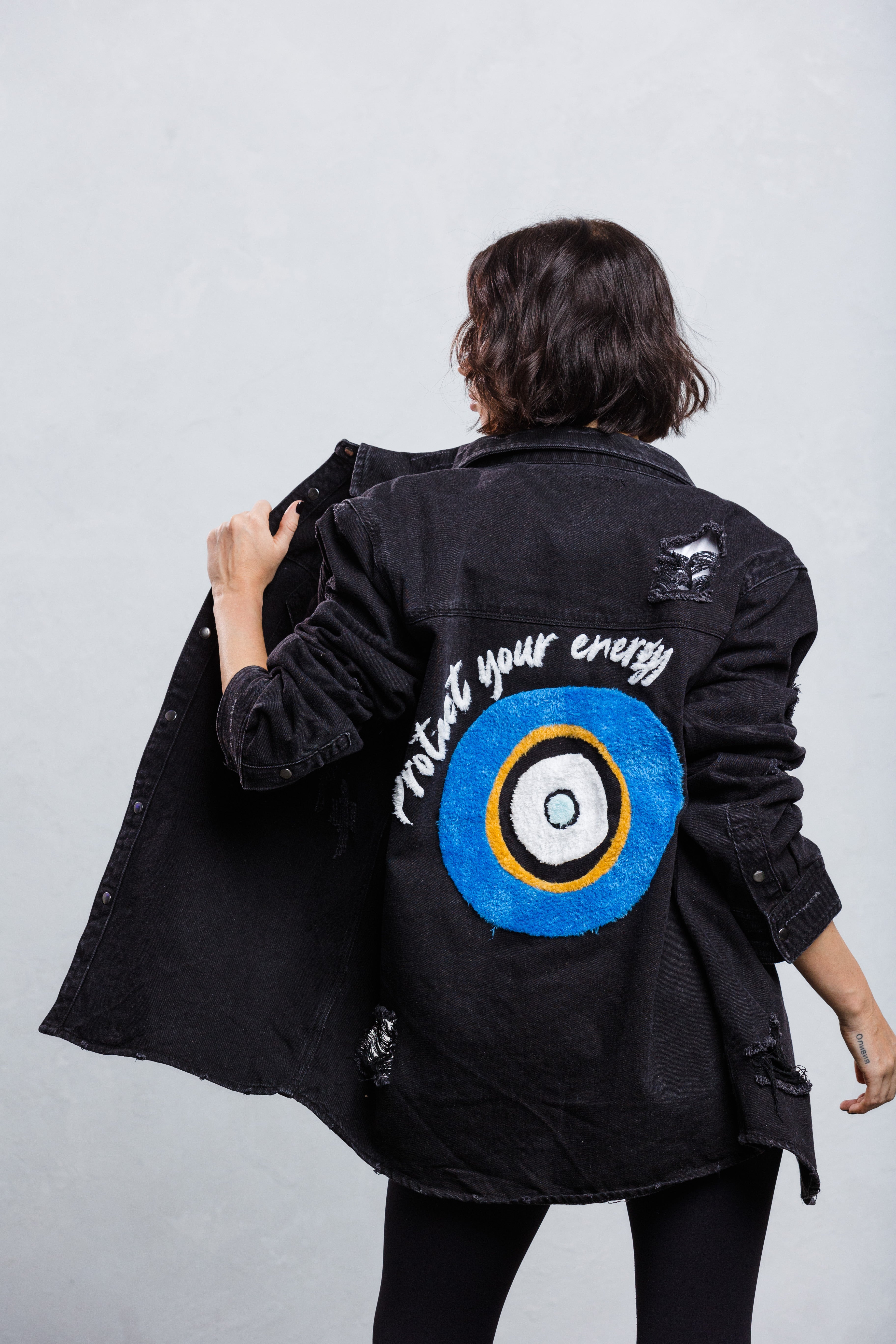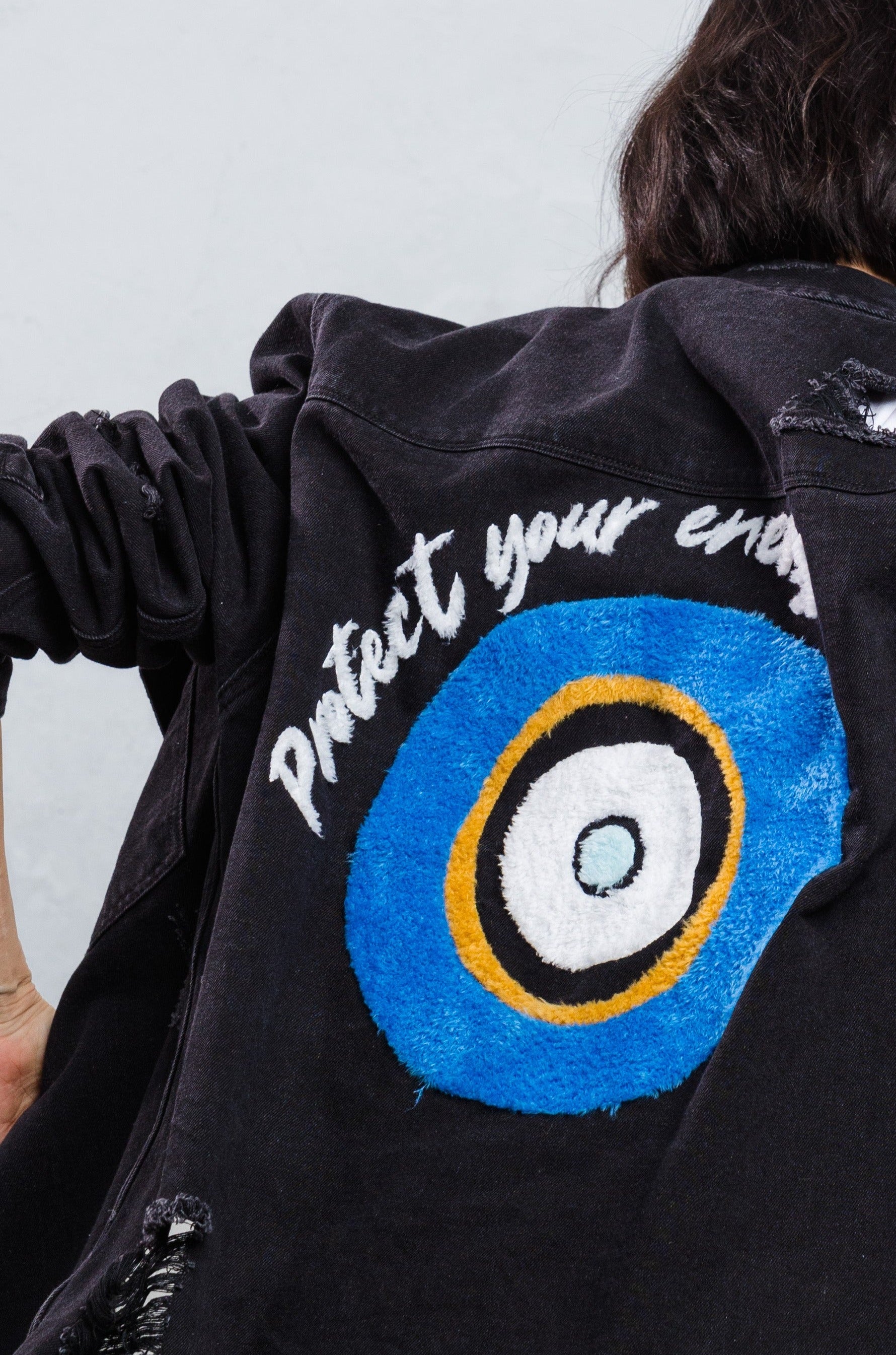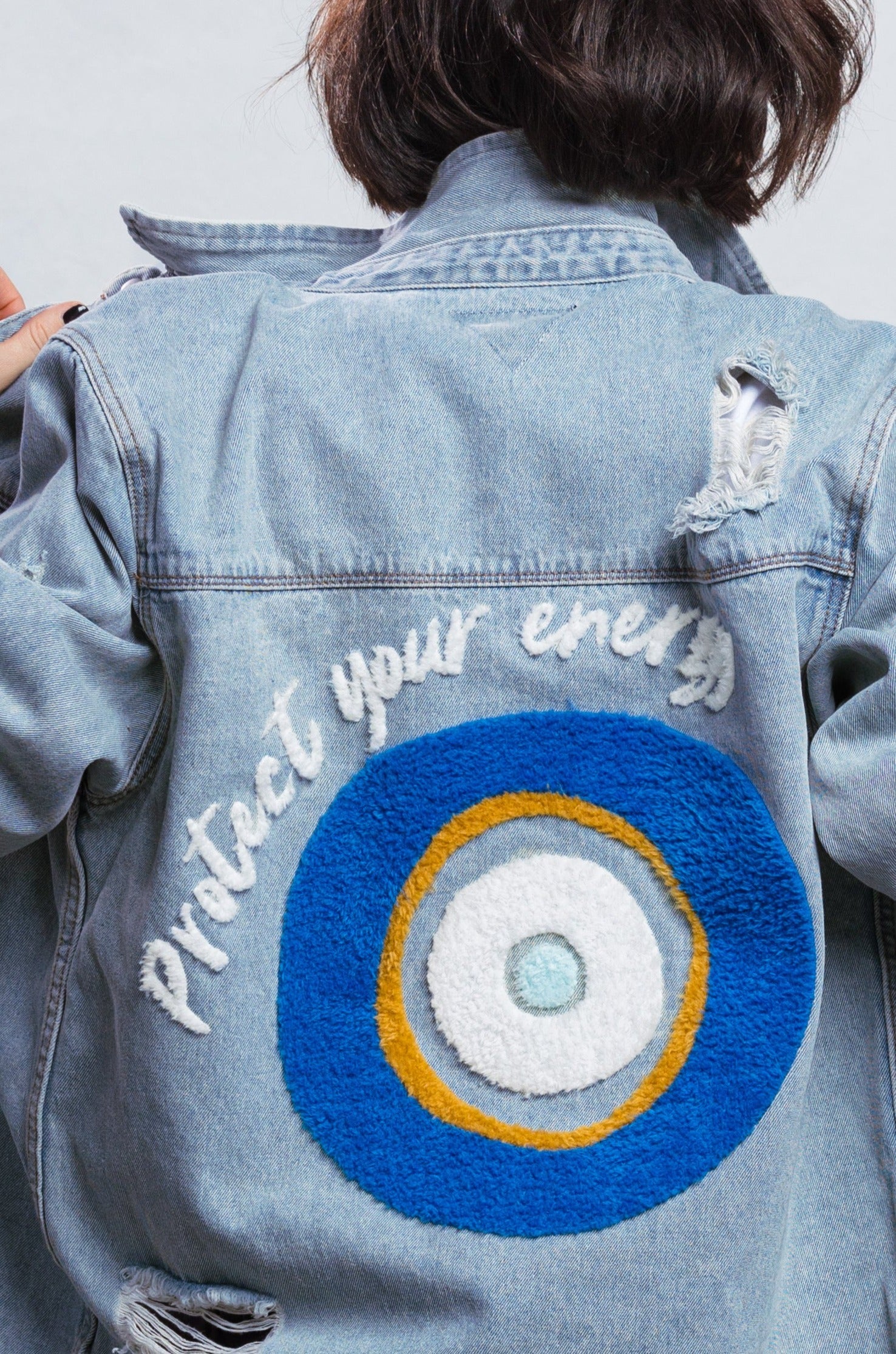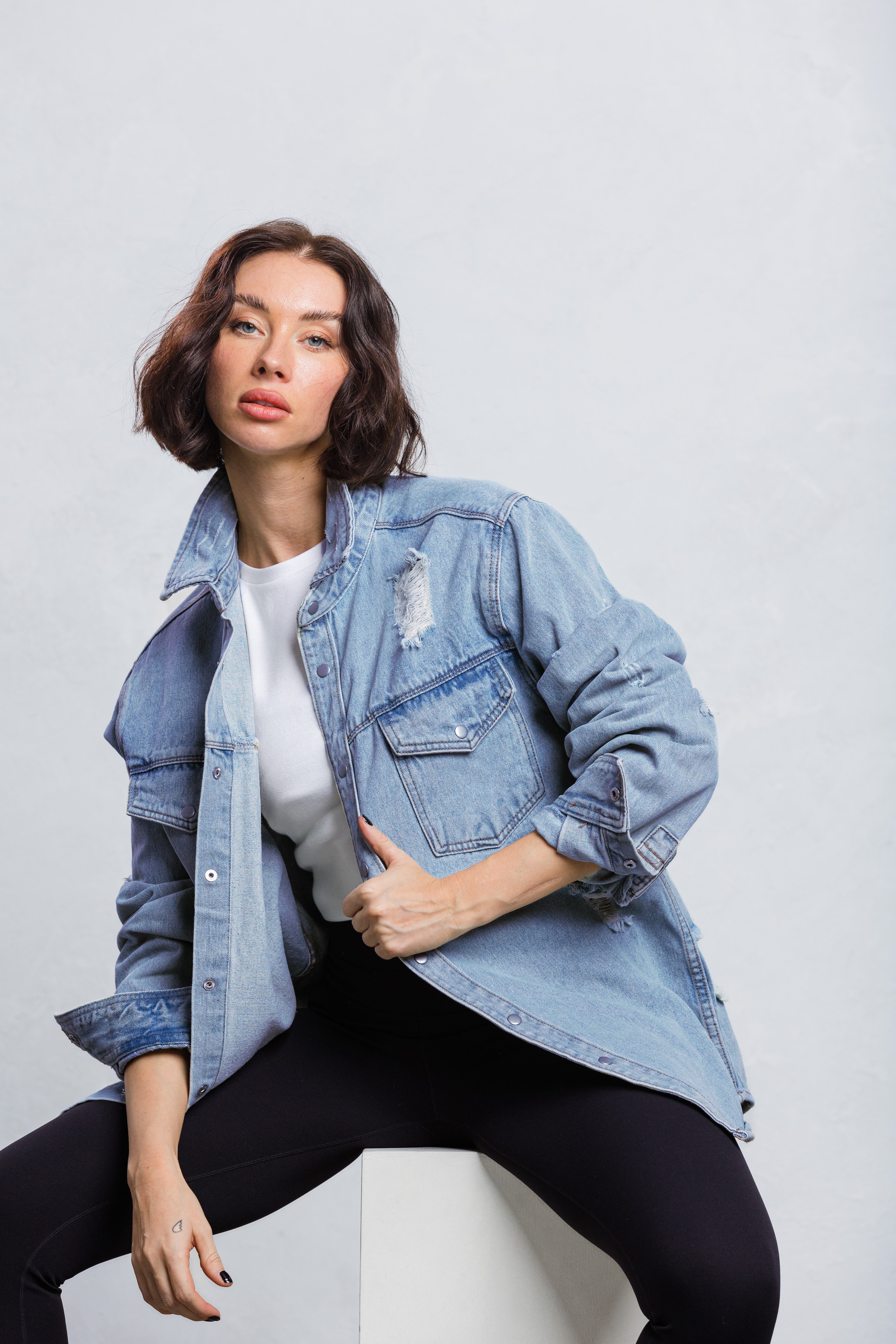 Long Distressed Denim Jacket, crafted distressed hemline,
