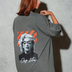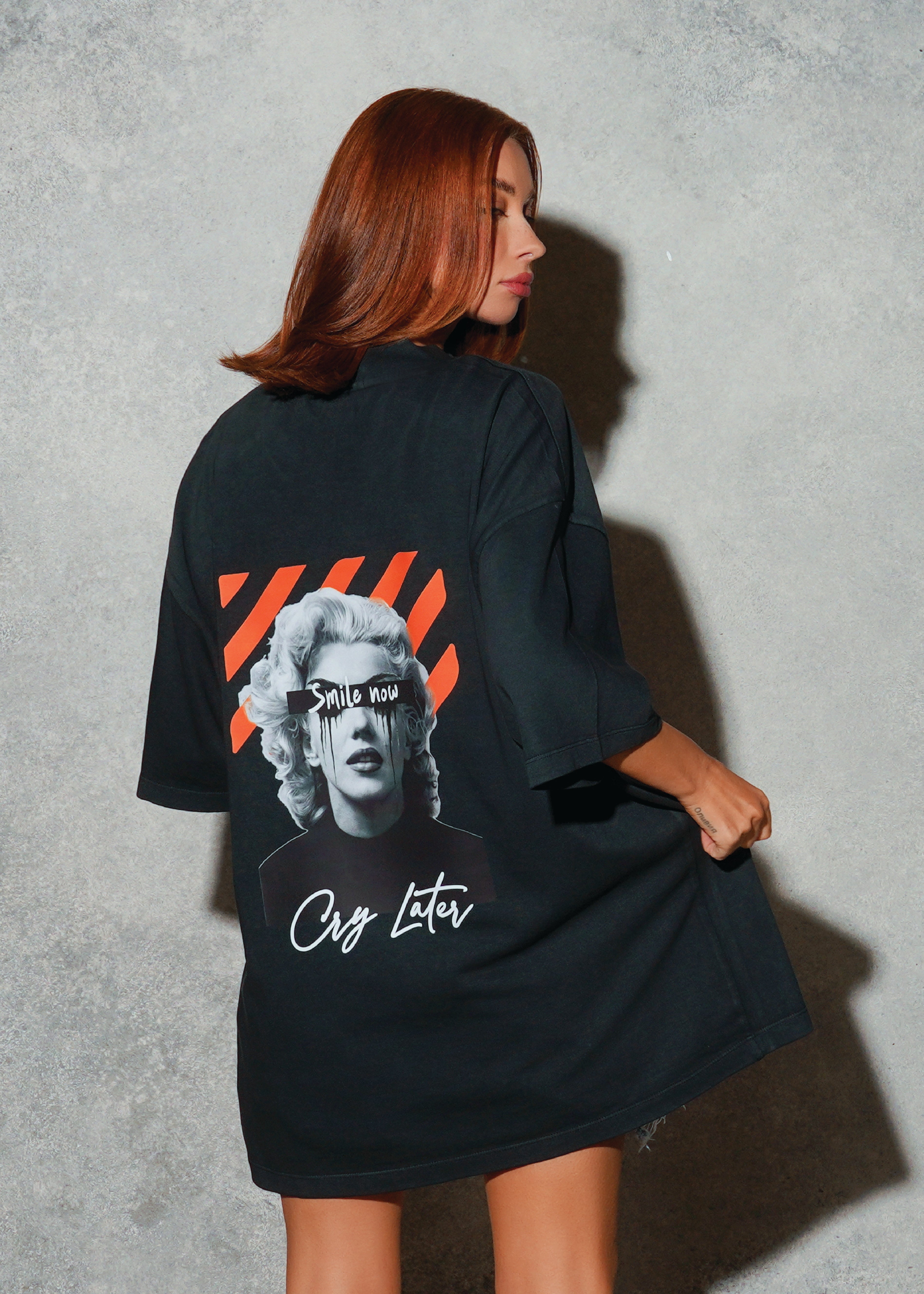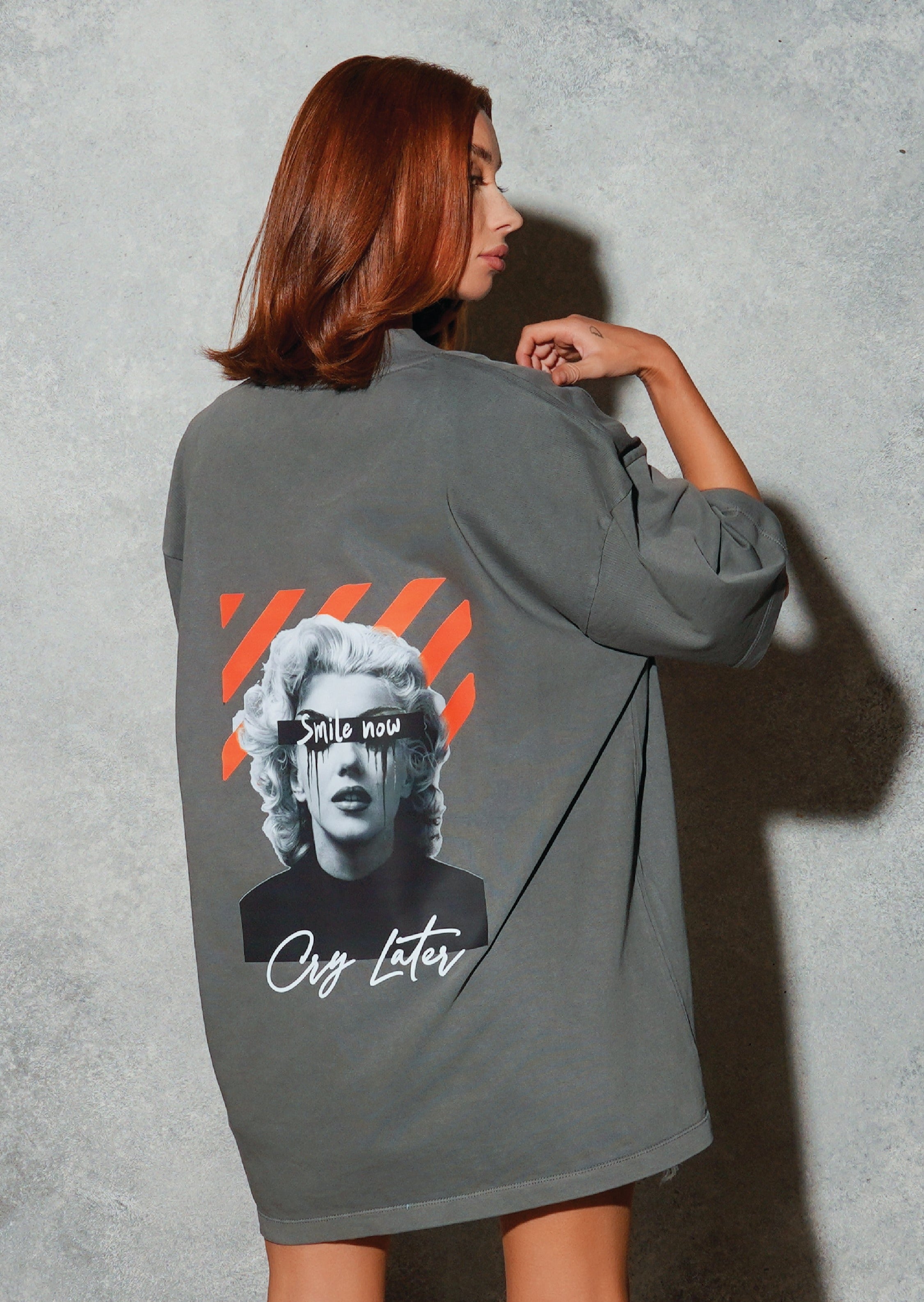 Featuring a "SMILE NOW CRY LATER" saying attributed to Marilyn Monroe typically features contrasting visual elements, such as a smiling and a crying mask or faces, symbolizing the complexity of emotions and the facade often presented to the world versus inner turmoil or sadness.