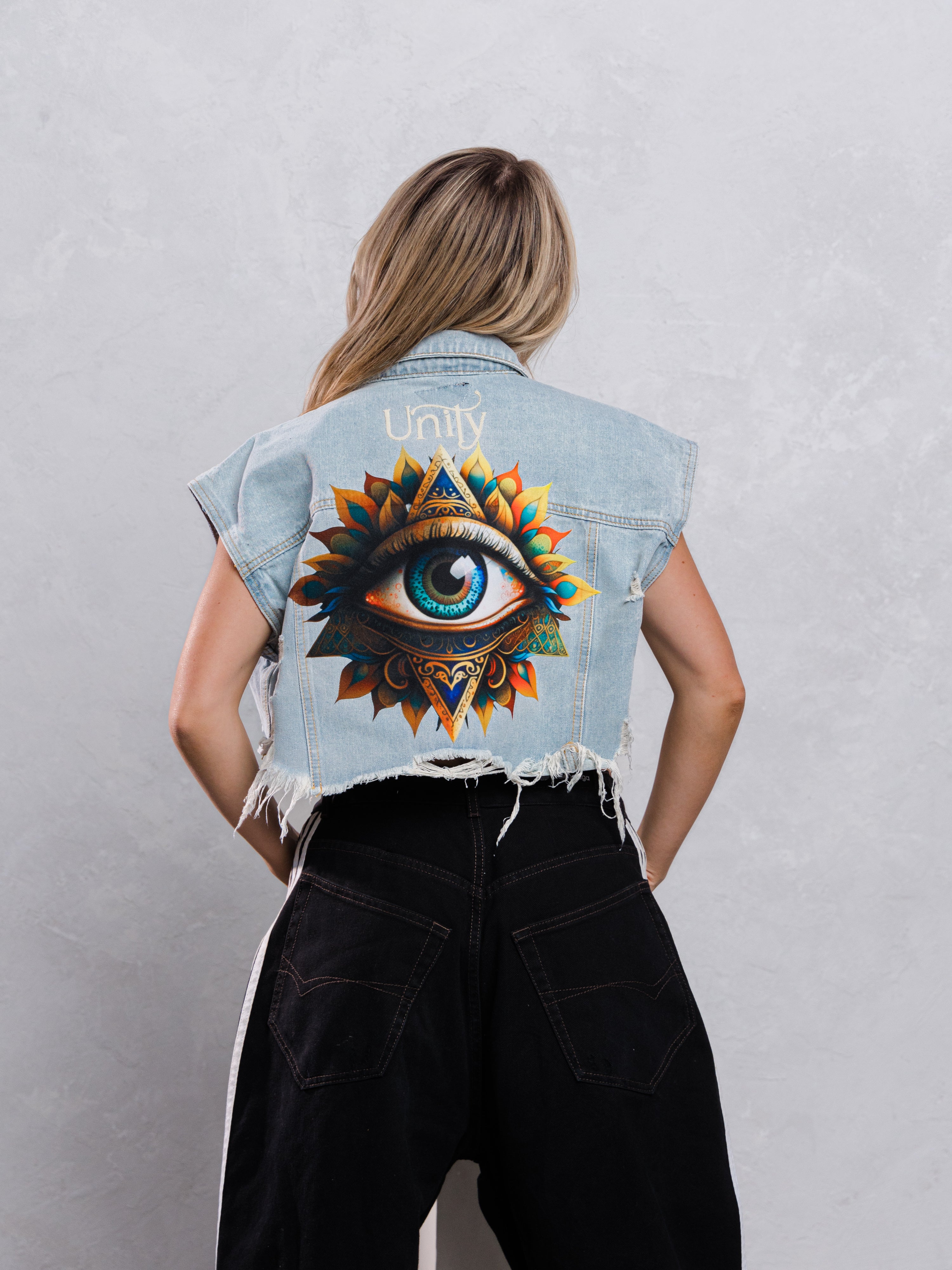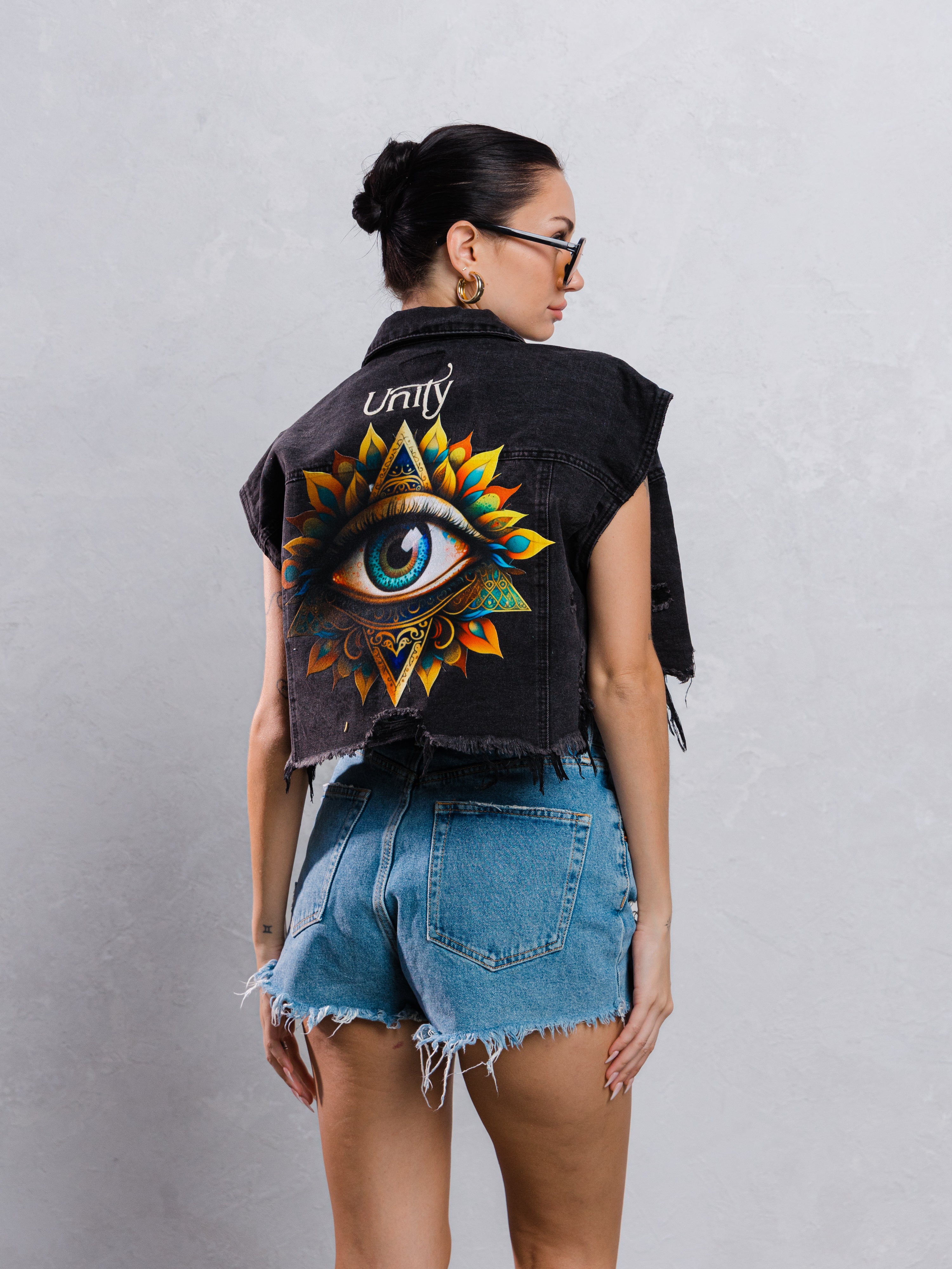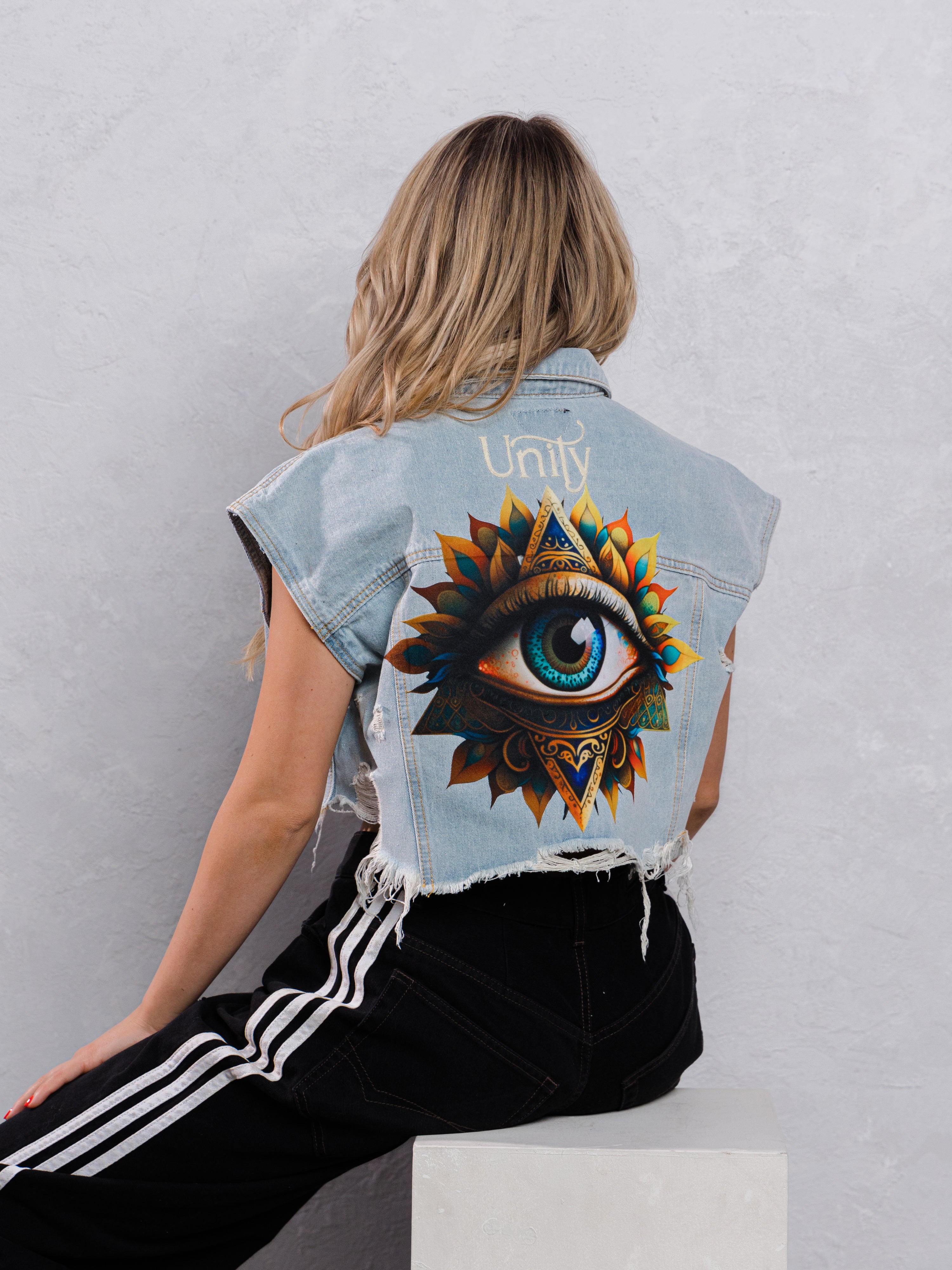 Cropped Distressed Denim Vest Jacket, crafted distressed hemline,